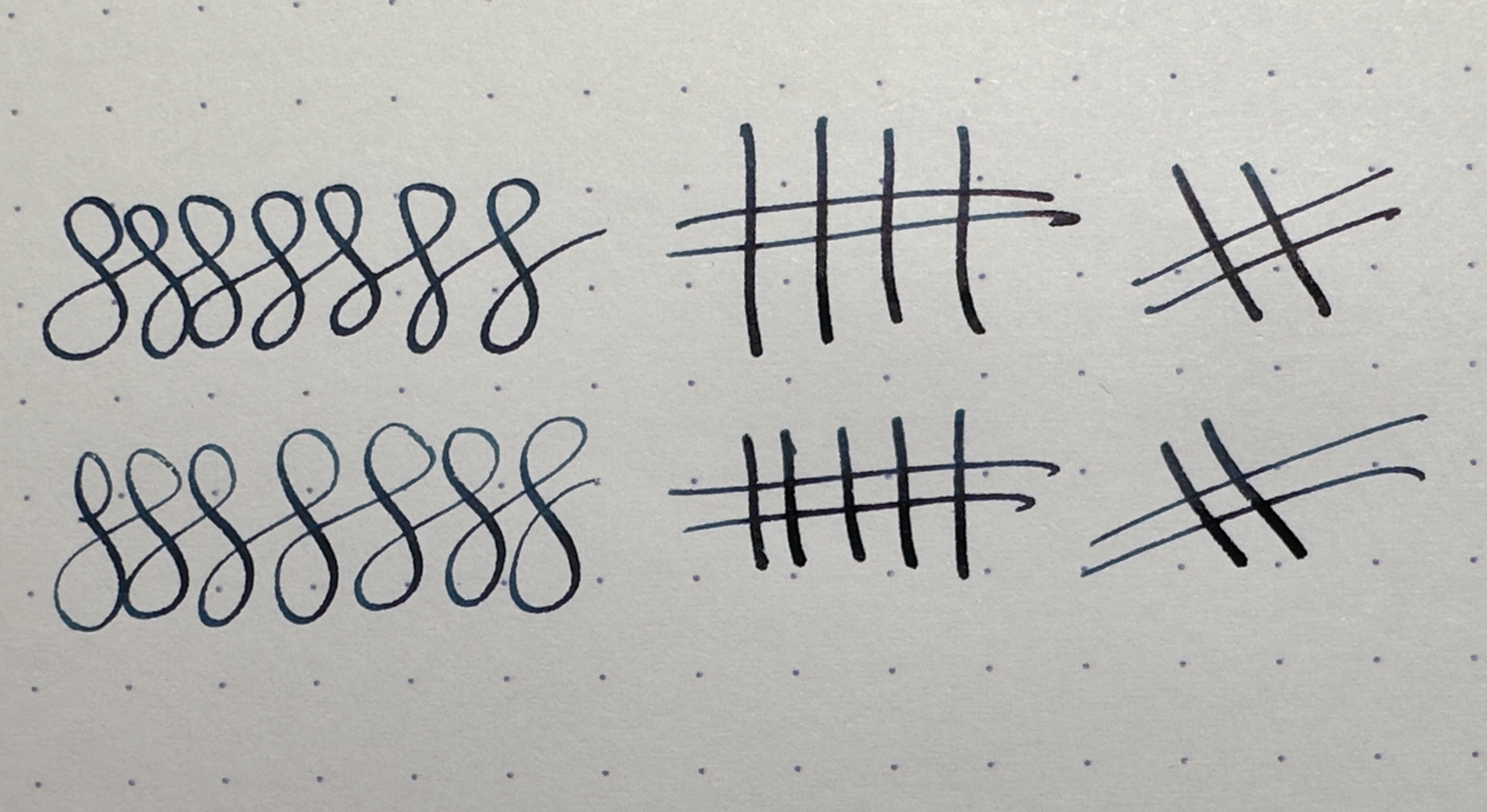 gli 8 della seconda riga mostrano variazione maggiore sia in termini di larghezza tratto che di erogazione inchiostro (e quindi shading). su un pennino F e non elastico, mi sembra un risultato degno di nota (farlo con un 1.1 e' certo piu' agevole)