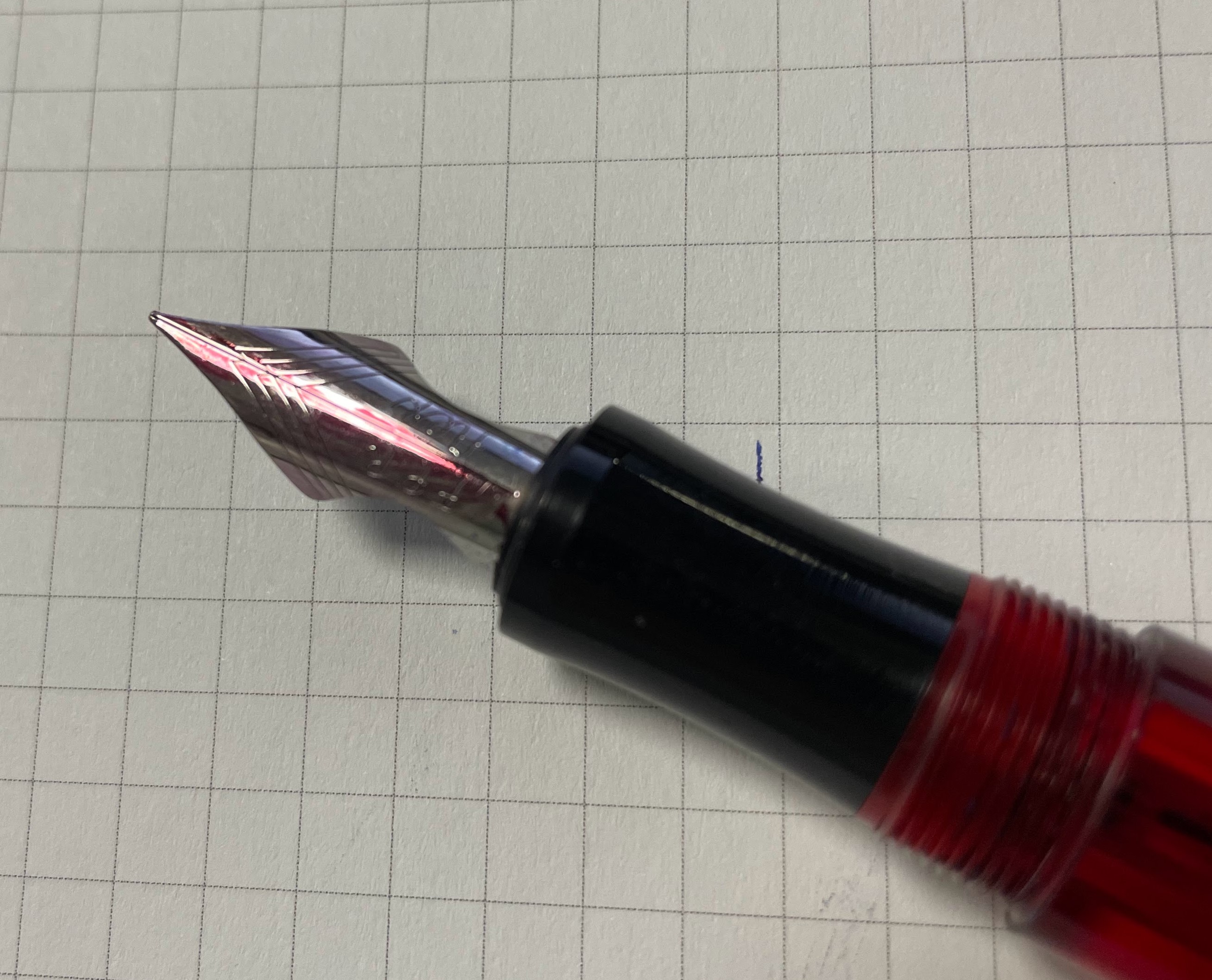 Usandolo si ha una sensazione strana, simile a scrivere con i pennini a intinzione senza esserne capaci. Senza usare peso piuma nella mano, i rebbi si divaricano veramente troppo e smette di scrivere - non sono le classiche rotaie, il pennino si pianta proprio.