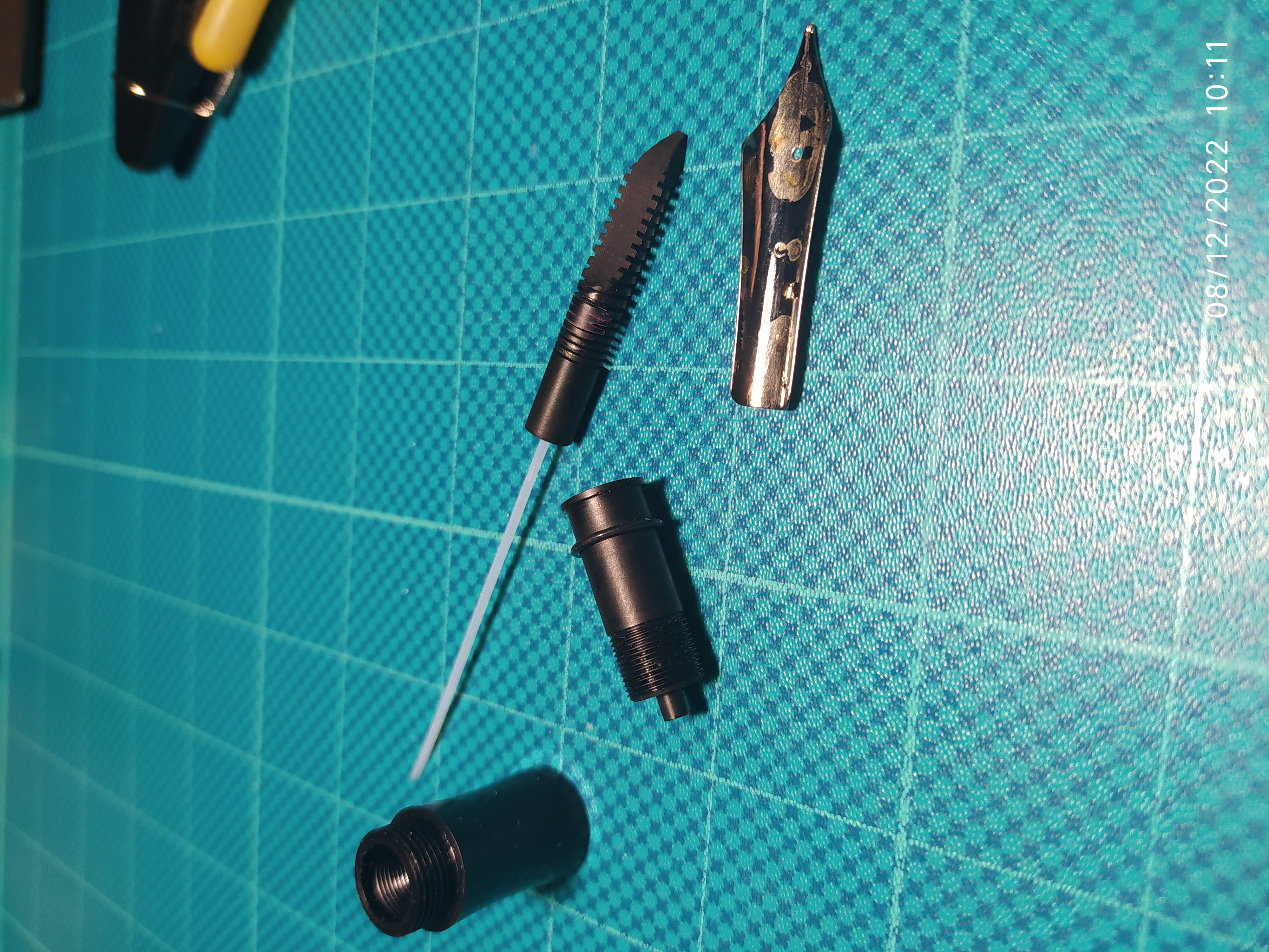 Dalle misurazioni. essendo alla filettatura il diametro di 7,9 mm e la lunghezza del portaconduttore di mm. 22, è assai probabile che nella sezione scrivente si possa avvitare un pennino completo, di portaconduttore e conduttore, Bock 250 . Non ho potuto materialmente effettuare la prova perchè non ho un Bock 250 a disposizione ma ho intenzione di acquistarne per dare un senso a questa penna altrimenti inutilizzata.