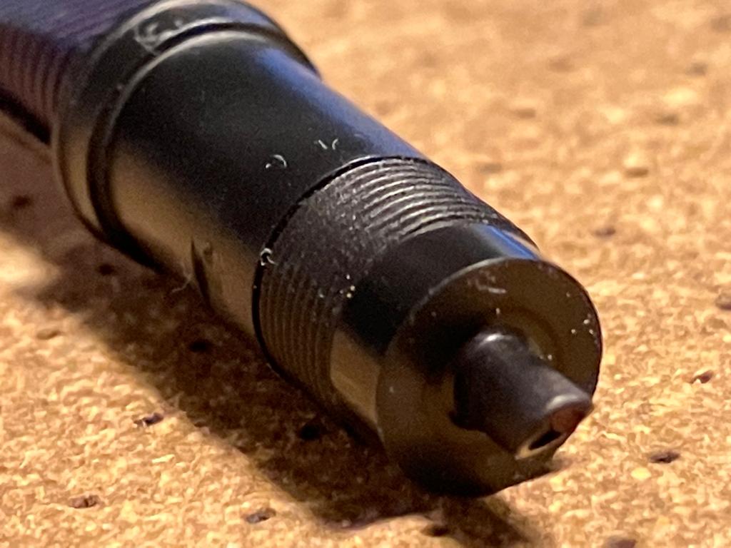 Io avevo richiesto l'intervento in garanzia per due evidenti problemi: ammaloramento della galvanizzazione in rutenio del pennino e l'eccessiva tolleranza del conduttore allinterno della sua sede (roteava liberamente). Bene, cioè male: il pennino non mi è stato cambiato e si può vedere bene come sia ridotto attualmente; per l'eccessiva tolleranza del conduttore non hanno fatto altro che applicare del collante (si possono vedere le tracce in foto) sulle alette che sono la parte che viene inserita nel portaconduttore ! Notevole, veramente ! Vabbè meglio non pensarci ormai, se mi riesce l'innesto con il Bock 250 ne darò notizia per chi interessa .