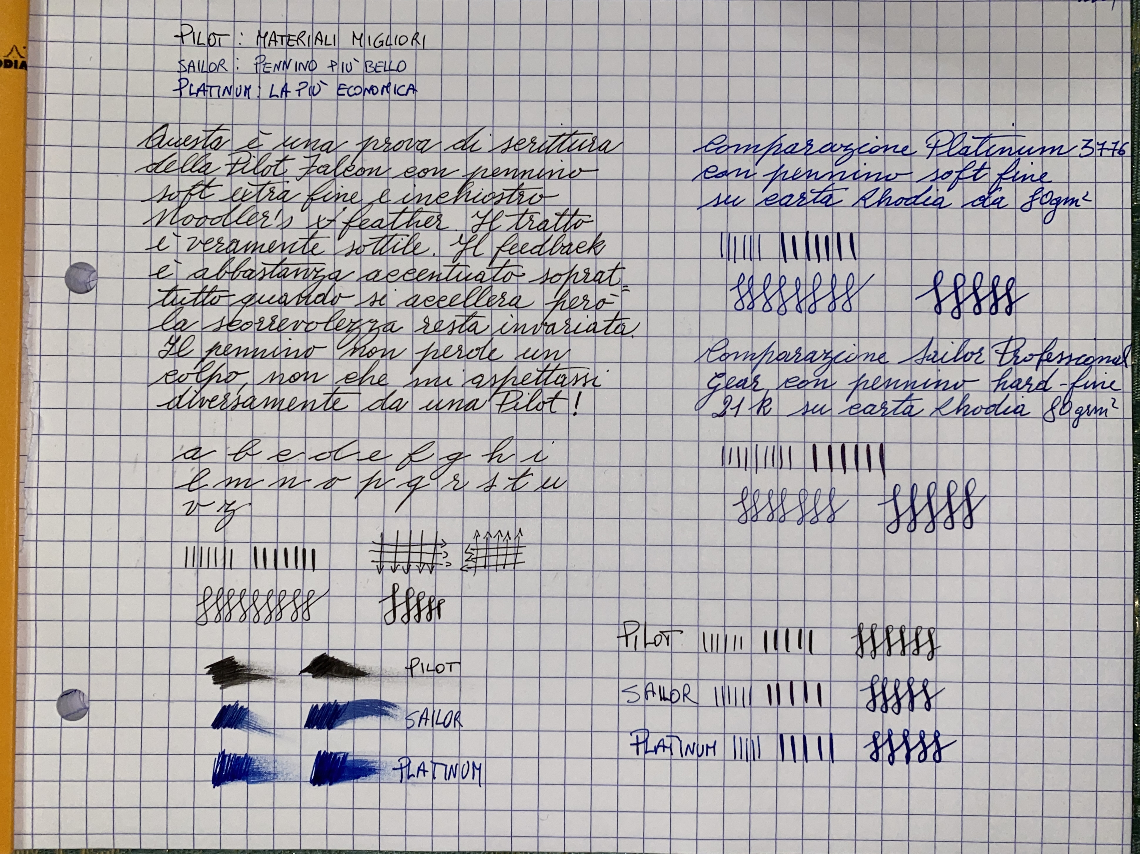Come da titolo allego una piccola prova di scrittura su carta Rhodia della Pilot Falcon con pennino SEF che ho ricevuto oggi e un piccolo confronto con Sailor professional gear pennino 21k hard fine e platinum 3776 con pennino SF