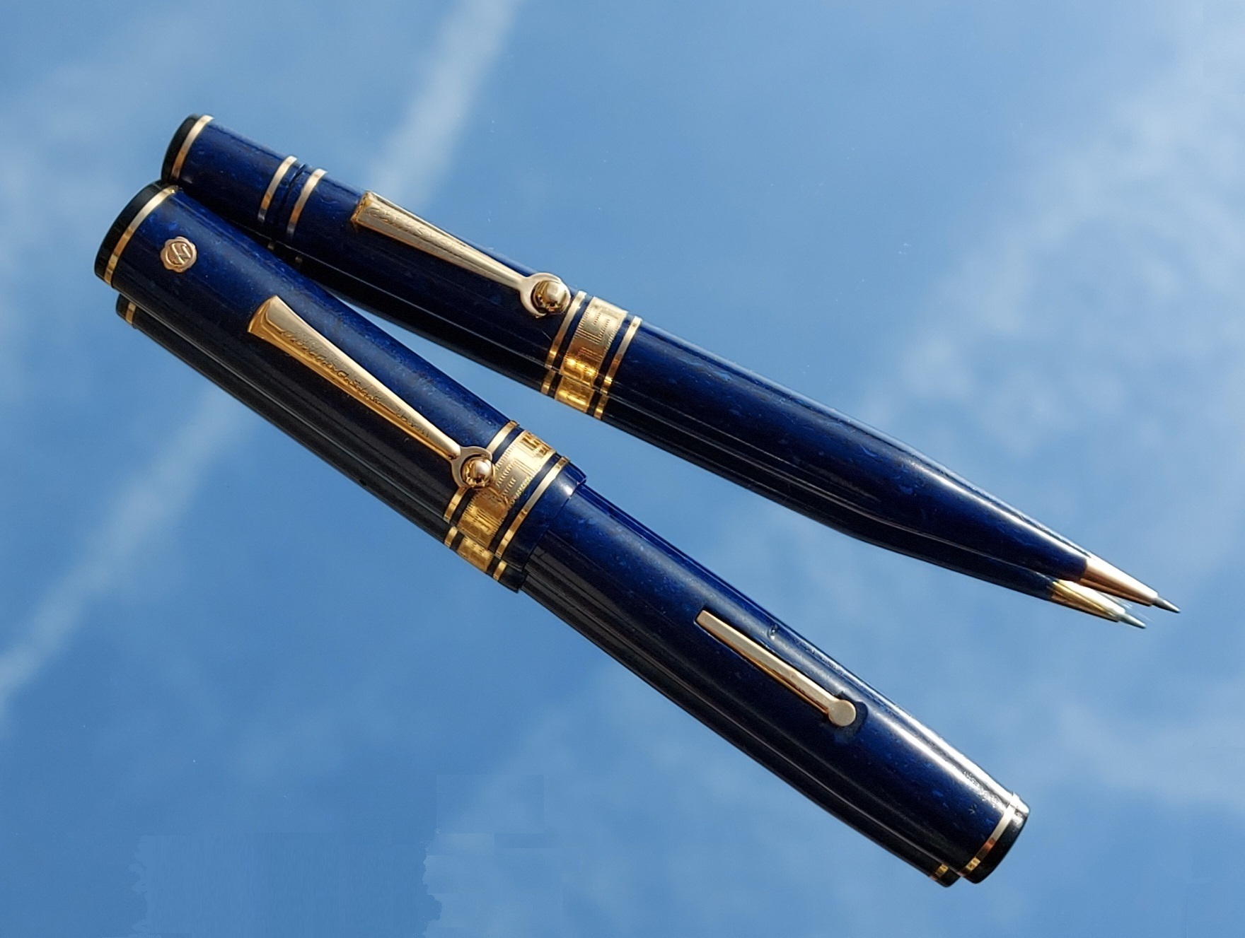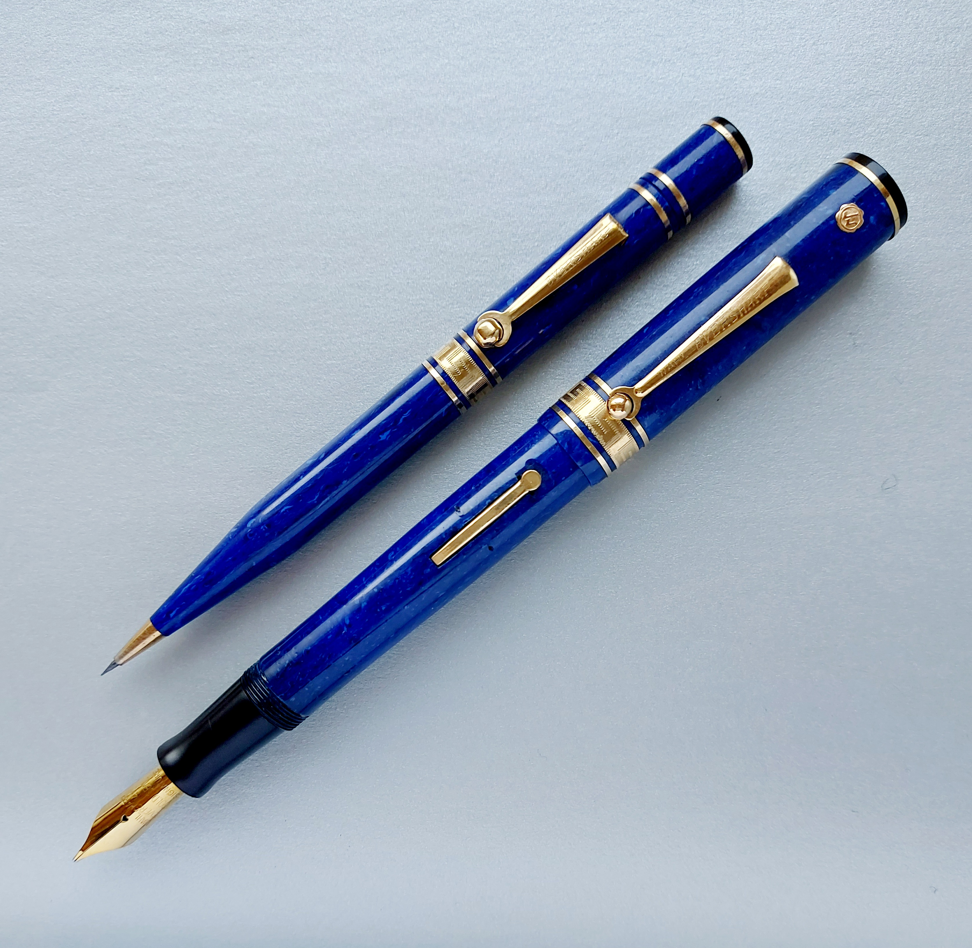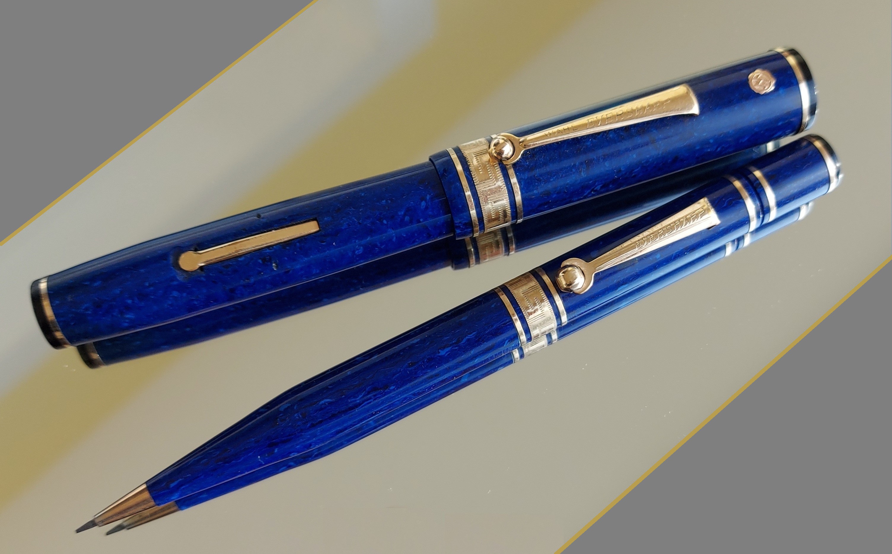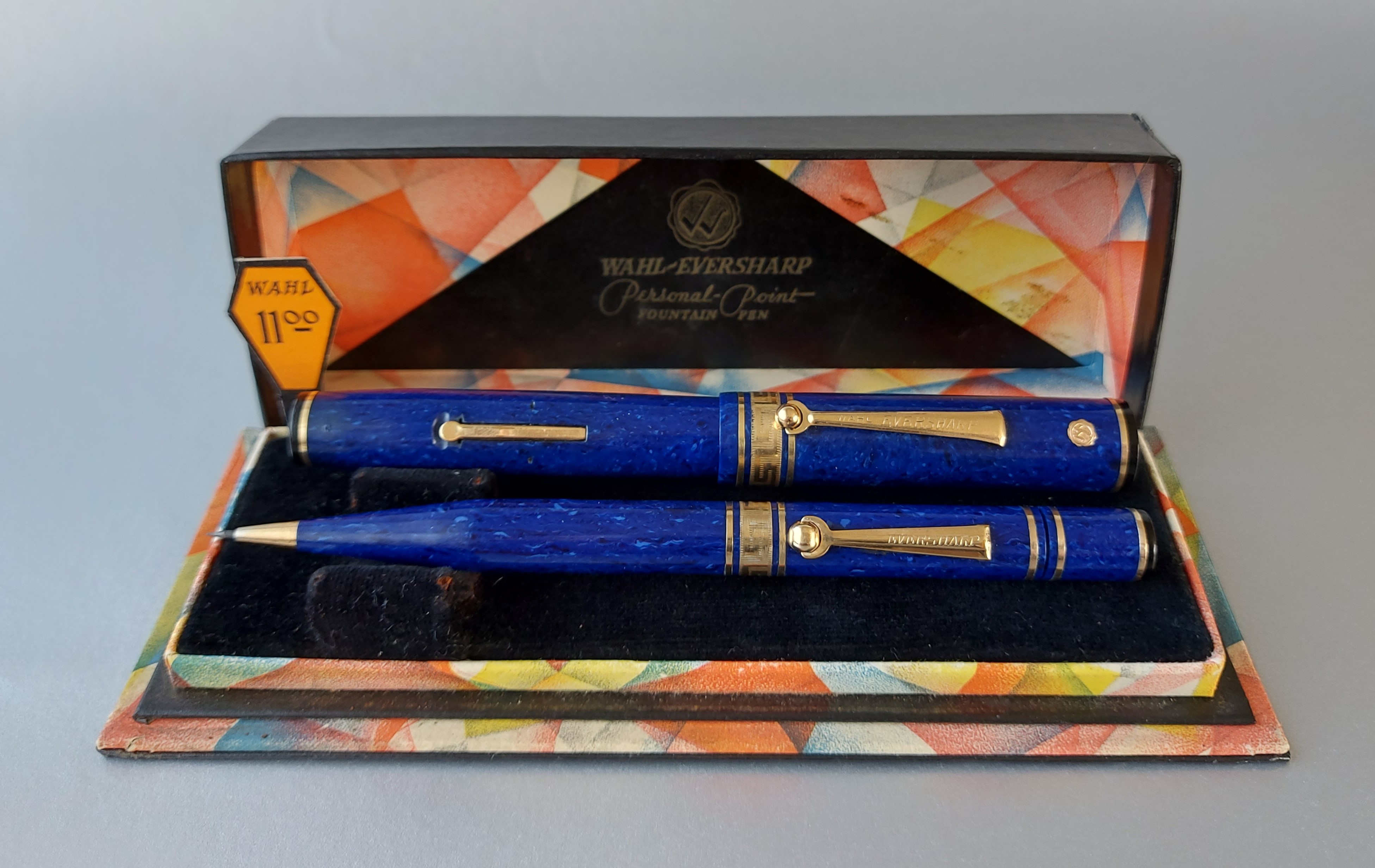 Il set WAHL-EVERSHARP PERSONAL POINT “DECO BAND” COMBINATION SET nel colore LAZULITIC BLUE [Fountain pen No. 8611C ⎯ Pencil No. 4211C] IN BOX, in celluloide tornita dal pieno, con estremità in celluloide nera, parti metalliche a vista laminate oro; la stilografica con cappuccio a vite, pennino Wahl-Eversharp in oro 14 carati, caricamento a levetta; la matita meccanica con funzione “propel” impiega mine da 1.1 mm. Produzione U.S.A., anno 1928-1929.