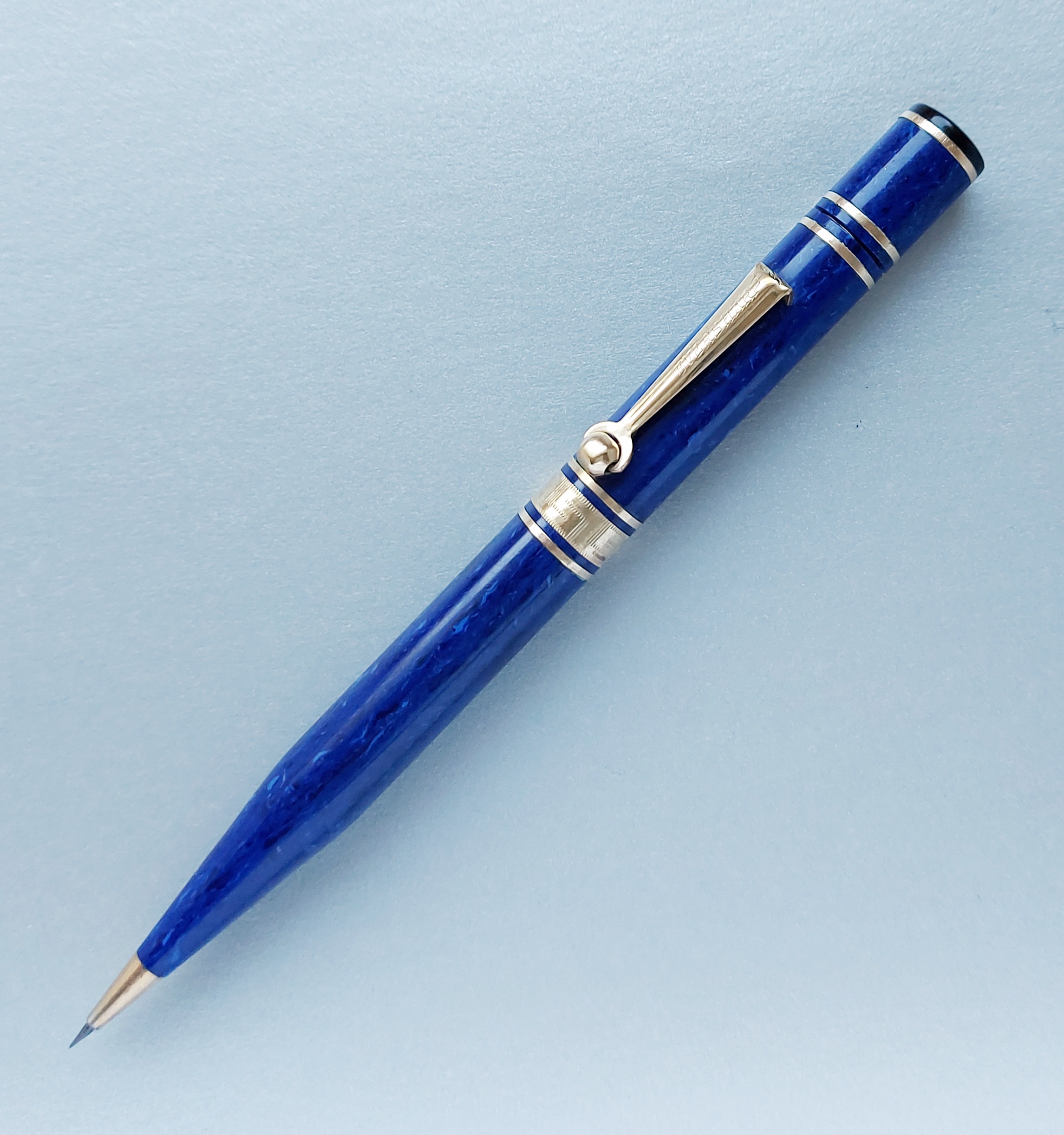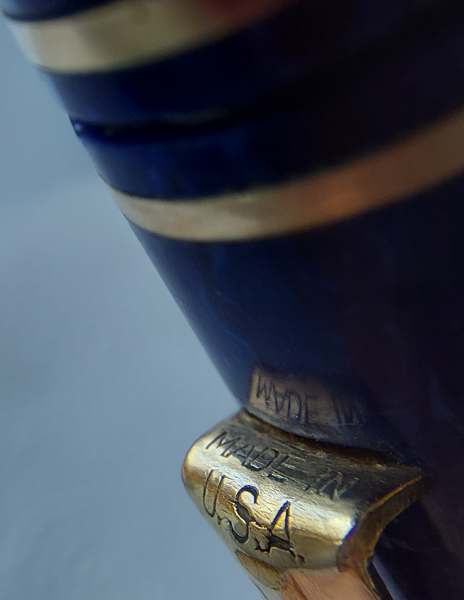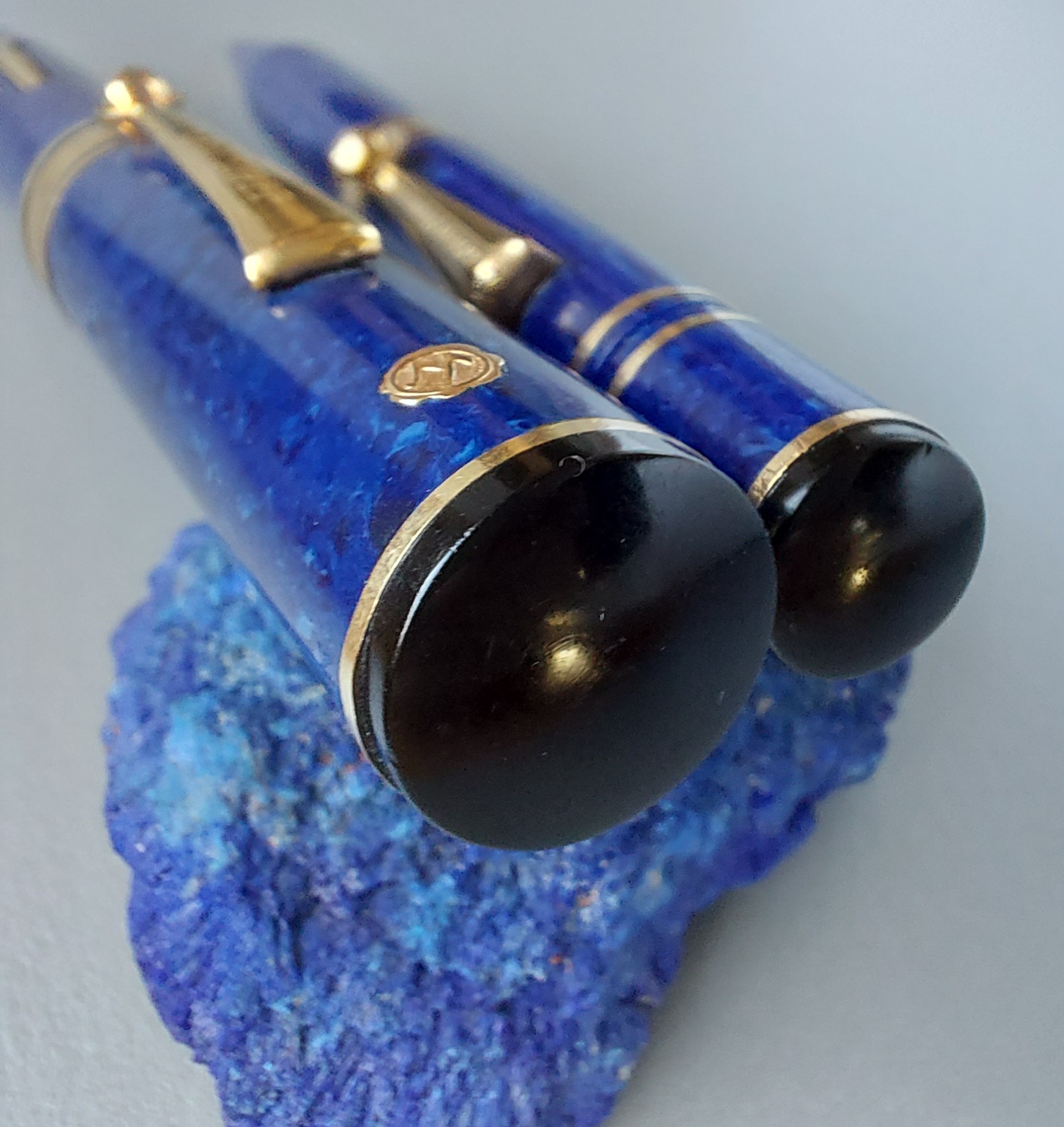Il set WAHL-EVERSHARP PERSONAL POINT “DECO BAND” COMBINATION SET nel colore LAZULITIC BLUE [Fountain pen No. 8611C ⎯ Pencil No. 4211C] IN BOX, in celluloide tornita dal pieno, con estremità in celluloide nera, parti metalliche a vista laminate oro; la stilografica con cappuccio a vite, pennino Wahl-Eversharp in oro 14 carati, caricamento a levetta; la matita meccanica con funzione “propel” impiega mine da 1.1 mm. Produzione U.S.A., anno 1928-1929.