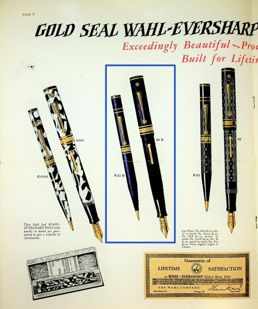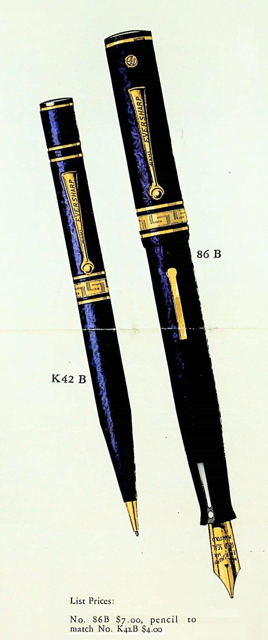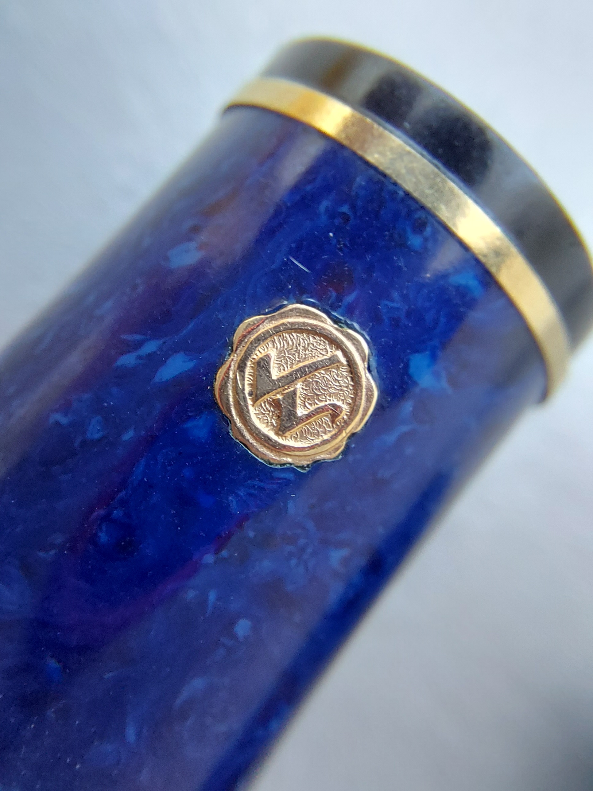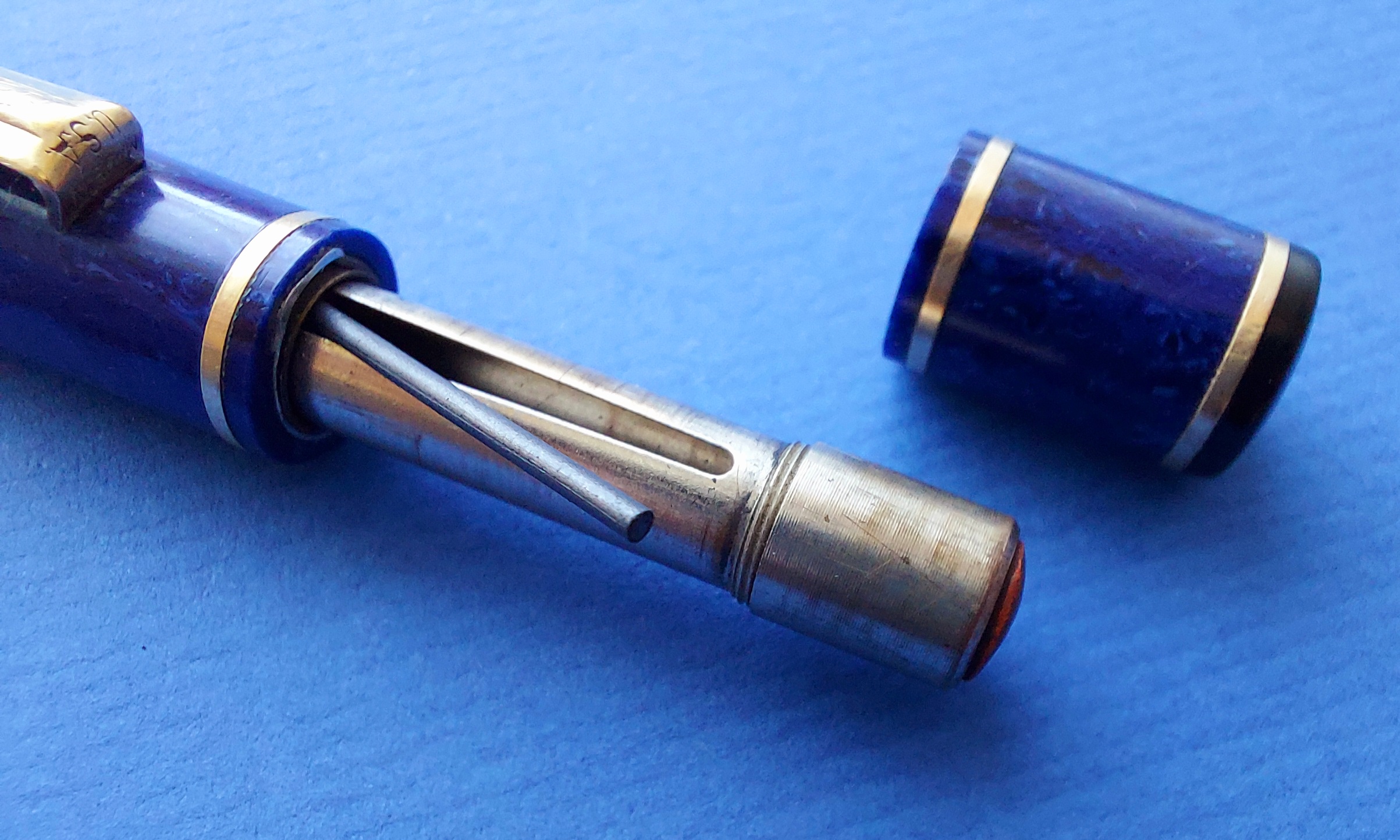 Il set WAHL-EVERSHARP PERSONAL POINT “DECO BAND” COMBINATION SET nel colore LAZULITIC BLUE [Fountain pen No. 8611C ⎯ Pencil No. 4211C] IN BOX, in celluloide tornita dal pieno, con estremità in celluloide nera, parti metalliche a vista laminate oro; la stilografica con cappuccio a vite, pennino Wahl-Eversharp in oro 14 carati, caricamento a levetta; la matita meccanica con funzione “propel” impiega mine da 1.1 mm. Produzione U.S.A., anno 1928-1929.