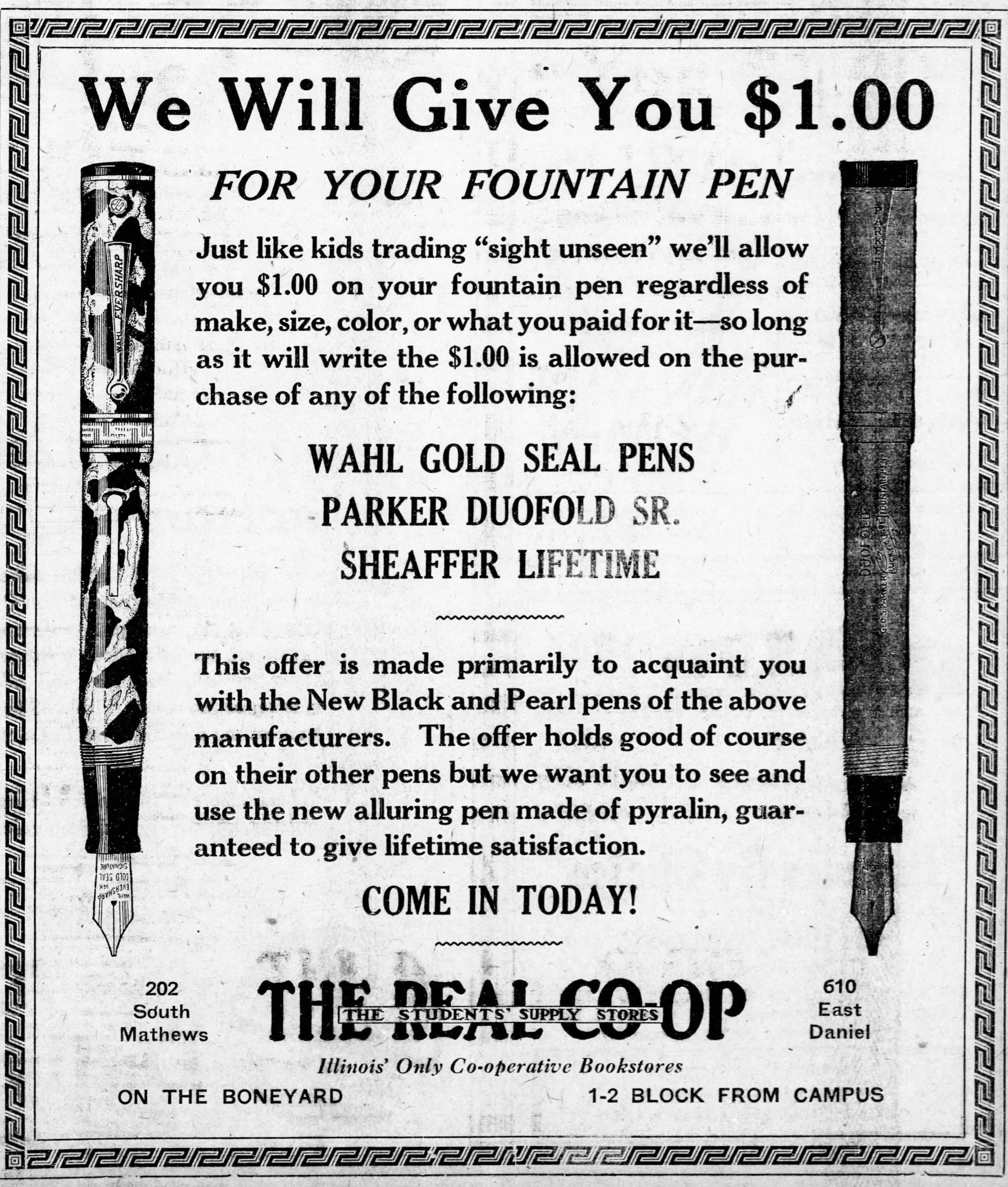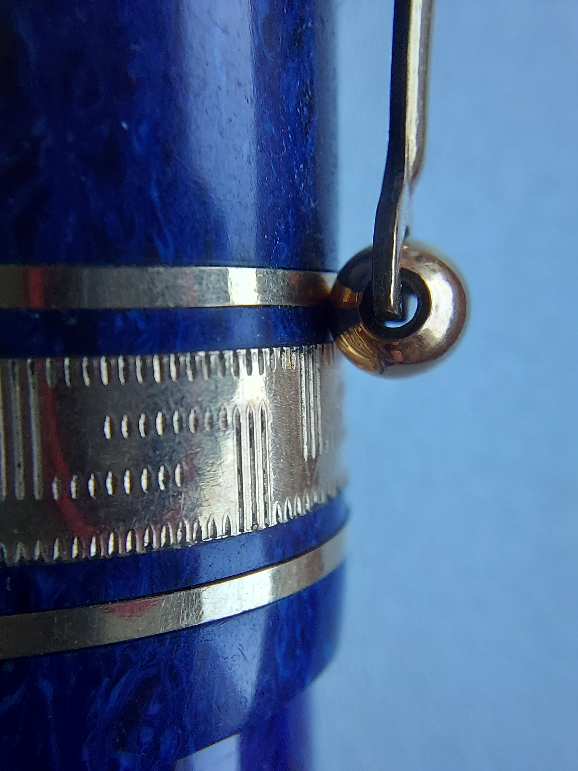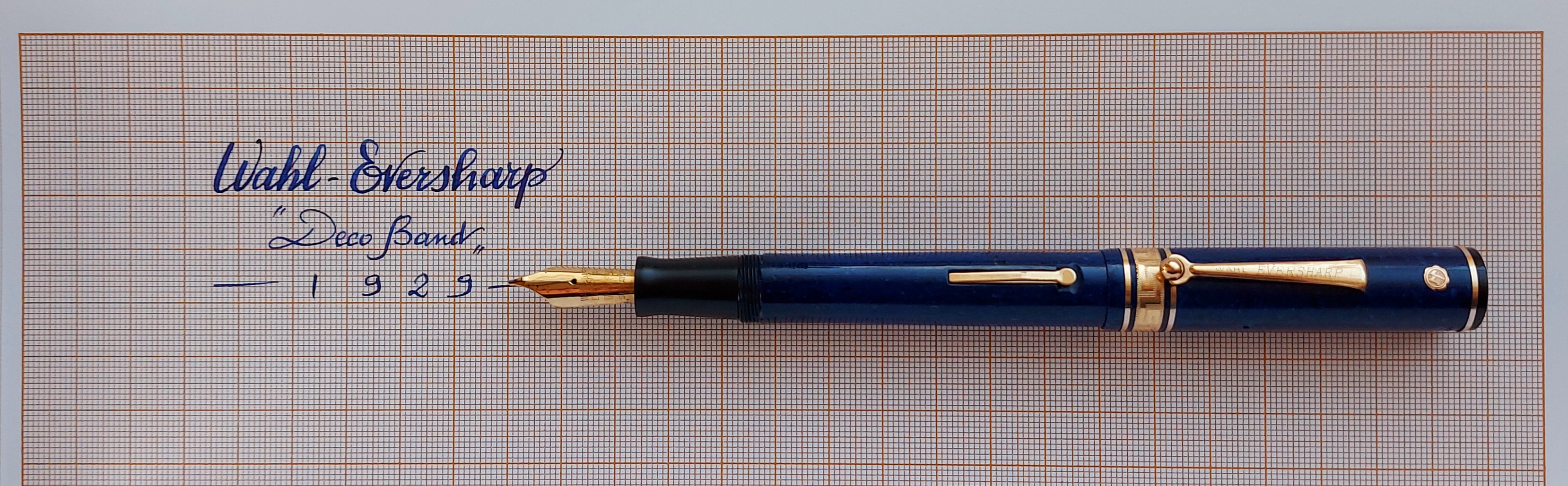 Non avrei aperto un argomento ad hoc per recensire una penna che comunque avevo già mostrato diverse volte (anche per presentare delle pubblicità)… Inoltre, questo modello (che i collezionisti hanno battezzato “Deco Band” in assenza di una denominazione commerciale specifica del Produttore) è stato commentato ovunque, da decenni, ad abundantiam: il nostro formidabile Wiki già riporta una completa introduzione alla linea, incardinata nella presentazione della Marca, ad opera di Simone Piccardi