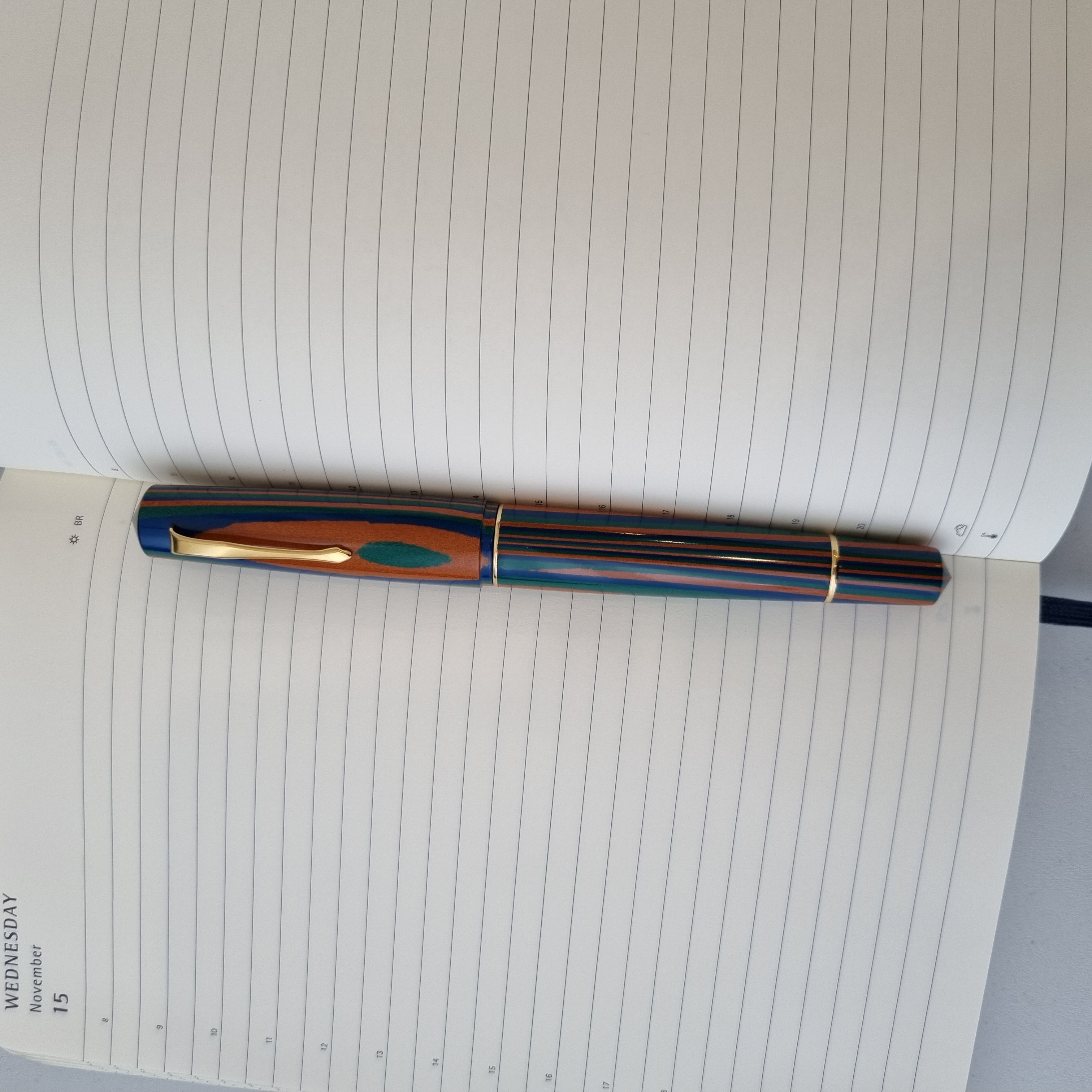 Bella la forma della penna e sicuramente l'ebanite e la sua sensazione tattile. La livrea non mi convince, mi ricorda gli "esperimenti" che facevo da piccolo con la plastilina. Mi piace la clip vintageggiante. Complimenti per l'acquisto. Io non so scrivere così nitido con un broad, sono più un tipo da fine o extrafine