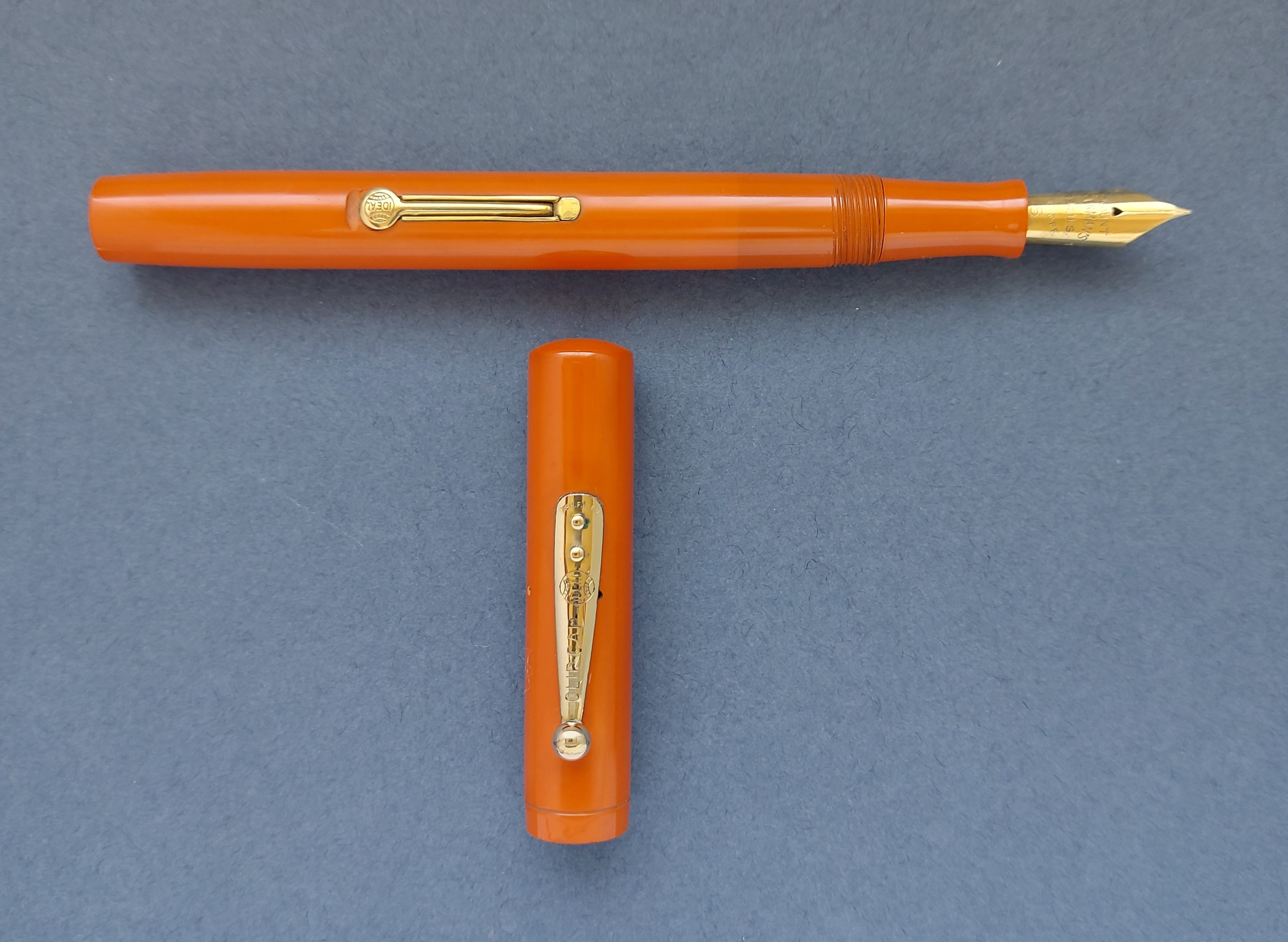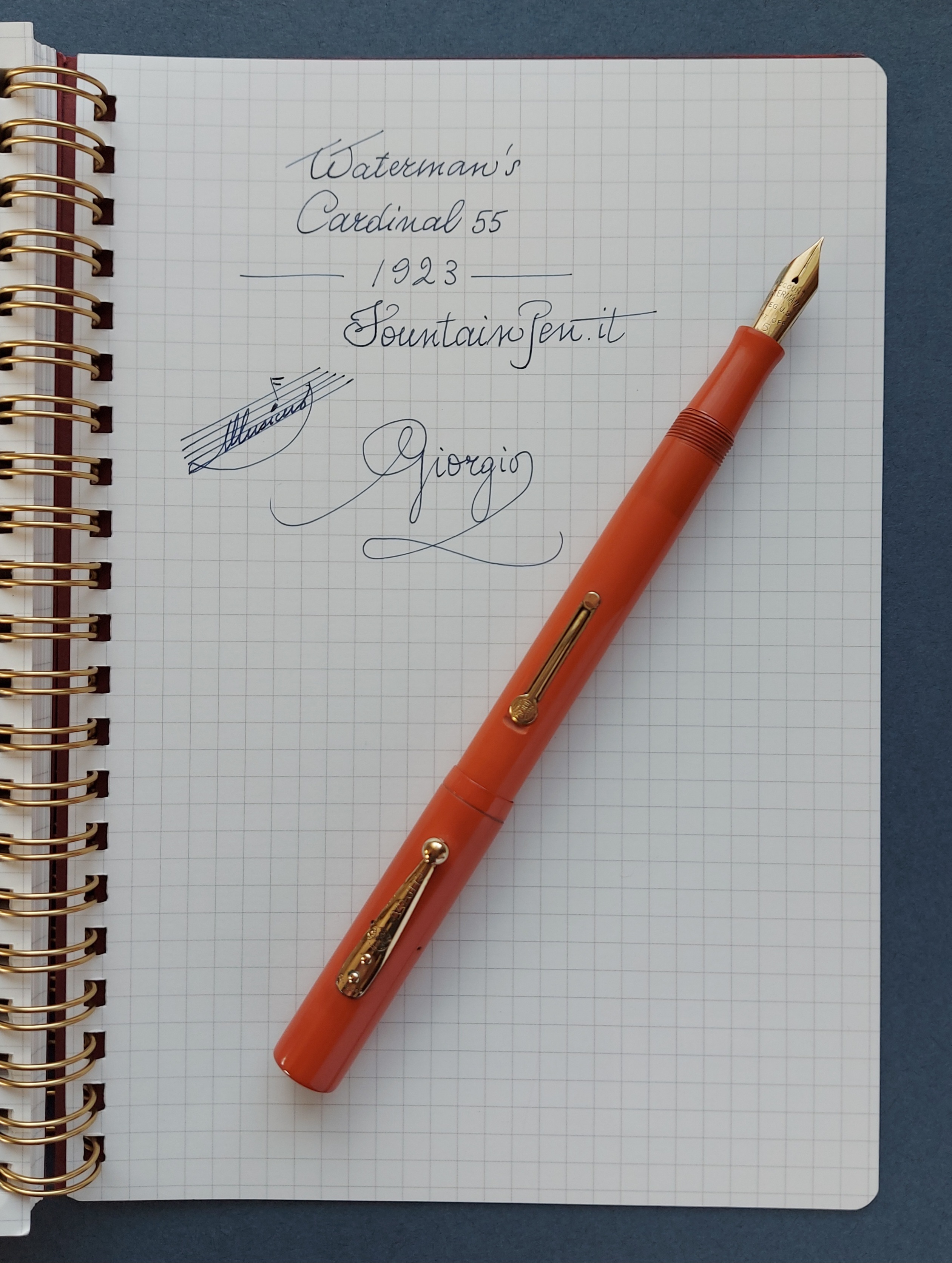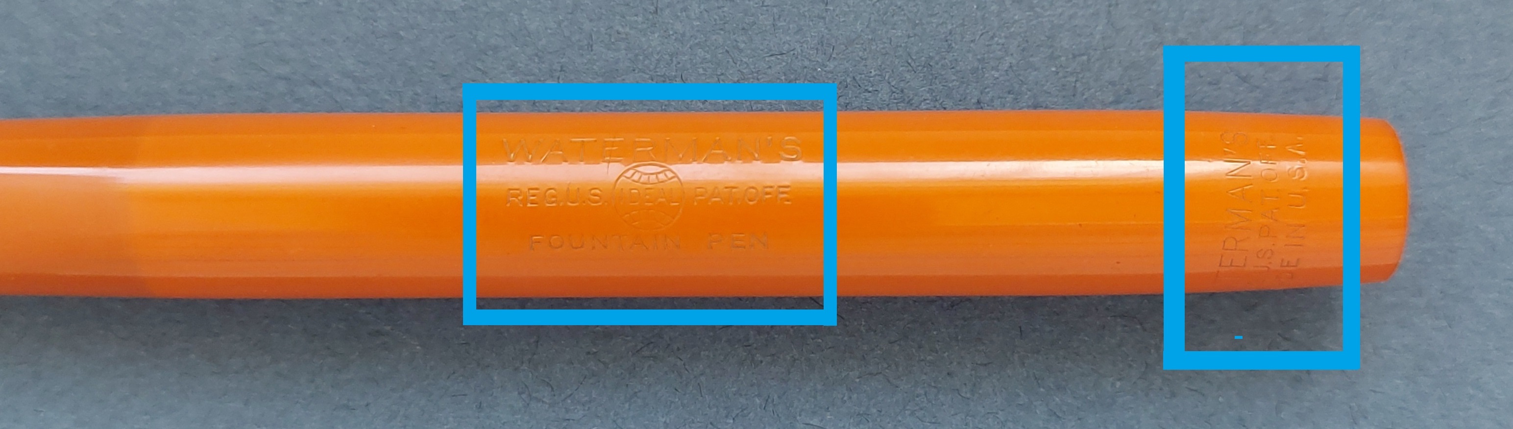 Nelle pubblicità Waterman’s si parla anche solo di colore “red” (che fosse ebanite era scontato, non essendo ancora giunto il tempo della celluloide che segnò nel giro di un lustro la fine della gomma vulcanizzata/hard rubber): in realtà, si tratta di un arancione!