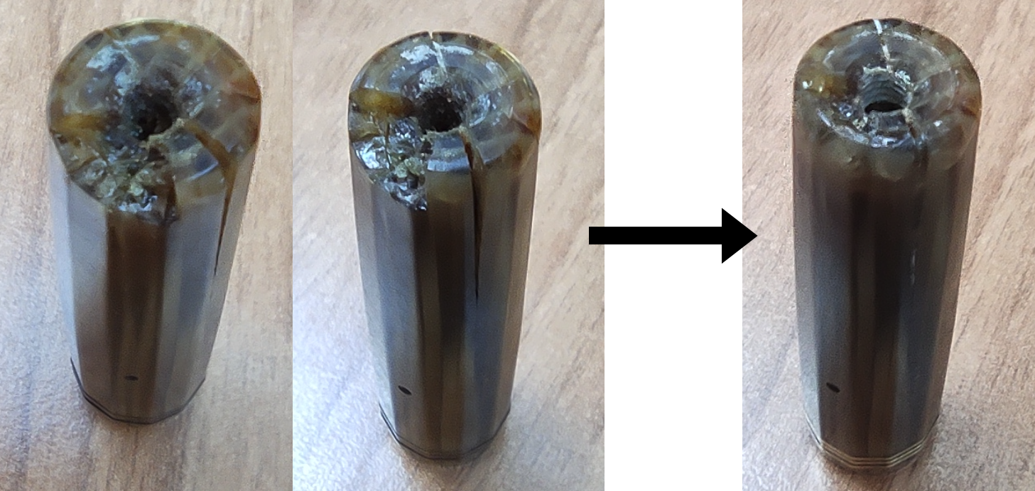 Raccolti i frammenti più grandi ed utilizzabili per l'operazione di riassemblaggio, ho provveduto ad incollarli con un collante bicomponente, riempiendo anche gli spazi delle fessurazioni e l'interno della sommità al fine di rafforzare il tutto.