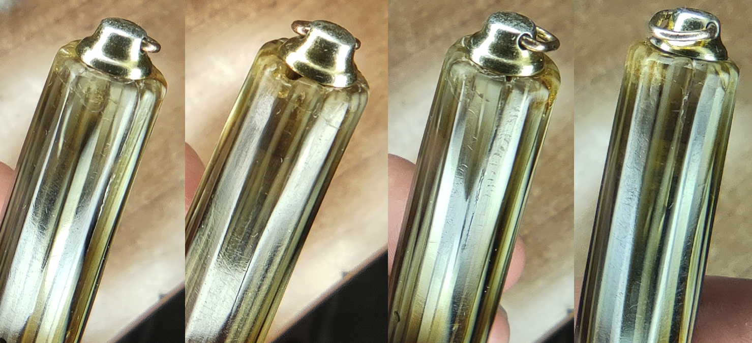 La sommità del cappuccio presentava delle piccole crepe dovute alla cristallizzazione della celluloide, e due fessure più o meno ampie longitudinali al cappuccio, fortunatamente non troppo lunghe.