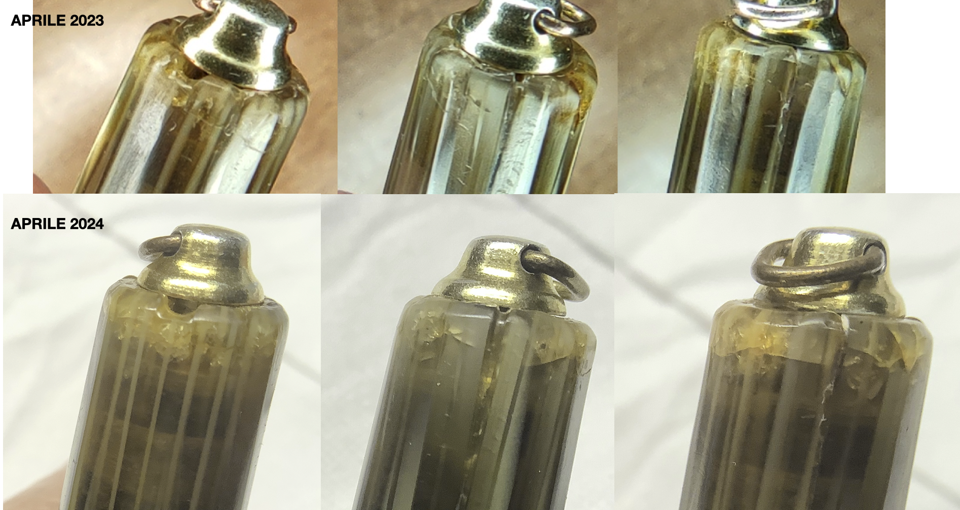 Da una delle foto noterete la mancanza di una piccola porzione di materiale subito a ridosso del ciondolo : visto le dimensioni, avrei potuto utilizzare la resina per chiudere il foro, ma ho preferito lasciarlo così per consentire una migliore circolazione d'aria all'interno per la rimozione di eventuali vapori acidi generati dalla degradazione della celluloide (in ogni caso non mi reca fastidio nel vederlo , e l'interno è di fatto l'intercapedine tra la sommità del cappuccio e il controcappuccio, quindi non c'è pericolo di far seccare l'inchiostro del pennino).