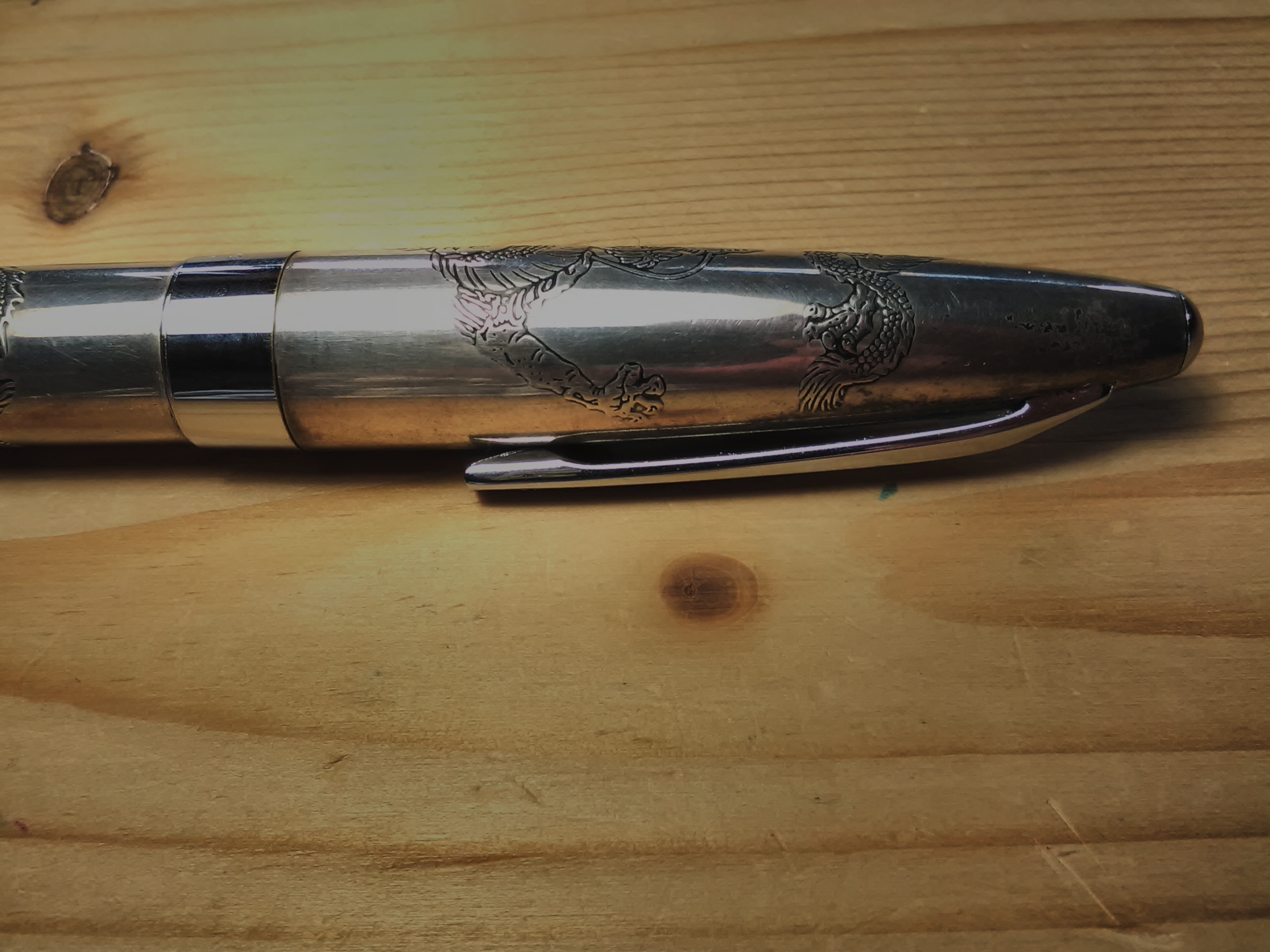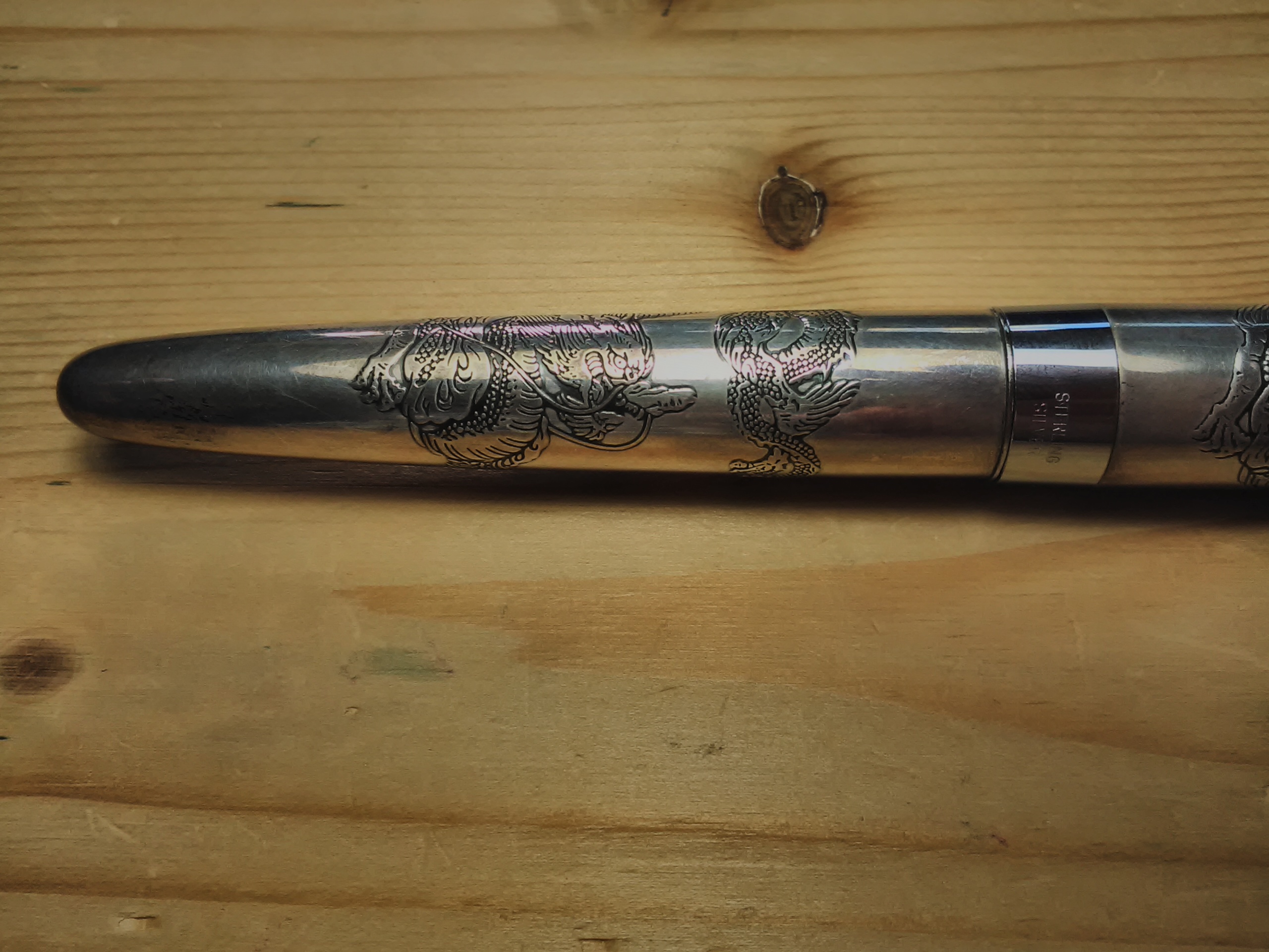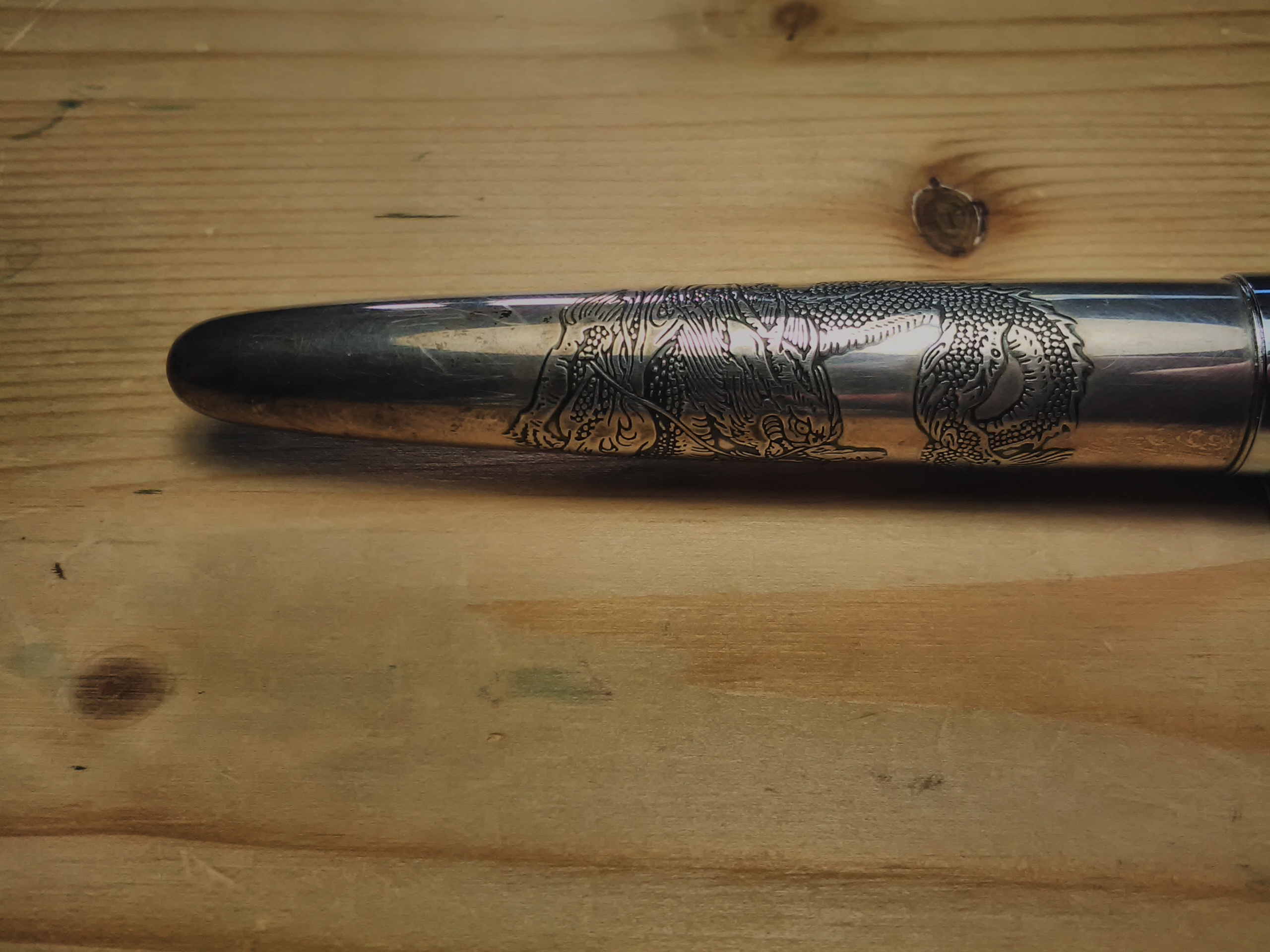 La penna è una Pilot della prima serie Argento con raffigurati diversi animali, questa è con il drago, corpo e cappuccio in argento, sezione pennino in plastica, peso con cappuccio e cartuccia g 27,9, senza cappuccio 14,70 g, è sufficiente lunga da poterla usare senza cappuccio.
