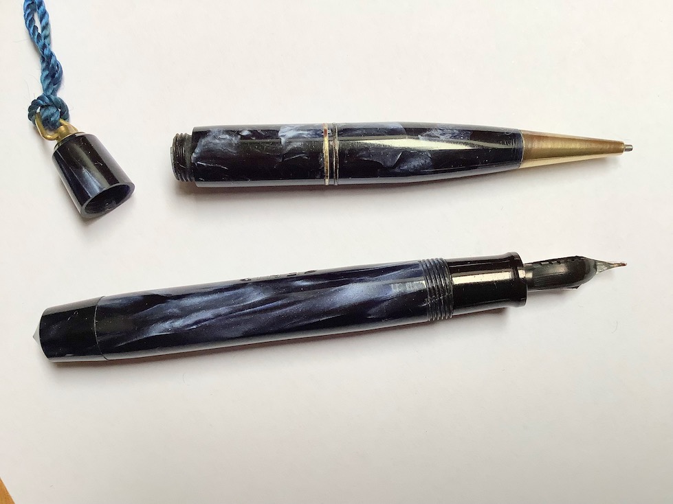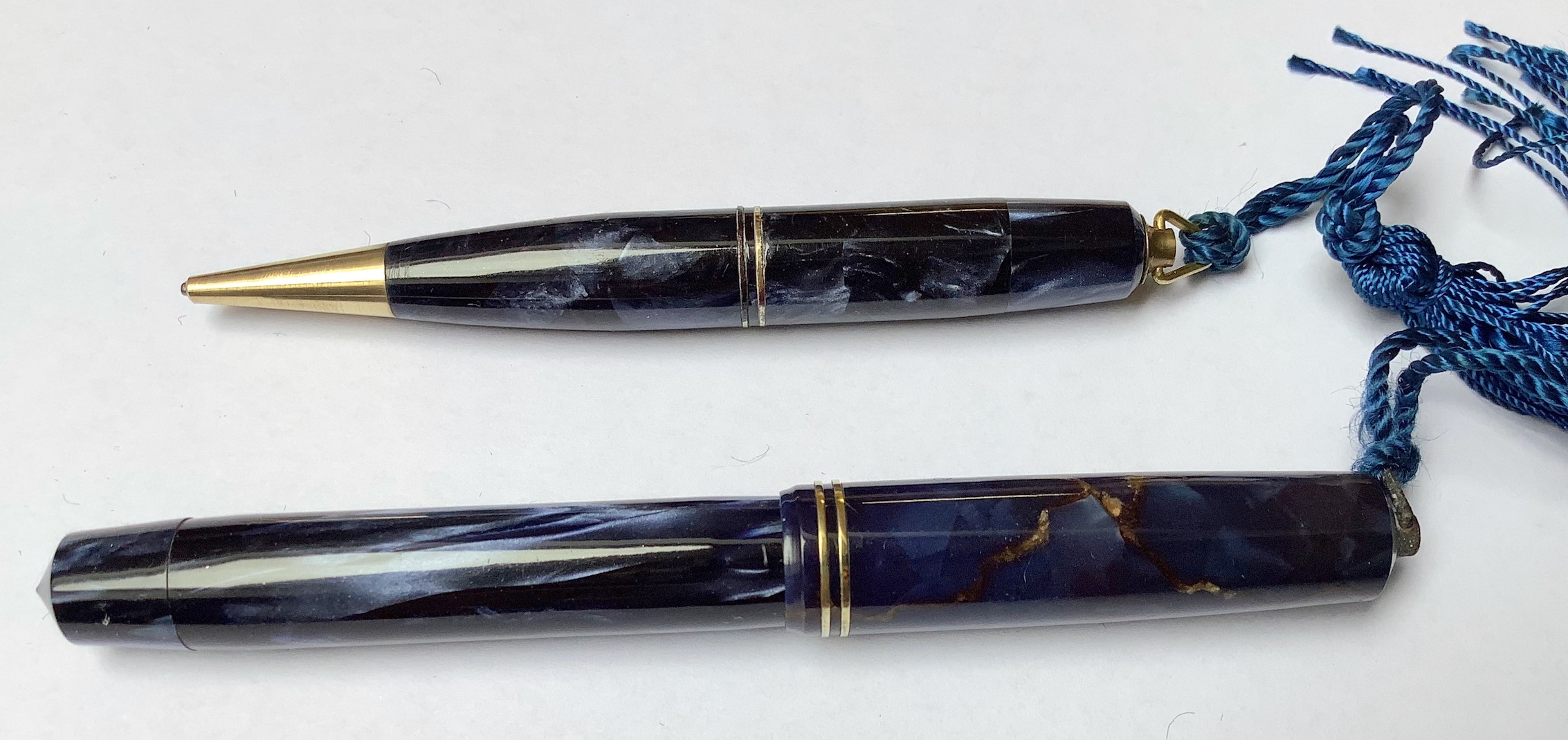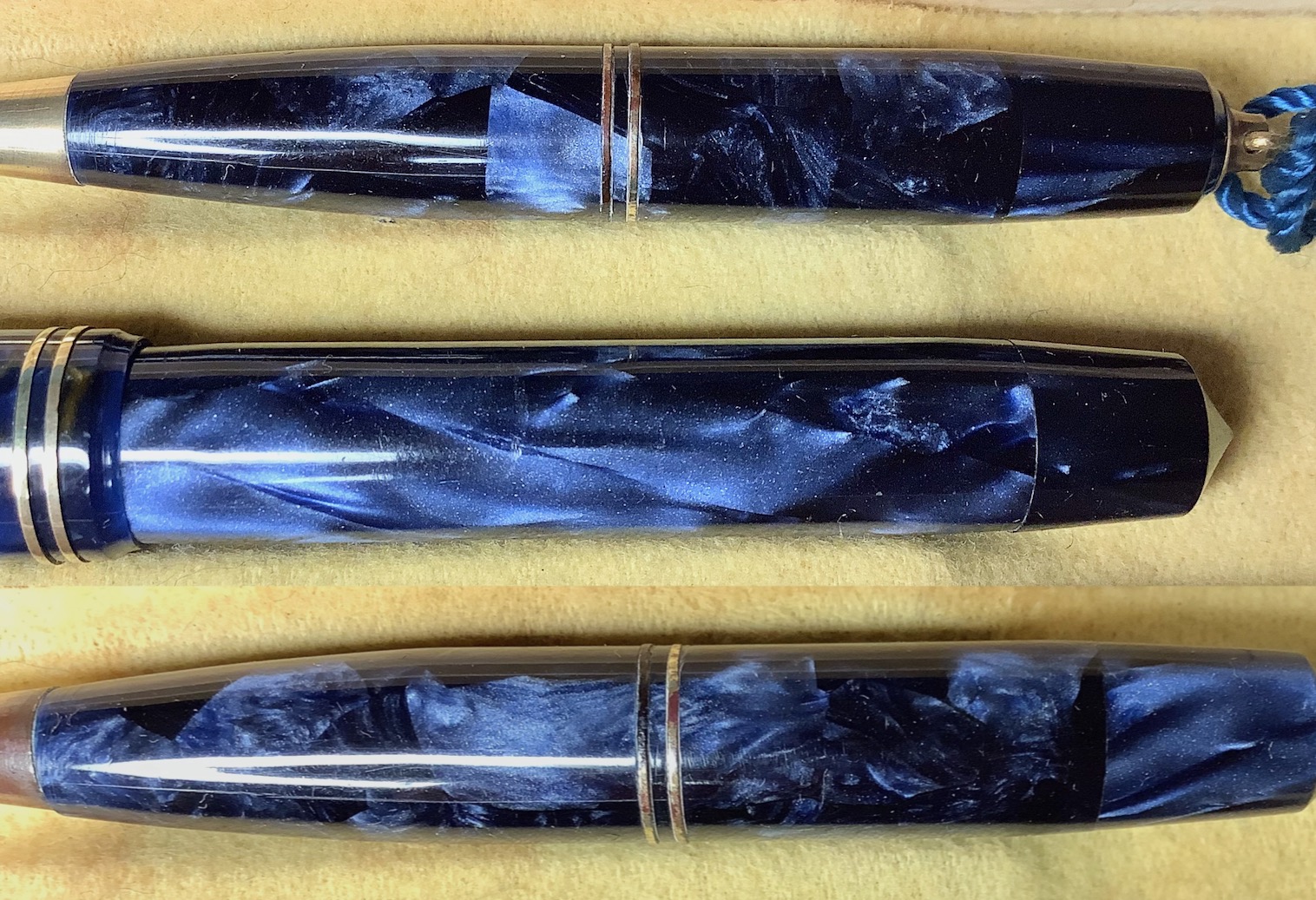 Mi permetto un'osservazione: la celluloide del cappuccio della stilografica (blu marmorizzato con venature bronzo) è diversa da quella del corpo penna (che definirei un blu perlaceo). Dubbi anche sulla matita: il fondello mi sembra fatto con lo stesso materiale del corpo penna e pare diverso dal resto della matita.