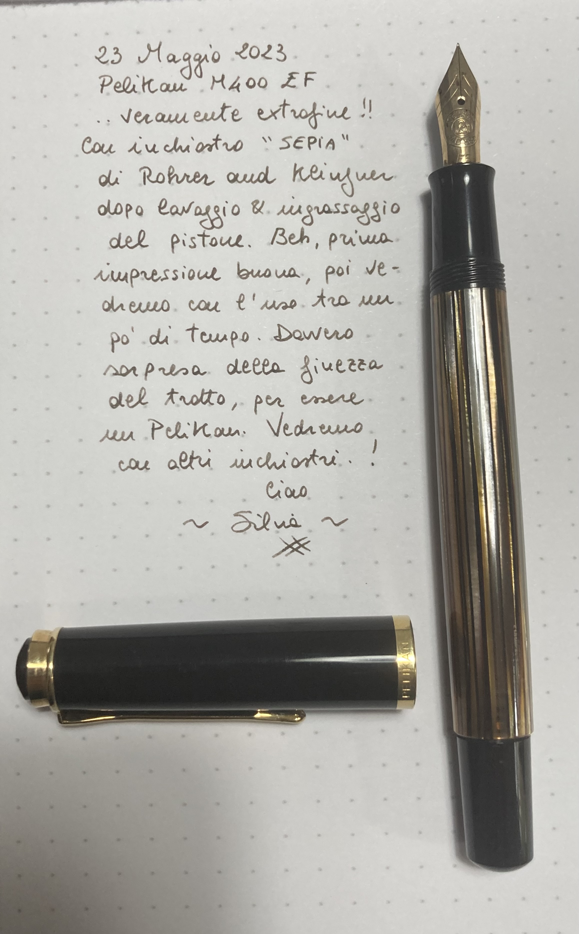 Eccola, la mia nuova arrivata :) Per una serie di eventi, alla fine è stata lei, tra due simili, ad approdare al mio scrittoio. EF di nome e di fatto! Non mi aspettavo un tratto così fine da una Pelikan, anche se ero stata avvertita che i modelli non proprio recenti avevano il tratto più “contenuto”. A me va benissimo, vista la mia grafia ed anche perché di penne più “succose” ne ho già :D