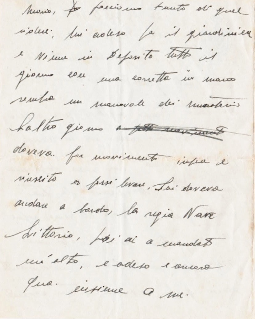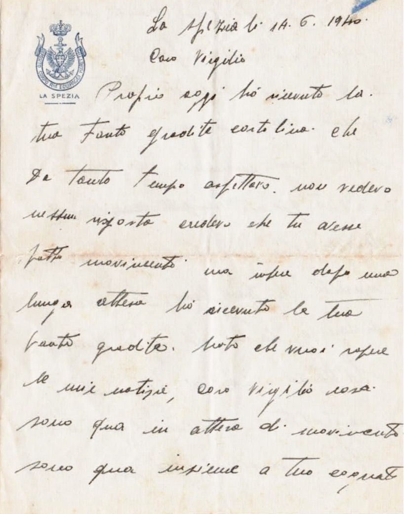 La lettera è su carta intestata del Deposito Corpo Reale Equipaggi Marittimi (personale militare appartenente alla Regia Marina) e datata 14 giugno 1940 ; convenevoli a parte, ho trovato interessante la parte dello scritto dove si racconta che Mario (il succitato fratello della nonna) era riuscito ad evitare di imbarcarsi (far movimento) sulla nave Littorio, una delle più belle corazzate italiane del tempo (da cui il nome della Classe "Littorio" e di cui fecero parte le Corazzate Vittorio Veneto e la Roma) in pieno esercizio da appena un mese nel maggio del '40, e che nel novembre dello stresso anno subì gravi danni quando si trovava nel porto di Taranto ( https://it.wikipedia.org/wiki/Notte_di_Taranto ).