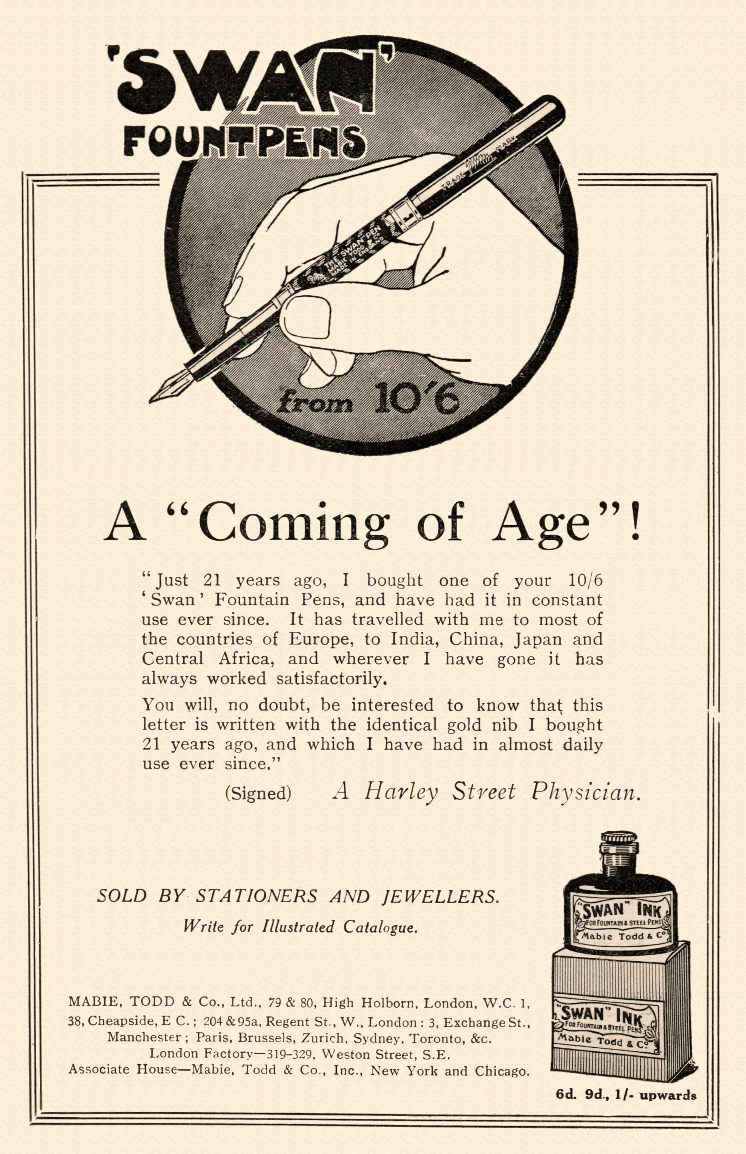 E’ in questo periodo storico che a Londra viene fabbricata la stilografica che vi presento oggi. Alla ricerca d’un pennino veramente flessibile, non per questioni di “moda” bensì per aggiungere alla mia modesta collezione anche questo tipo di stilografica e, soprattutto, per farne esperienza diretta, grazie ad un amico inglese ho potuto acquistare questa Swan dei primi anni del 1900.