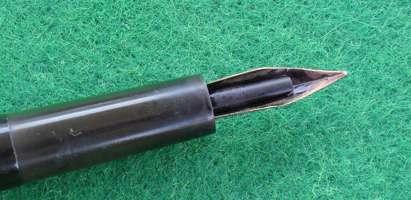 - materiali: corpo, sezione, alimentatore e cappuccio in ebanite. Pennino d’oro a 14 carati. Treccia interna d’alimentazione in argento. La flessibilità del pennino, di misura 1, è ottima: l’allargamento del tratto s’ottiene senza dover esercitare una pressione particolare ma, volendo, sia l’alimentatore sia il pennino reggono tranquillamente pressioni in grado di trasformare la punta eef (extra extra fine) in una vera e propria doppia b (“broad”) ed anche di più.