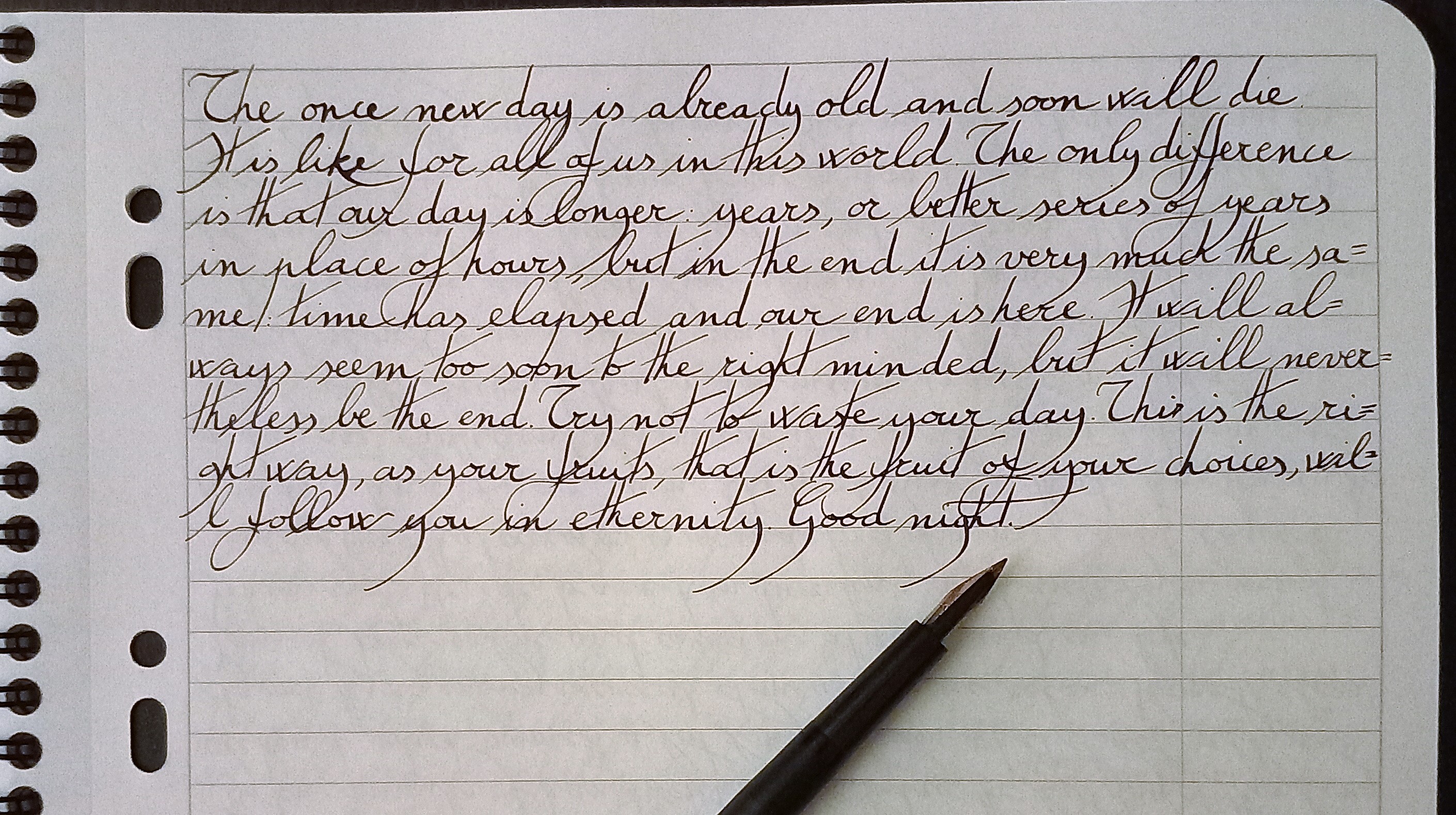 Se si tiene conto che il gruppo di scrittura, data la sua architettura delicata, non è stato smontato ma semplicemente lavato, queste prestazioni sono sorprendenti. E’ vero che la produzione Swan s’impose sin dagli albori anche grazie al proprio livello qualitativo, ma si tratta pur sempre d’una stilografica che ha compiuto da tempo i 100 anni d’età. Naturalmente, l’allargamento dei rebbi durante la scrittura riversa una sostanziosa quantità d’inchiostro sulla carta, perciò ho scelto l’Aurora blu-nero, che è poco tensioattivo: s’ottengono così ottimi risultati su carte levigate e risultati accettabili, cioè senza spiumaggio, anche su carta comune.