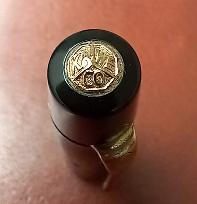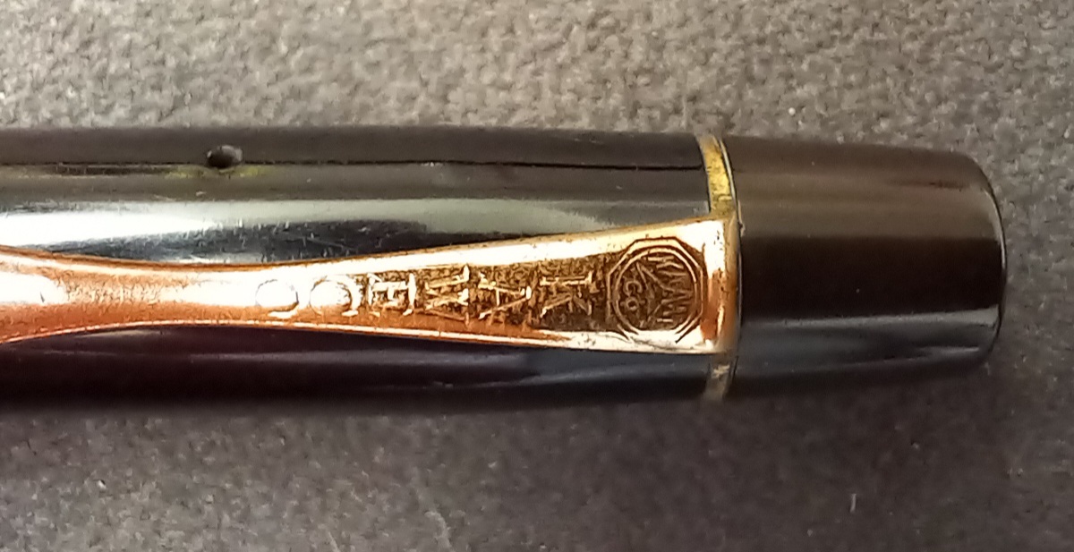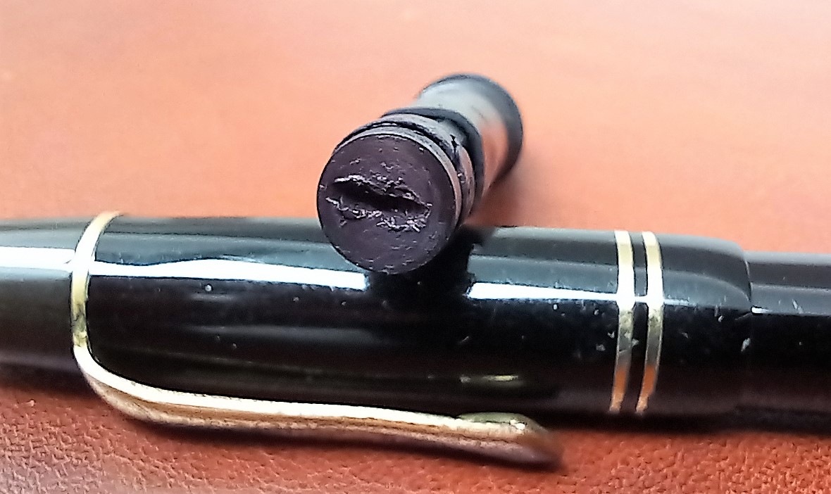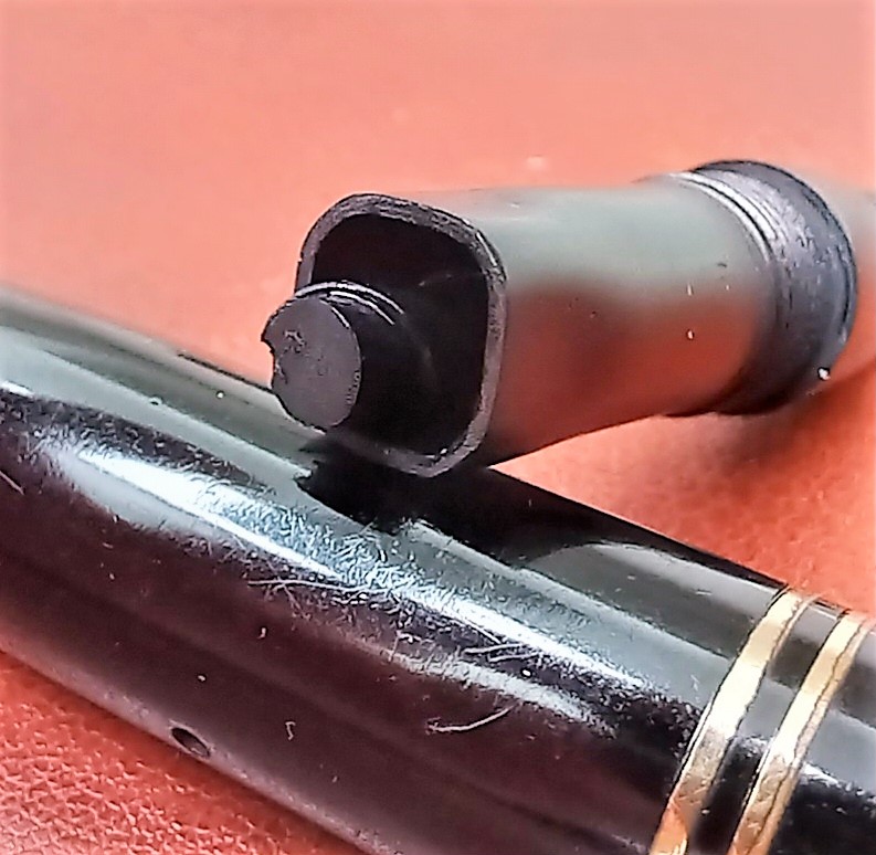 Il corpo e la parte principale del cappuccio sono in celluloide, mentre la corona del cappuccio ed il fondello, inclusa la sua parte fissa, sono in ebanite. La minuteria è dorata. Immagino che il pennino fosse d’oro a 14 carati, l’alimentatore in ebanite.