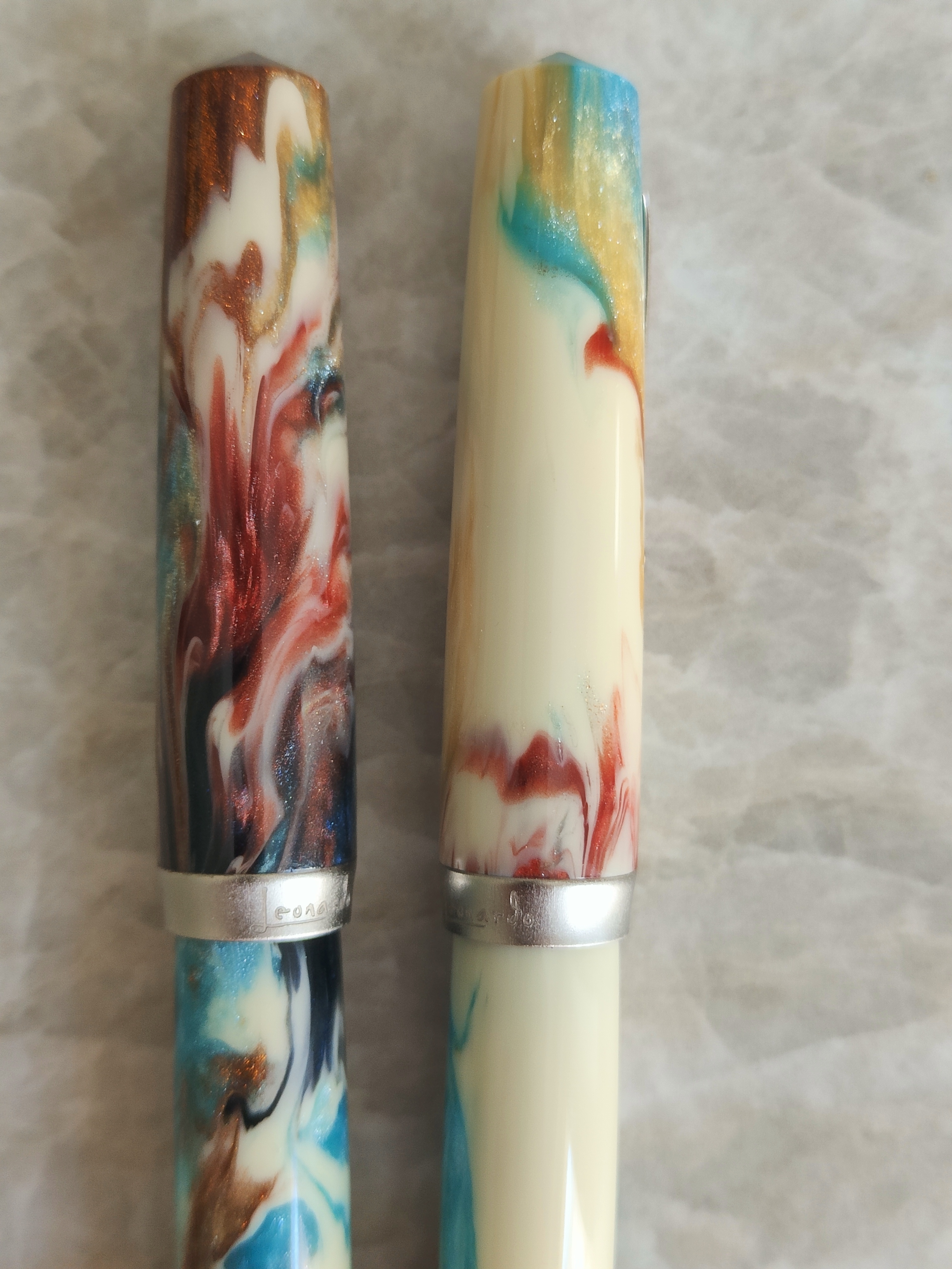 Dopo un paio di settimane di Cosmic Dust con Fenice inhouse, ho scritto a Leonardo per chiedere se prevedesse di rifare entro l'anno un altro lotto con la stessa resina. La risposta è stata, purtroppo, negativa. Tuttavia, sono stata informata che ne era avanzata esattamente una, non messa in vendita perché contenente una quantità di bianco/avorio ritenuta eccessiva rispetto alle altre. Io adoro il bianco in questo tipo di resine, tanto che ho anche una Cherry Koi con molto bianco. Senza esitare ho confermato l'acquisto e ho scelto il pennino elastic in oro 14k carati nella misura CSI F. L'elastico in oro ce l'avevo EF e lo volevo anche nel grinding CSI. Si tratta di un'esperienza di scrittura completamente diversa rispetto a quella del Fenice CSI F. Con il Fenice ottengo una variazione ed un tratto che non ho trovato in nessun altro pennino, compresi gli IB Pelikan. Non saprei scegliere quale dei due CSI preferirei se dovessi indicarne uno solo e sono molto felice di averne entrambi.