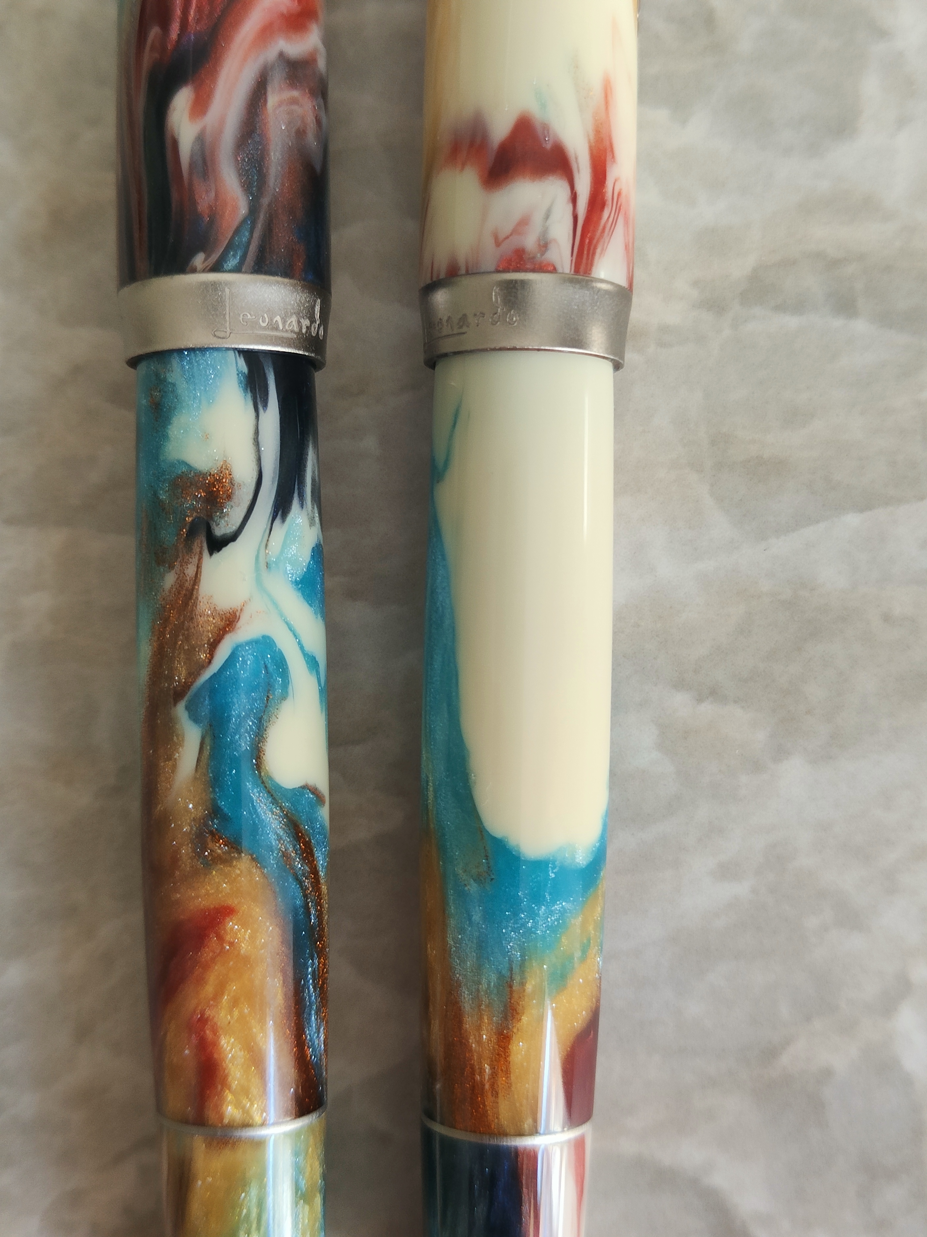 Credo di avere già scritto in qualche mia recensione che di Leonardo mi piace che ogni penna abbia una qualità "top di gamma ", di identica eccellente fattura sia che si tratti di una celluloide Arco che di una resina Brooks, o Smith. Chiaro è che la qualità dei materiali cambia, e così anche il prezzo. Per quanto riguarda il materiale c'è, inoltre, da dire che si tratta di resine molto resistenti perché fatte con la tecnica dello stampo siliconico: questo significa che ogni barra presenta una quantità di indurente e di pigmenti di colore che, come risultato finale, raggiungono la stessa resistenza agli urti della celluloide senza lo svantaggio della cristallizzazione.