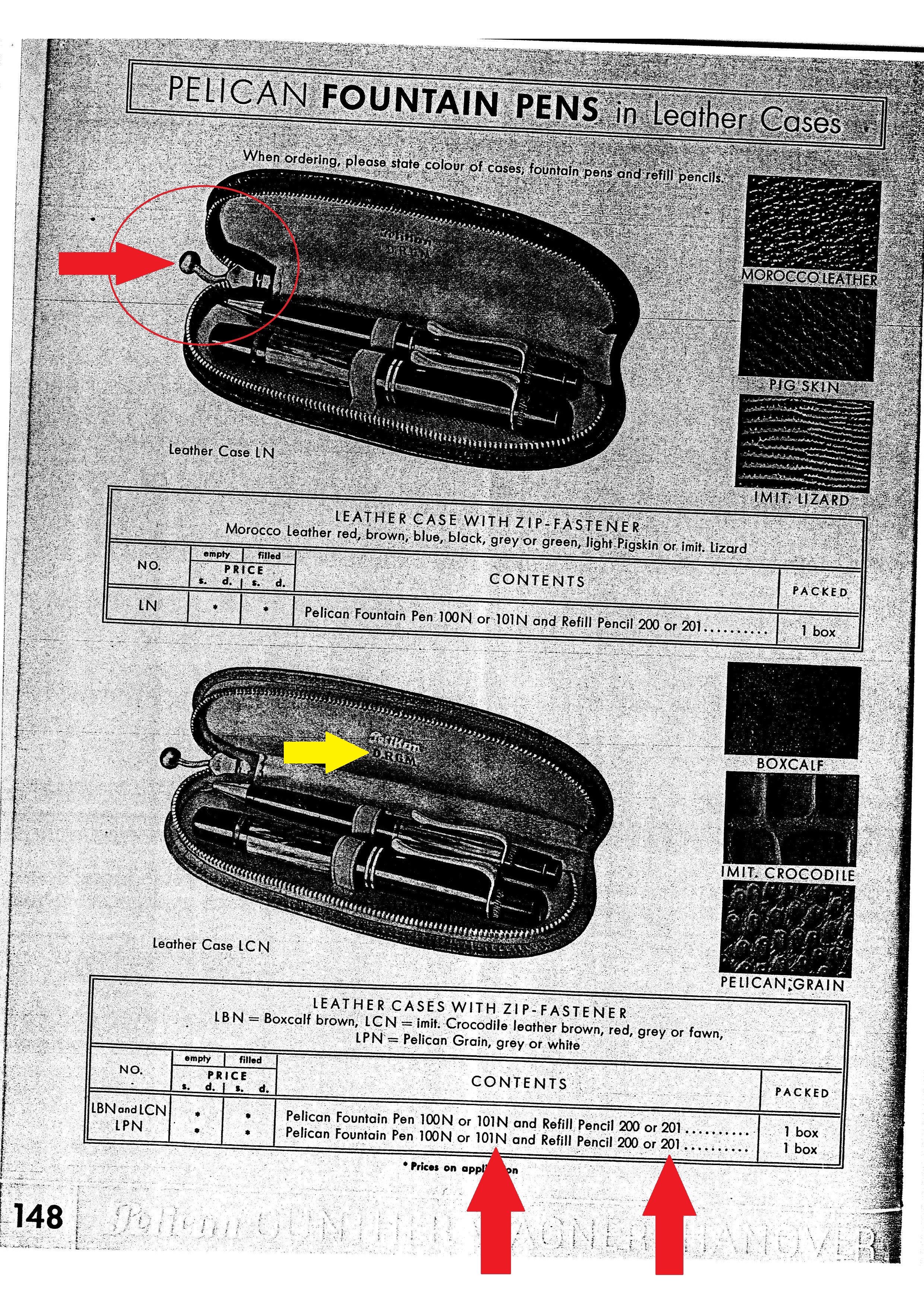 Stando alla mia esperienza anche con MontBlanc (confermata dai cataloghi consultabili: qui sotto ti allego una pagina di quello Pelican, senza <K> perché inglese, del 1939), prima e durante la Guerra la cerniera del porta penna non dovrebbe essere operata dalla palettina forata (come sulla tua) bensì da una sferetta in metallo pieno all'estremità di una catenella di maglia.