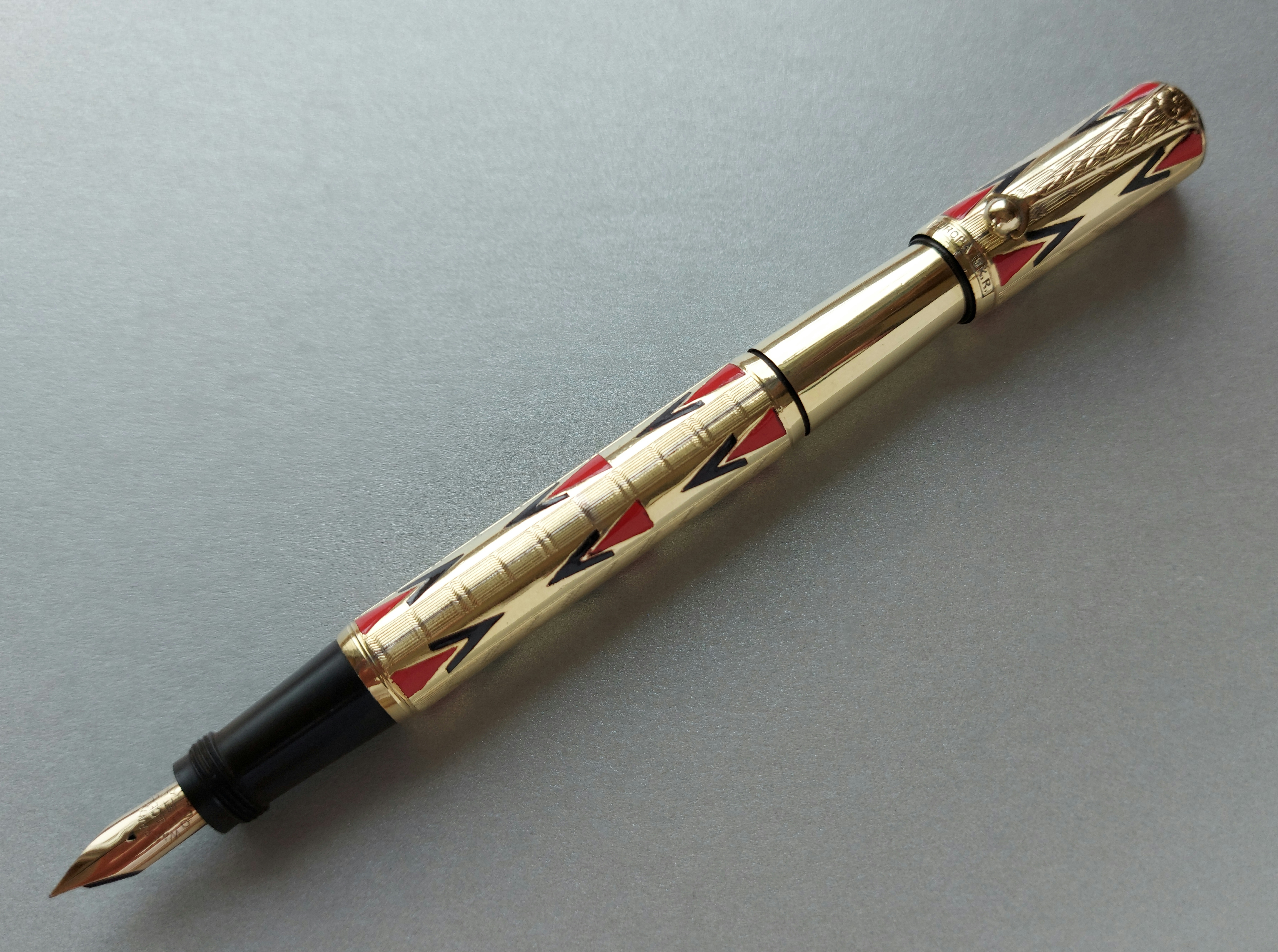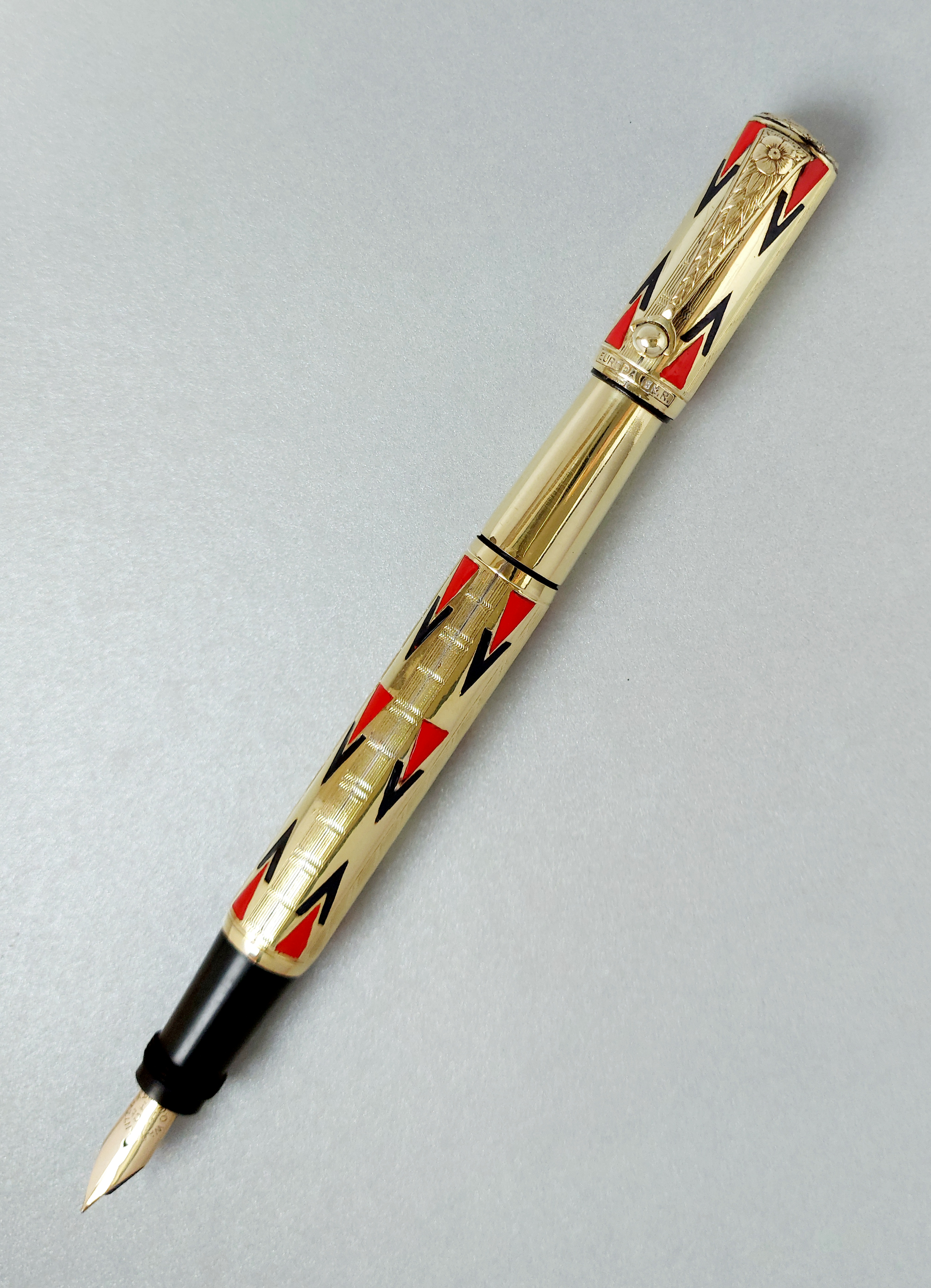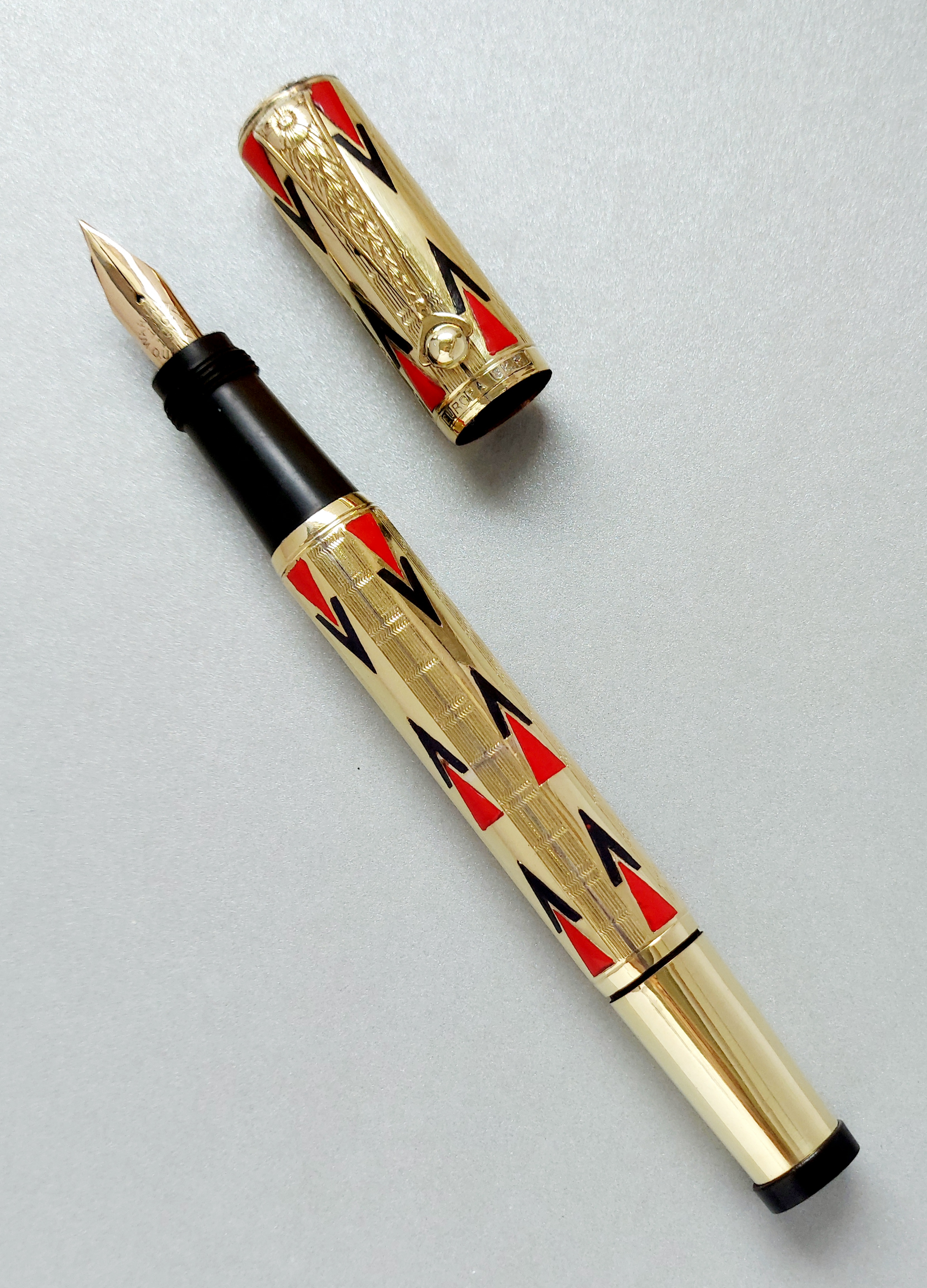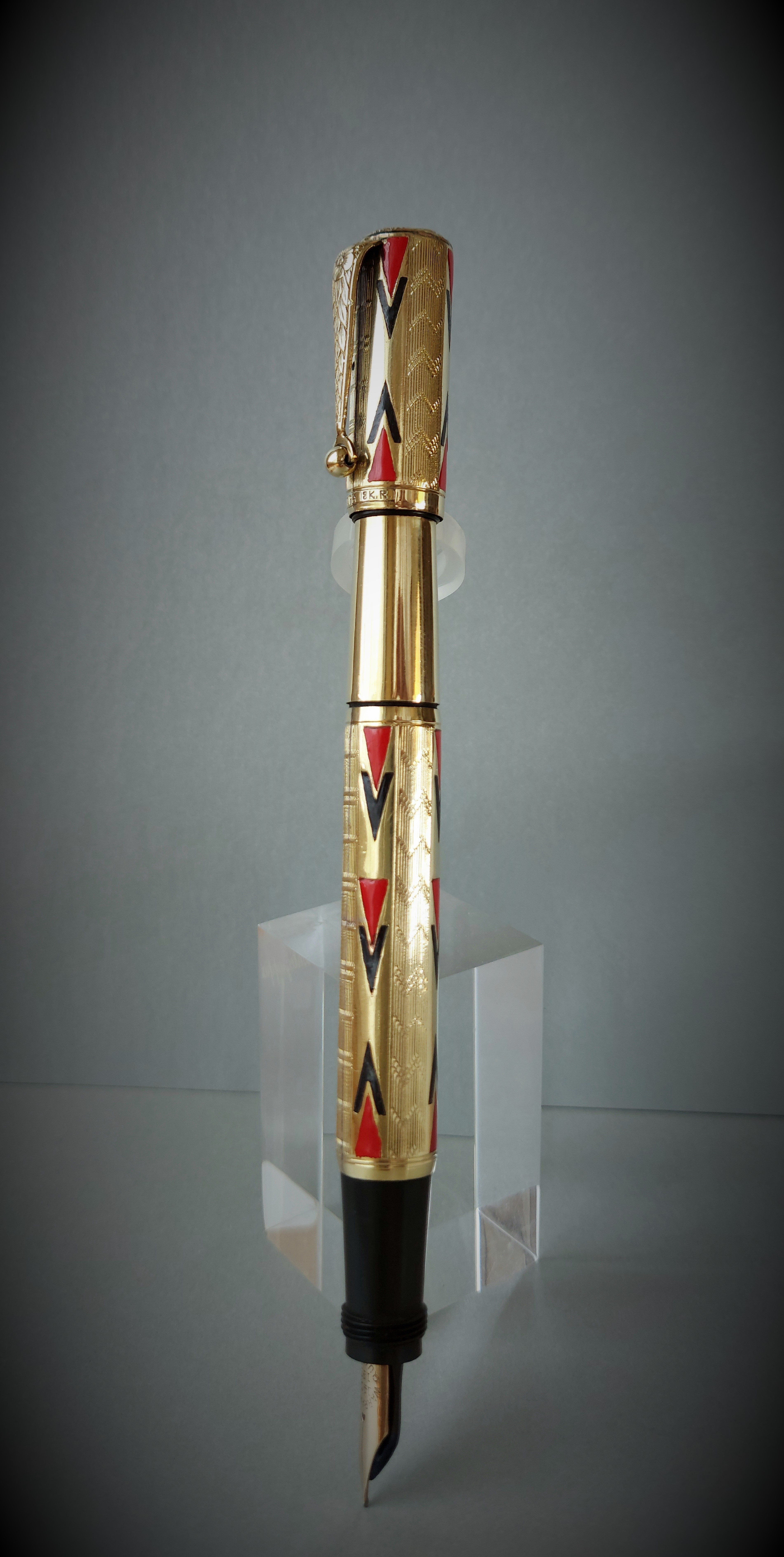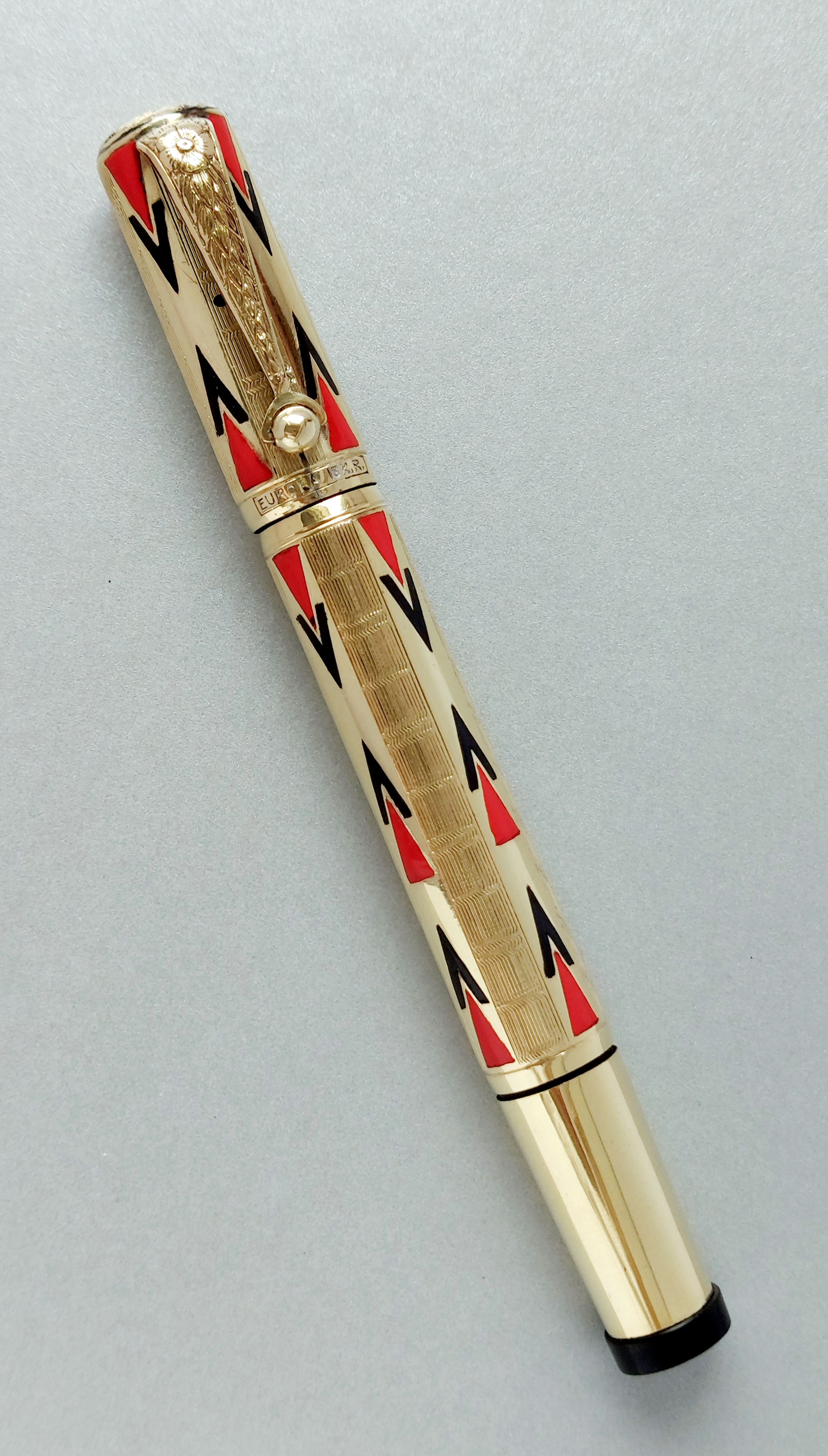 EUROPA 18 K.R. rientrante in ebanite nera liscia (BHR) laminata oro 18 K.R. con decorazioni a smalto rosse e nere a triangoli e galloni, cappuccio a vite con clip fissa, corretto pennino Warranted in oro 14 carati, caricamento safety, produzione Italia, anno 1931.
