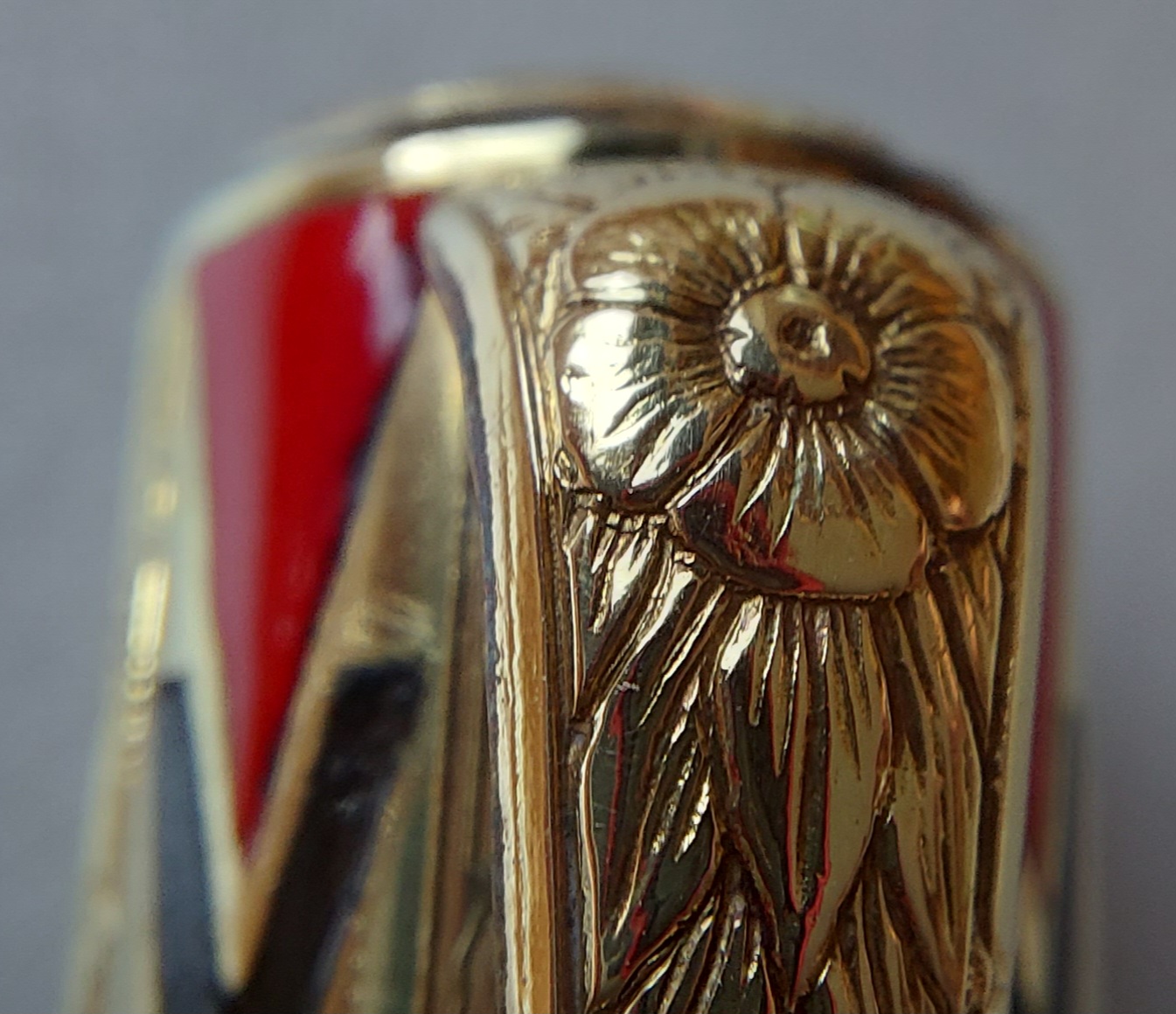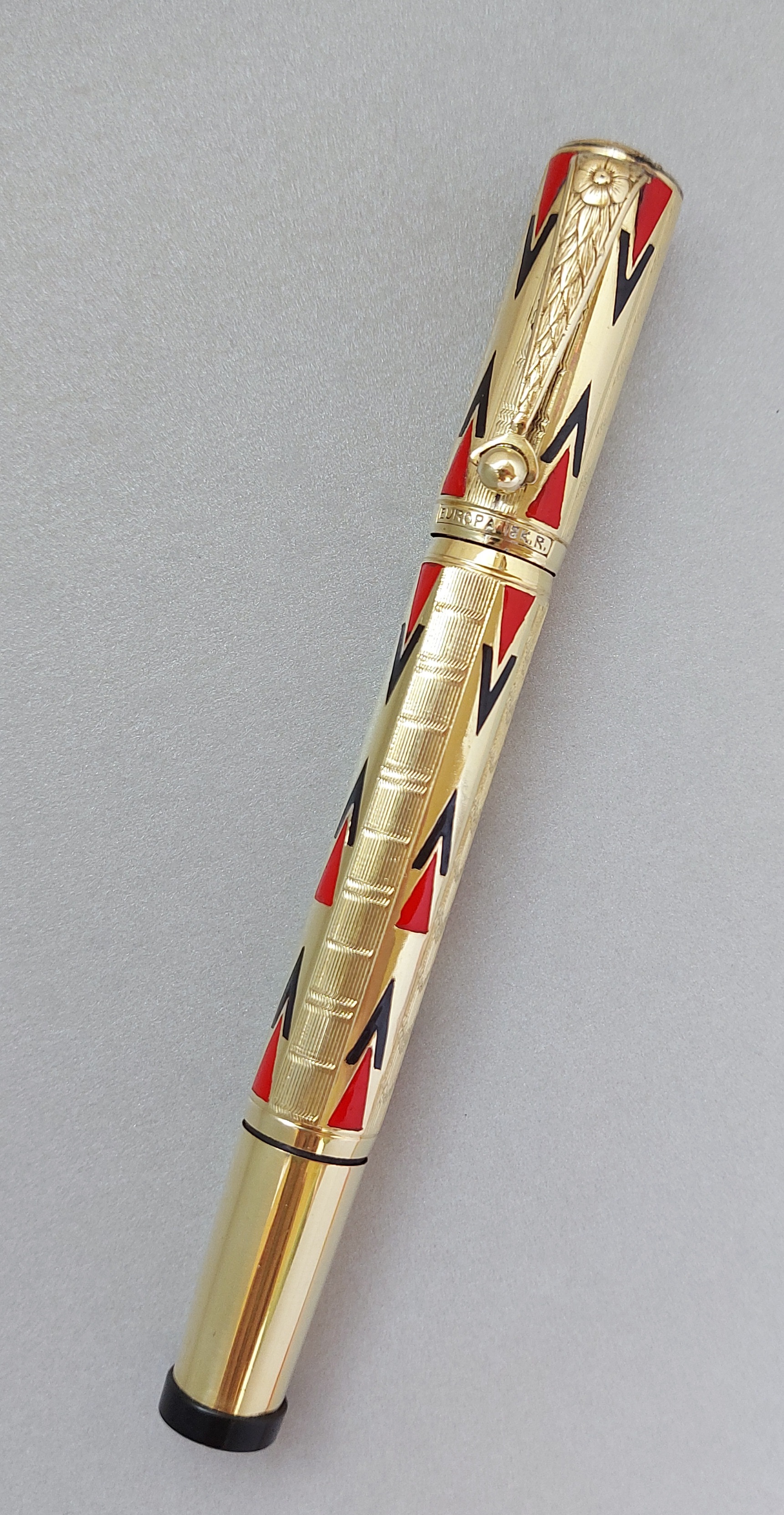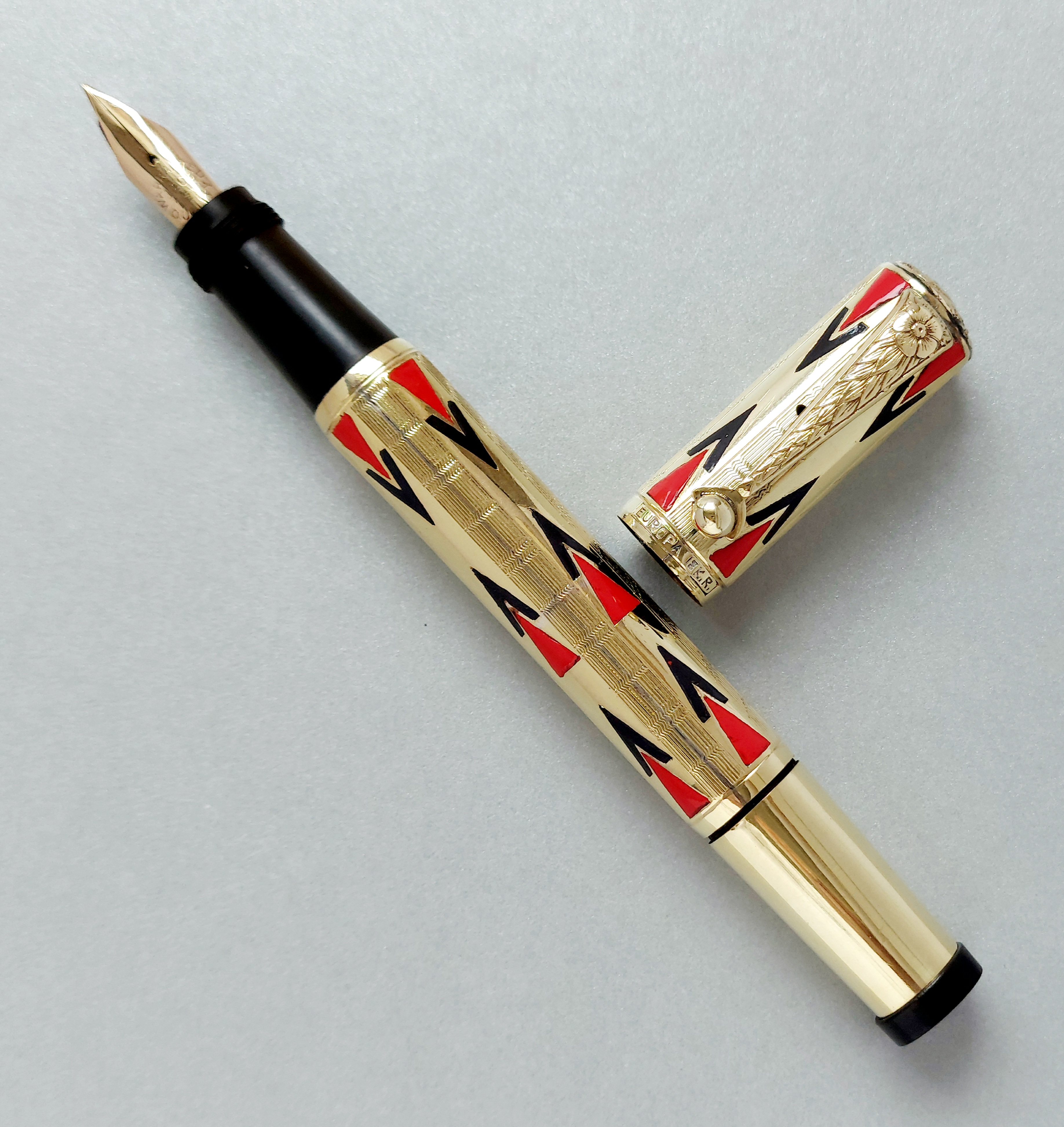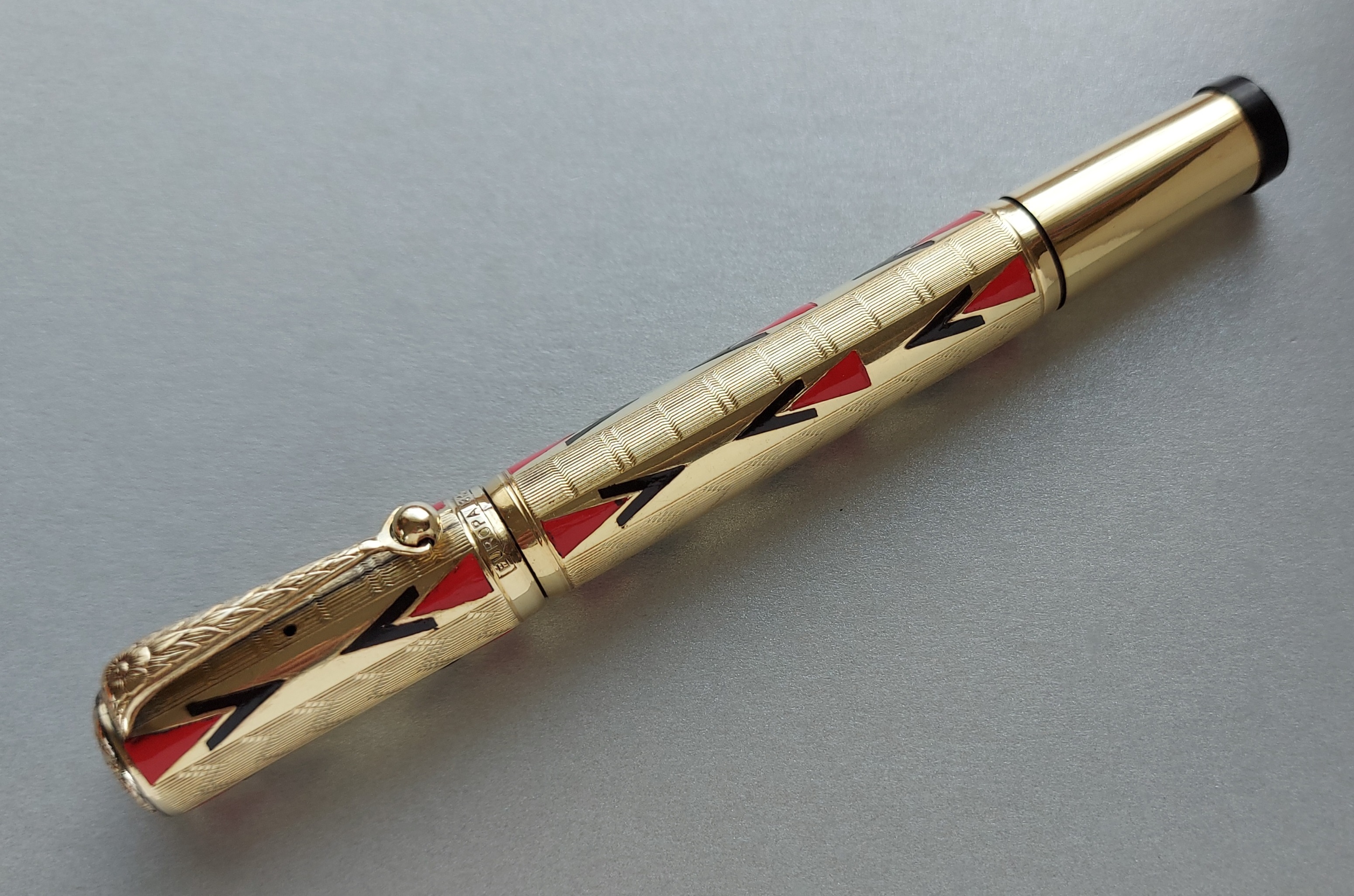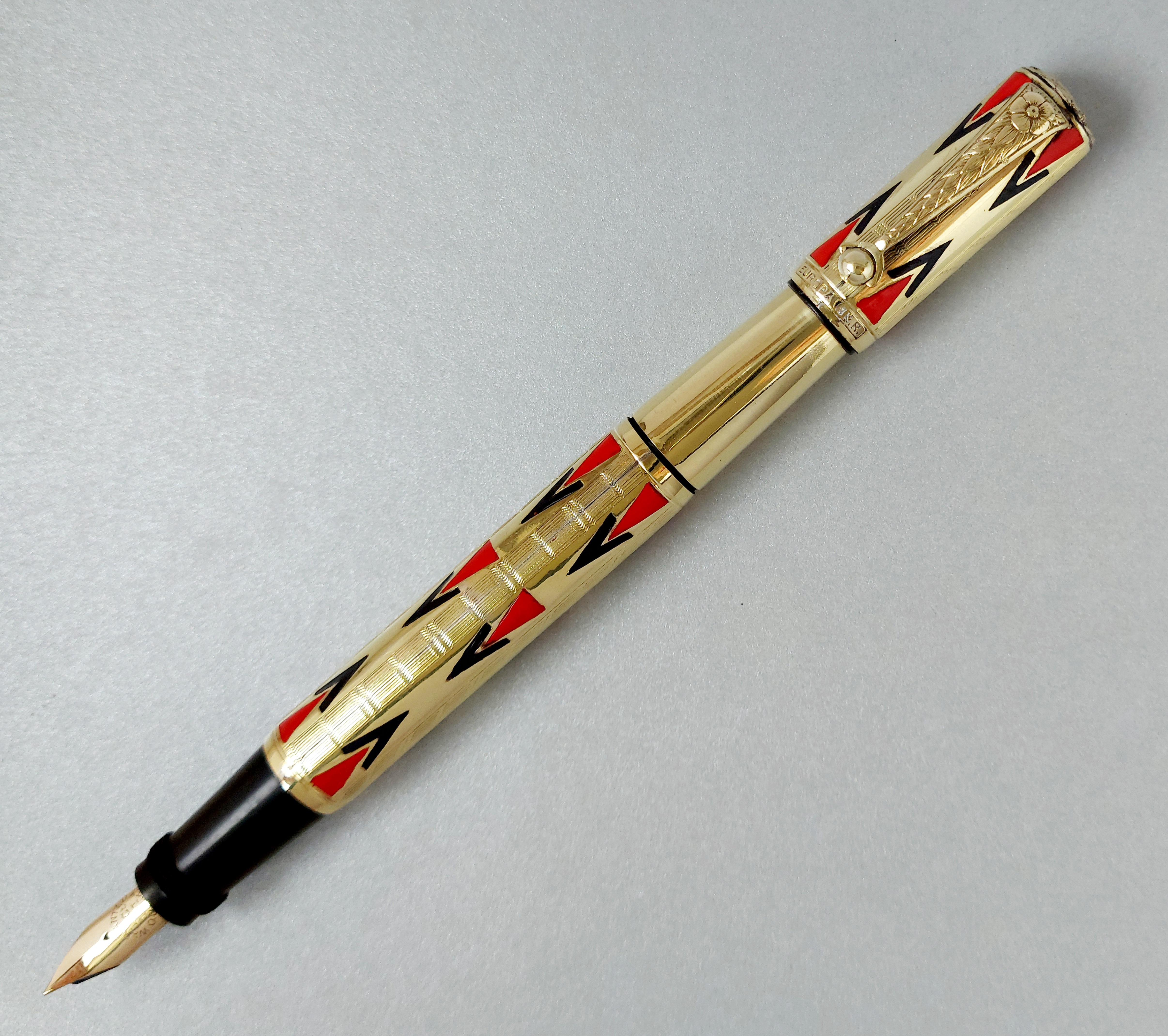 EUROPA 18 K.R. rientrante in ebanite nera liscia (BHR) laminata oro 18 K.R. con decorazioni a smalto rosse e nere a triangoli e galloni, cappuccio a vite con clip fissa, corretto pennino Warranted in oro 14 carati, caricamento safety, produzione Italia, anno 1931.