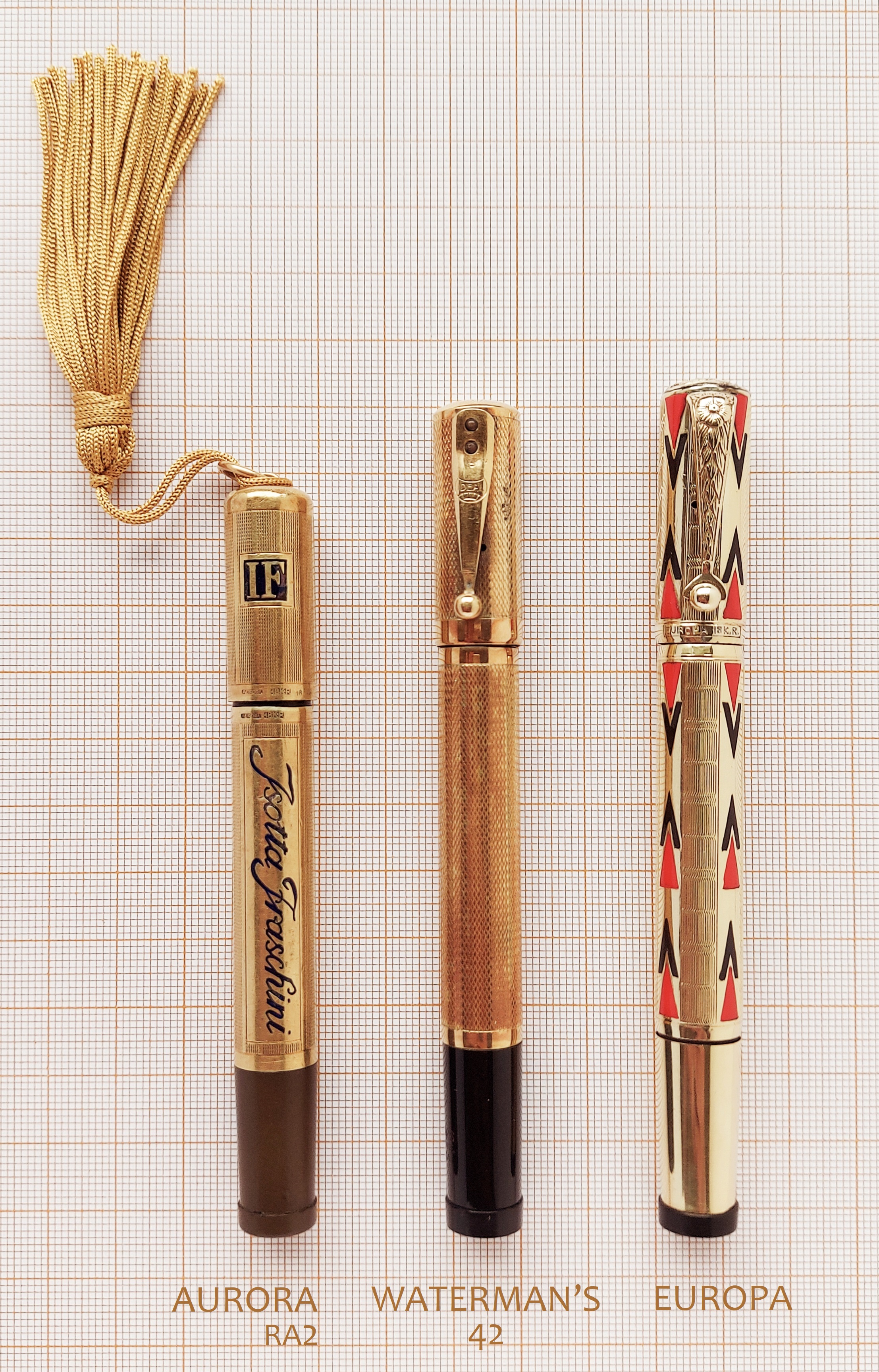 Per quanto riguarda la “misura grande”, gioverà senz’altro produrre un confronto dimensionale tra la stilografica oggetto della recensione e due eccellenze tra le penne oro (rivestite) presenti sul mercato italiano dell’epoca: come si può apprezzare dall’immagine seguente
