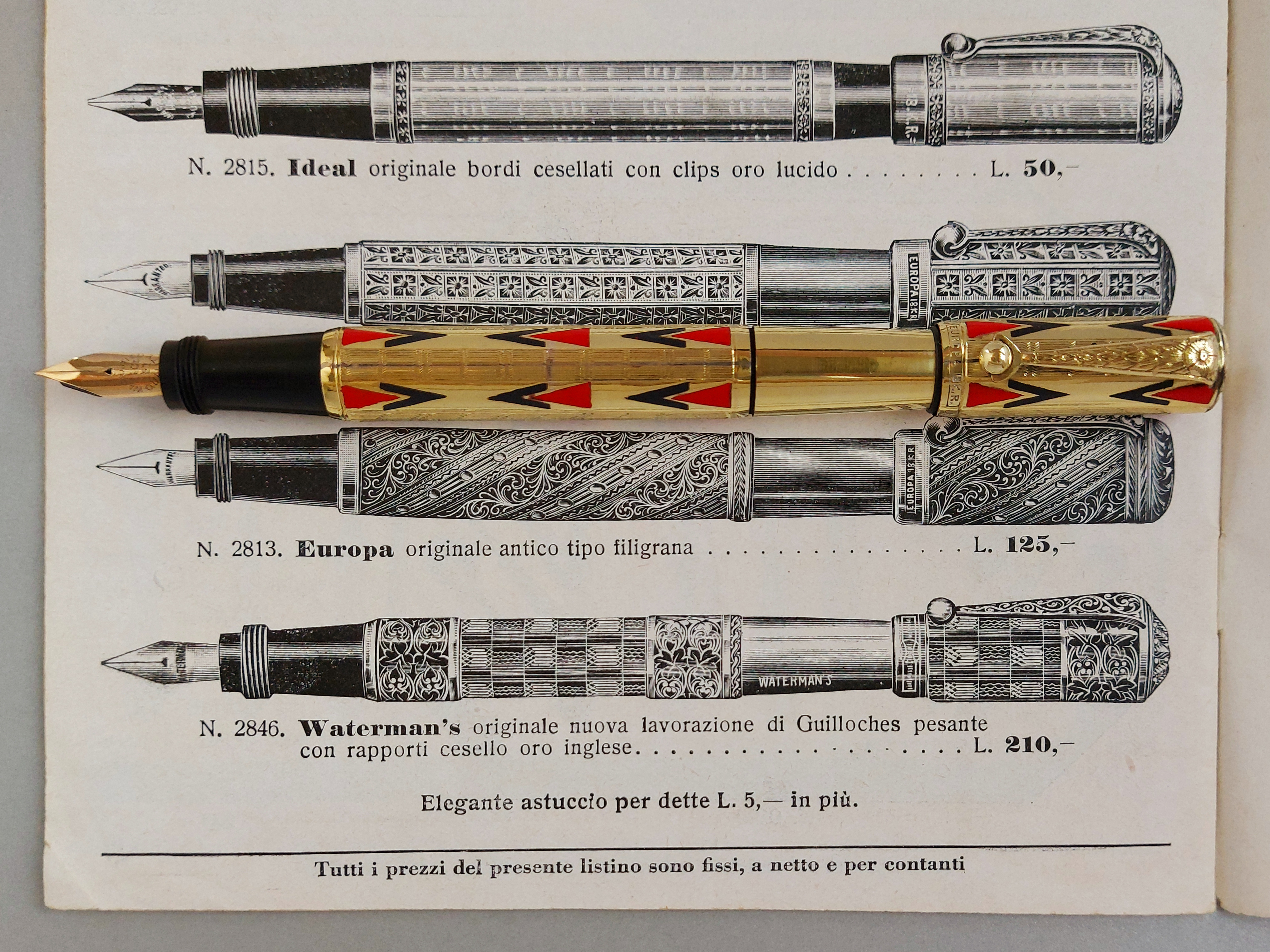 • Nel 1934 i modelli salgono a 6, compresi i primi 2 presentati (che rimangono i più costosi), e le due penne per signora mostrate in precedenza. Nonostante l’aggiunta di due modelli di valore intermedio, il Catalogo sembra puntare molto sul marchio dichiarando: «La penna “Europa” è la più scorrevole, la più facile al riempimento, la più elegante, la più conveniente, la più garantita…».