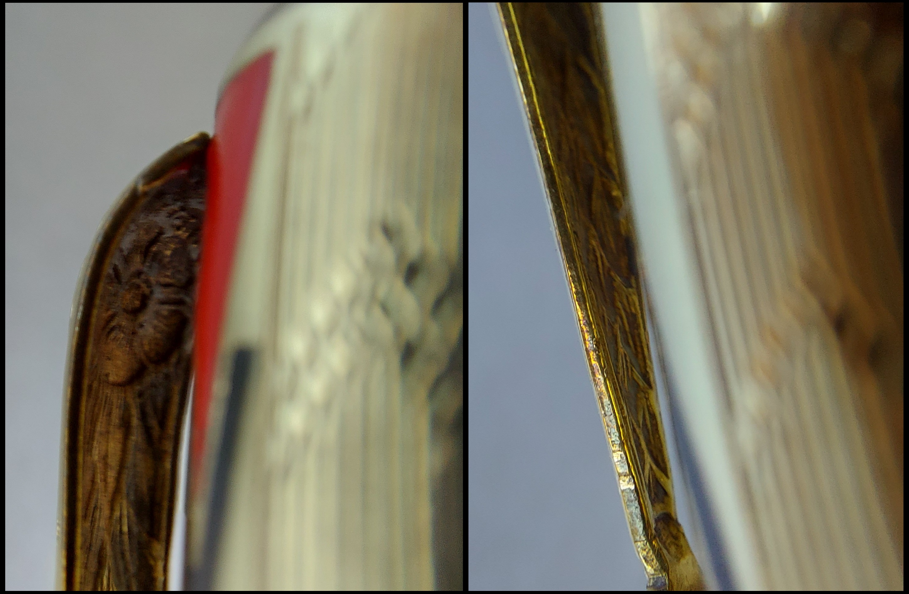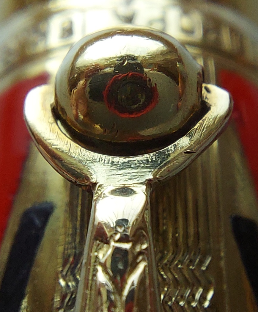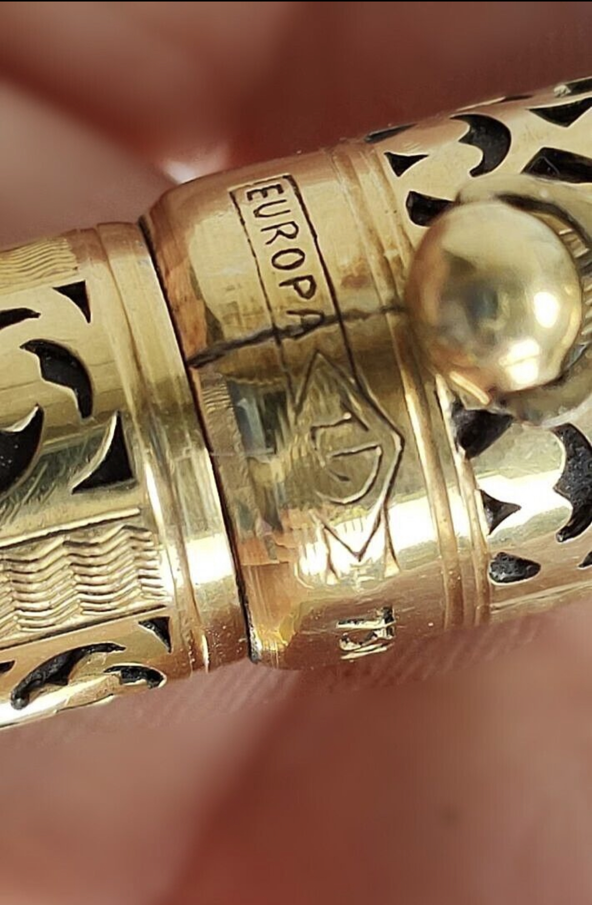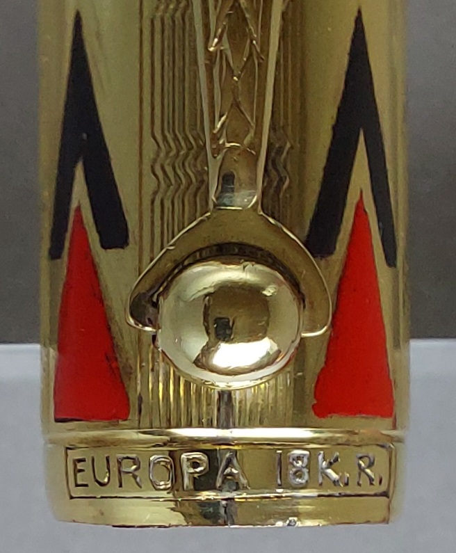 Le penne marchiate EUROPA sono (quasi) esclusivamente rientranti (“safety”, sebbene siano citate in letteratura anche penne a “pulsante di fondo” tipo Duofold e persino un caricamento a “levetta”), in ebanite nera, e sempre rivestite in metalli preziosi. Grazie al mio esemplare oggi in presentazione potremo aggiungere anche le “decorazioni a smalto”. :thumbup:
