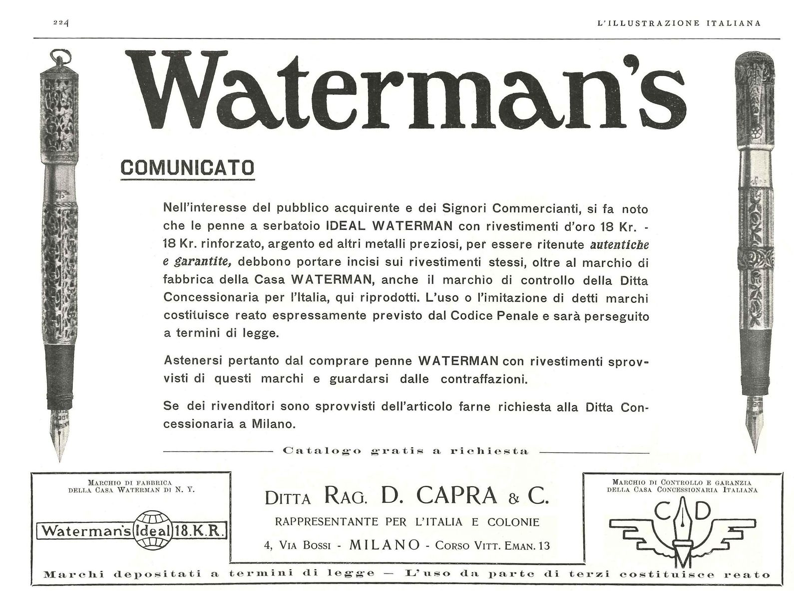 Secondo Paolo Demuro, vista la coincidenza di molte delle laminature con quelle che si possono ritrovare sulle penne Waterman’s rivestite (con l’autorizzazione del Rappresentante) dai laboratori orafi in Italia (Milano), la data del possibile inizio dovrebbe essere fissata al 1920.