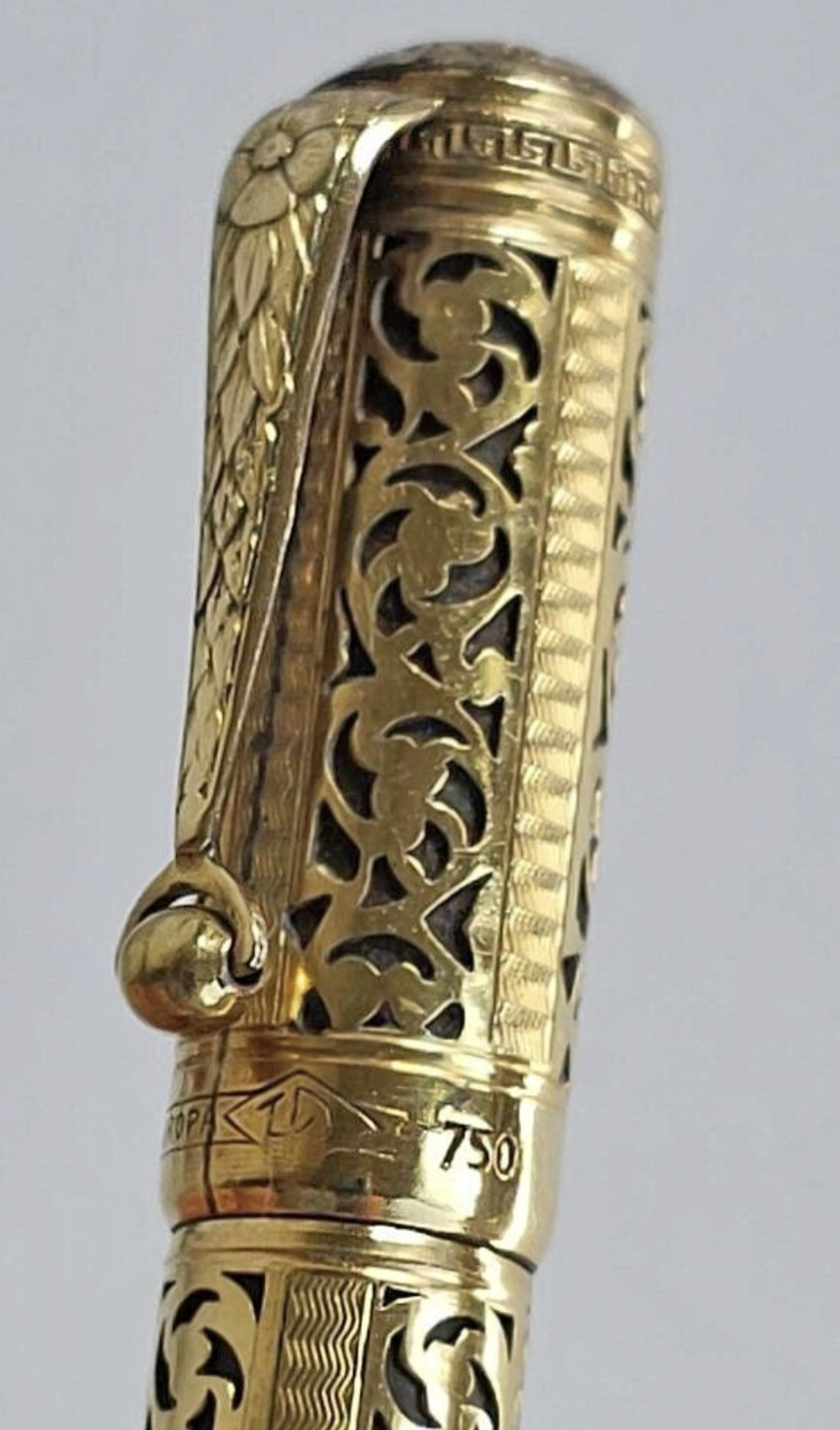 La splendida “clip a ruzzolina” con decoro floreale potrebbe rivelarsi un dettaglio importante per fissare un limite temporale anche per la penna in presentazione: nonostante la “roller clip” della Wahl-Eversharp fosse ampiamente presente sul mercato americano dall’inizio degli anni Venti, fu solo forse con il modello “Deco Band” che si scatenò il desiderio di emulazione anche sul mercato italiano (in questo caso del solo gruppo della sferetta rotante, che aveva la caratteristica “tecnica” di non rovinare i tessuti dei taschini).