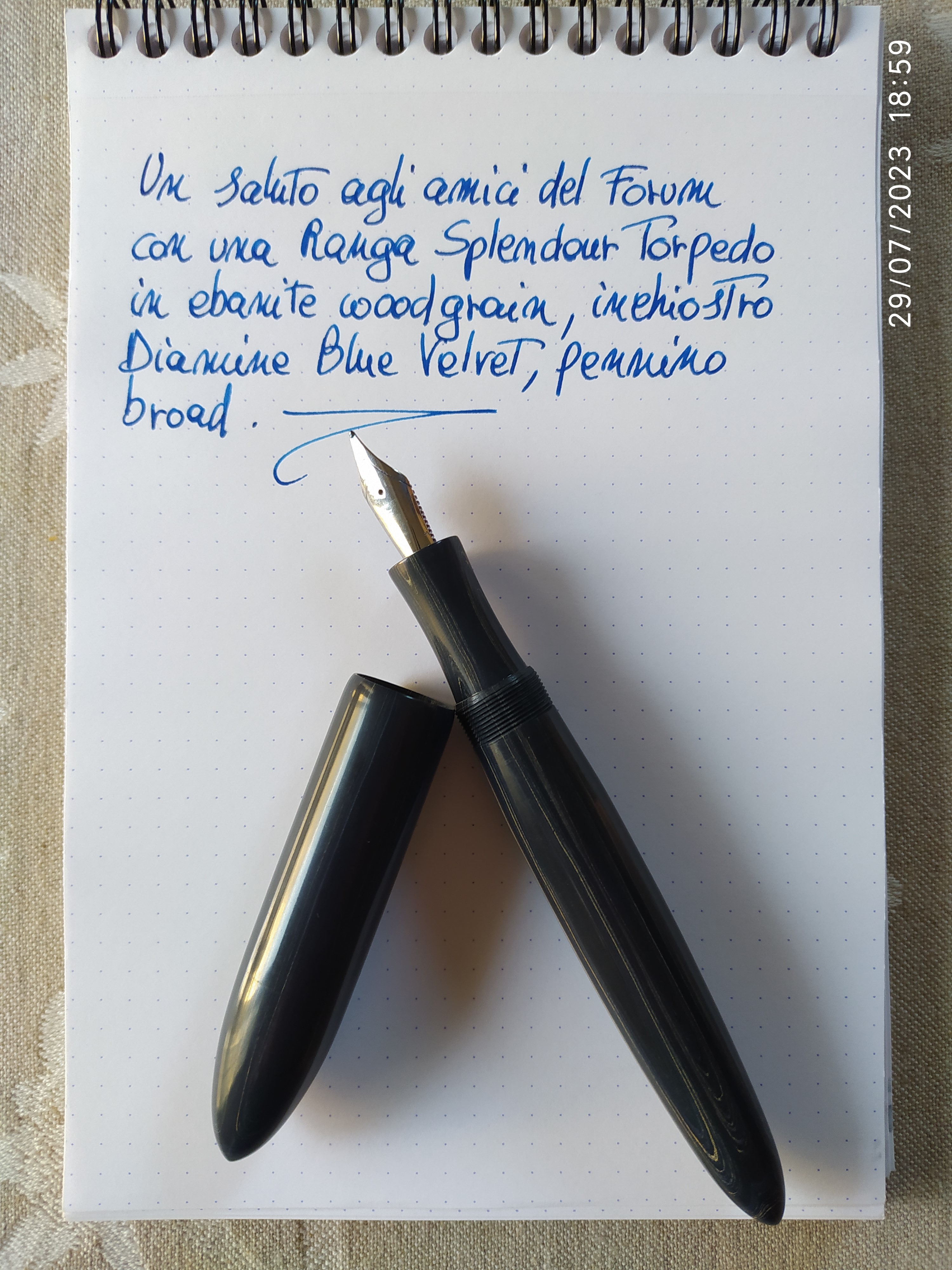 Pennino rigido, con feedback "evidente " da penna vintage, ma non fastidioso, flusso abbondante ma larghezza del tratto in linea con quanto stampigliato sul pennino (è un F e scrive da F).
