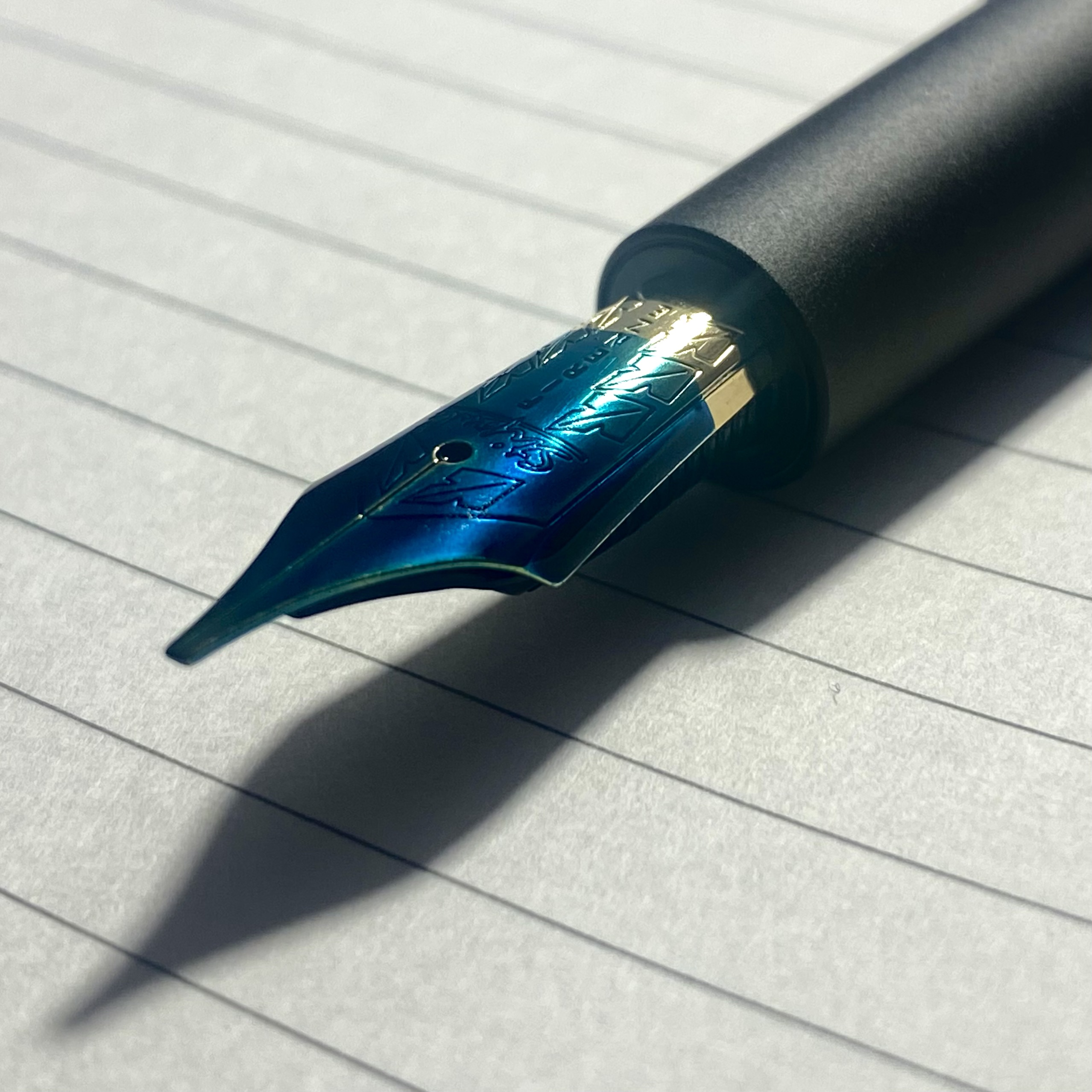 Su pennini morbidi/flessibili o comunque che offrano una variazione minima di tratto ha belle sfumature dal turchese all’azzurro scuro (che nelle mie foto non si vedono).