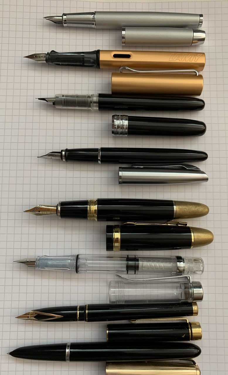 Jinhao 159: pennona cicciona, tutta in metallo, pesa un botto, robustissima, scarsa qualità della vernice, scrive abbastanza bene, pennino M . Circa 10€ , ora esiste anche in plastica, si chiama X159 e pare fatta meglio oltre ad essere più confortevole, prezzo circa 15€