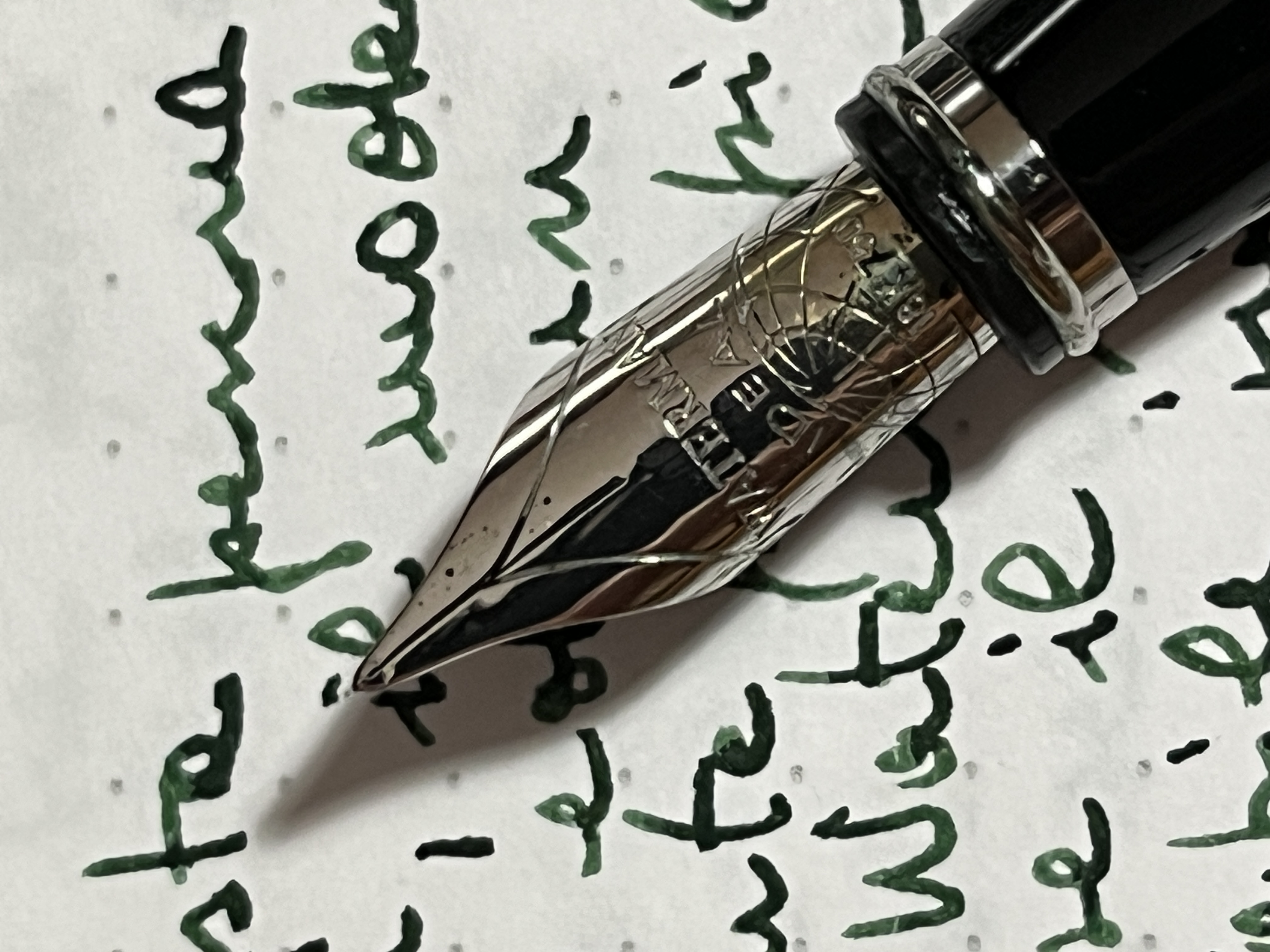 2 - il grado del pennino è un M e ha un "difetto": è sempre sporco di inchiostro tra i rebbi. Anche se si pulisce, quando si richiude la penna col suo cappuccio, alla fine della corsa fa uno "scatto" ed alla riapertura ricompare la goccia di inchiostro tra i rebbi. Forse lo "scatto" della chiusura dà quella piccola botta che causa la fuoriscita di inchiostro