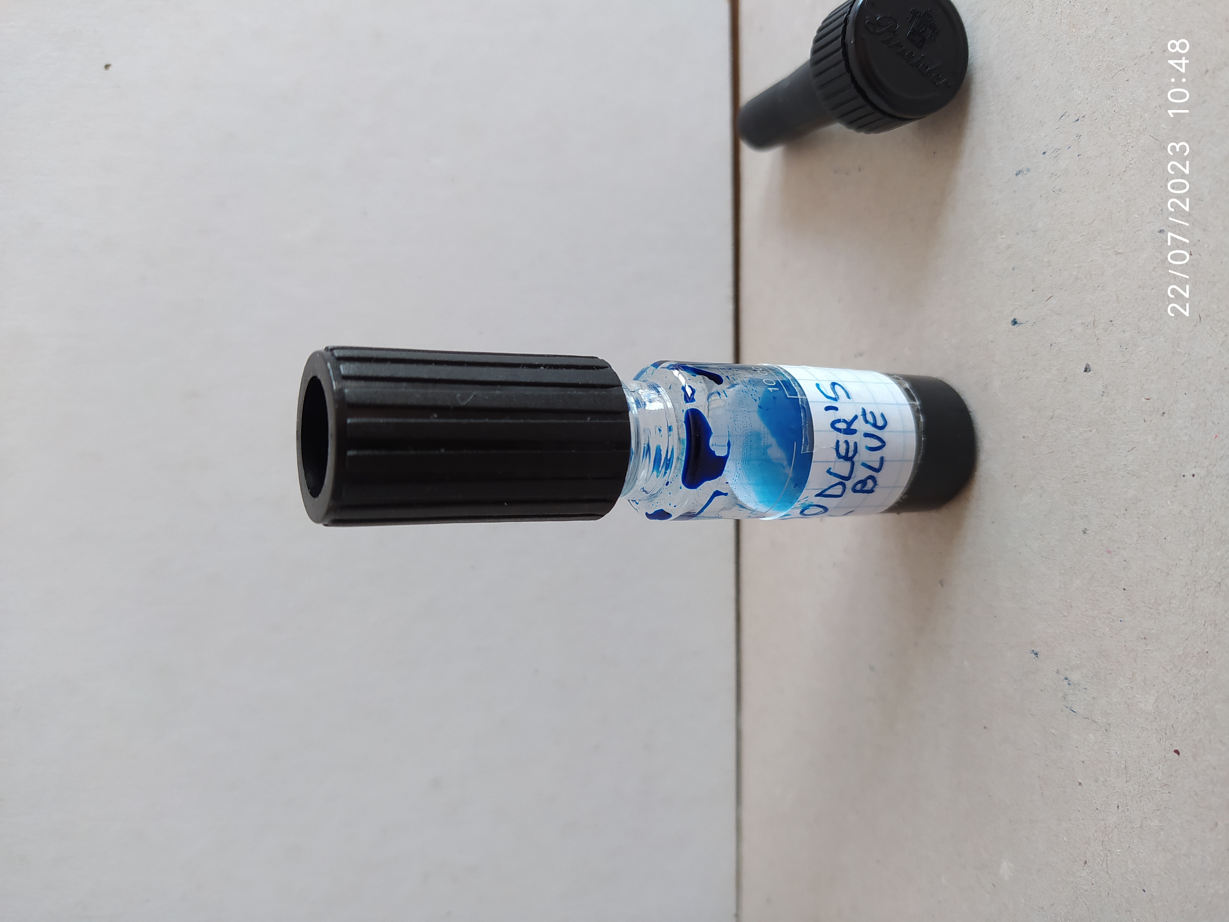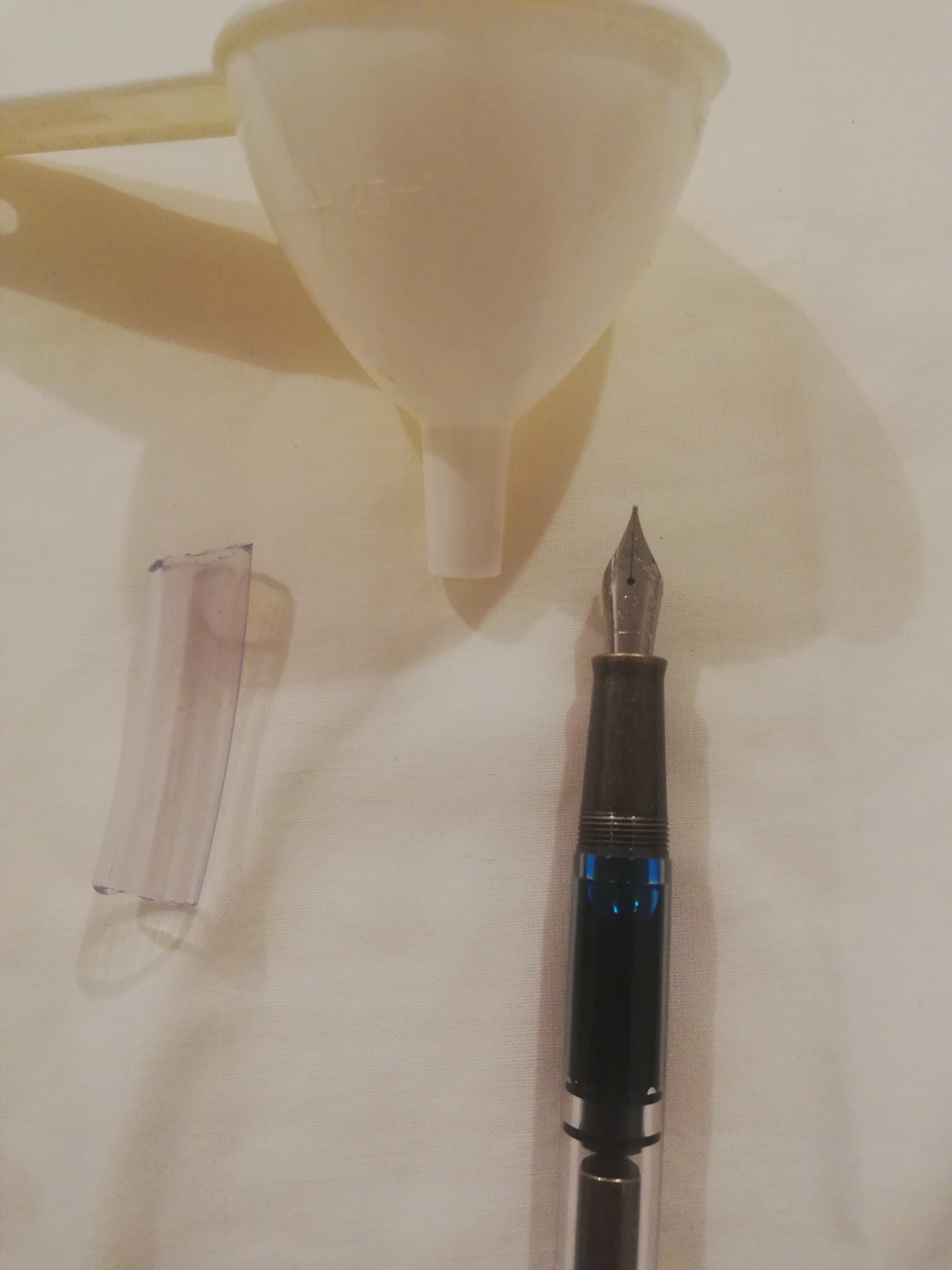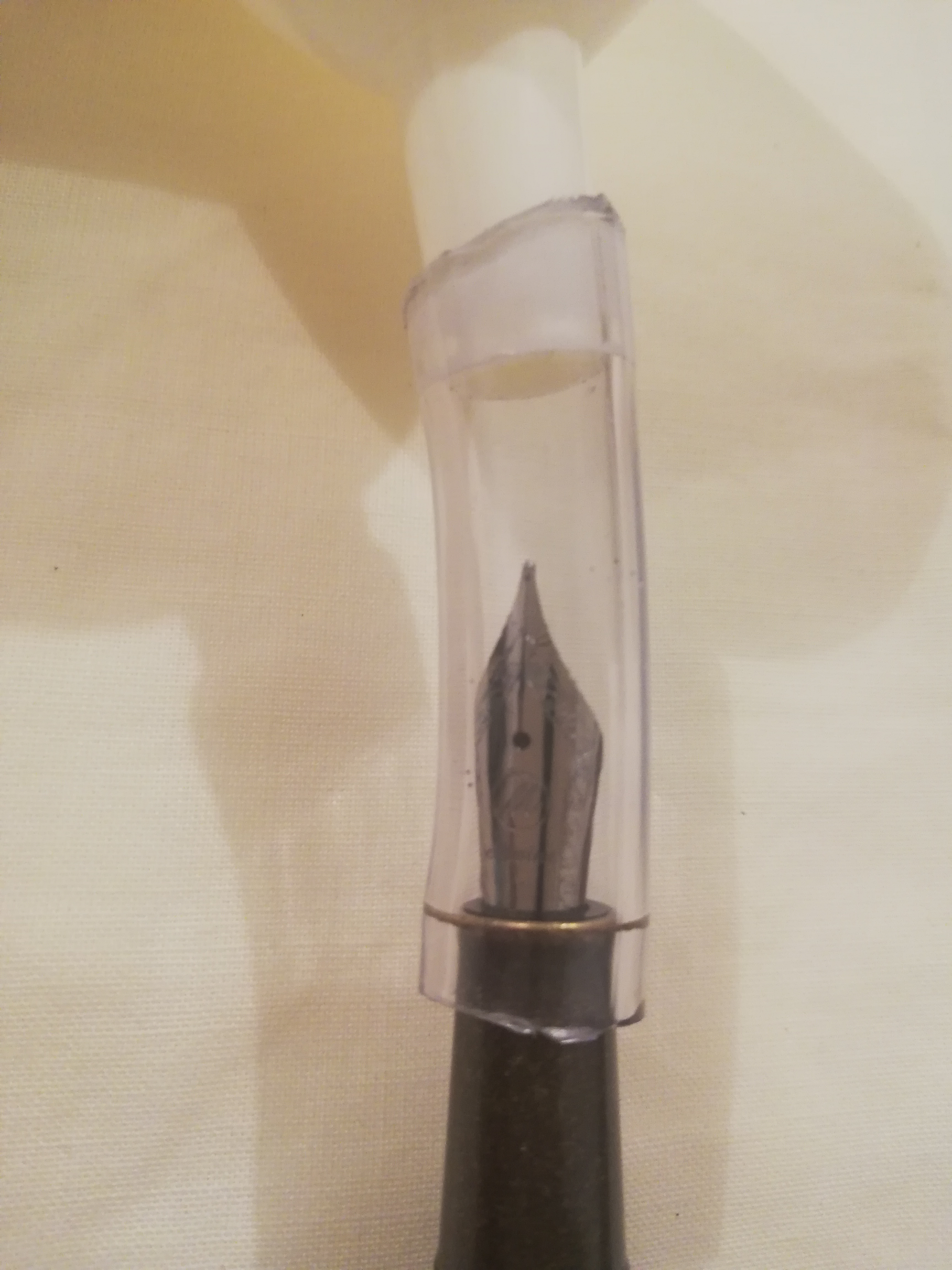La razionalità imporrebbe tutta una serie di operazioni razionali perfettamente utili e sensate, ma sappiamo che le passioni sono spesso irrazionali e costringono, ad esempio, a voler usare proprio quella penna a pistone proprio con quell'inchiostro in quella boccetta che sta per finire: per anni ho utilizzato una vecchia siringa sufficientemente larga da permettermi di far pescare la penna al suo interno, una volta chiusa con la protezione per l'ago e tolto il suo pistone. Purtroppo qualcuno deve averla buttata e mi sa che piuttosto che trovarne un'altra adatta allo scopo sia più semplice usare alla bisogna un calamaio da viaggio.