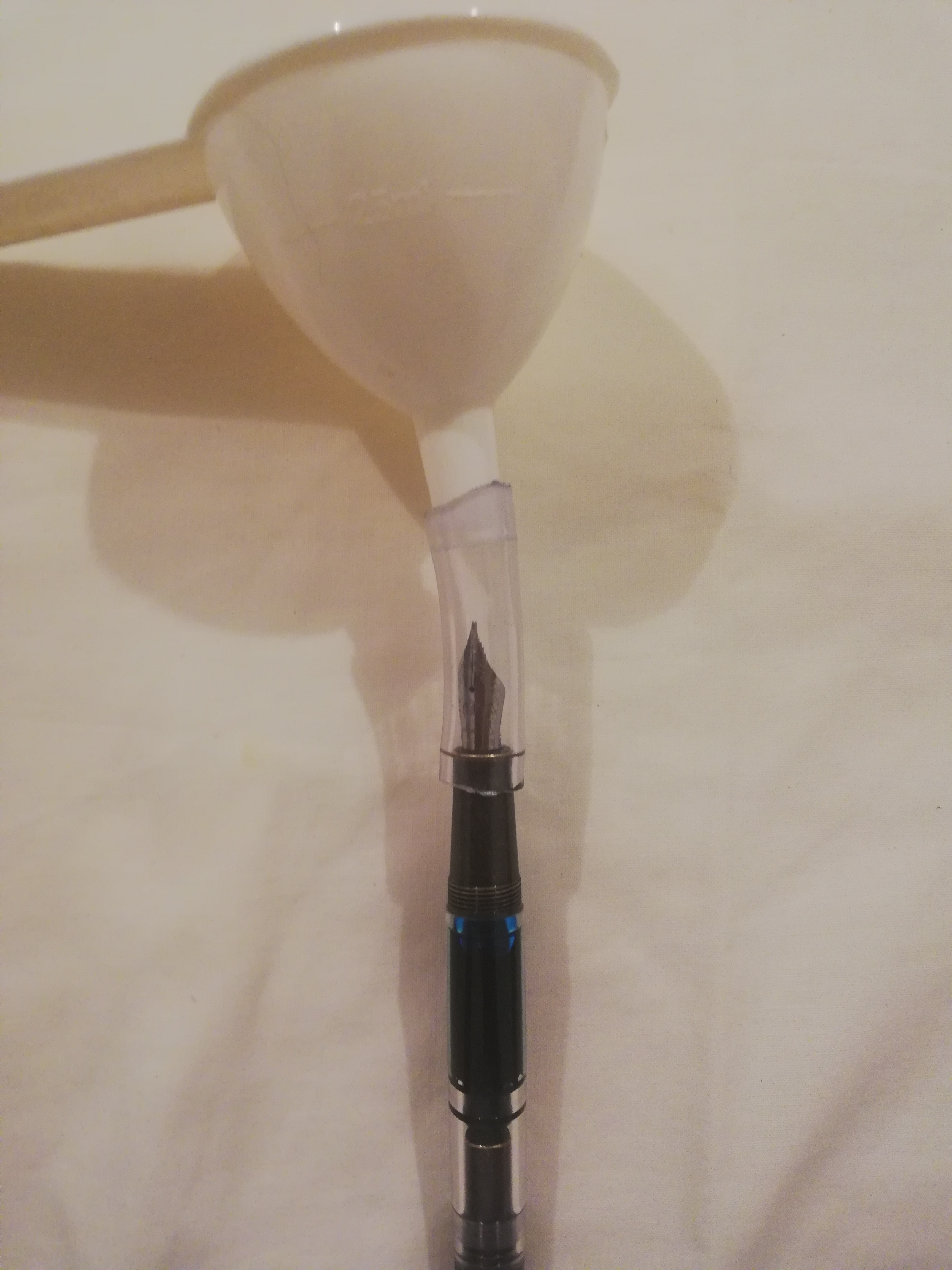 Il tubo aderisce perfettamente al bordo svasato della sezione e non ci sono perdite. l'inchiostro, versato dall'imbuto, va a fermarsi proprio a livello del foro di aspirazione. Più facile a farsi che a dirsi comunque.