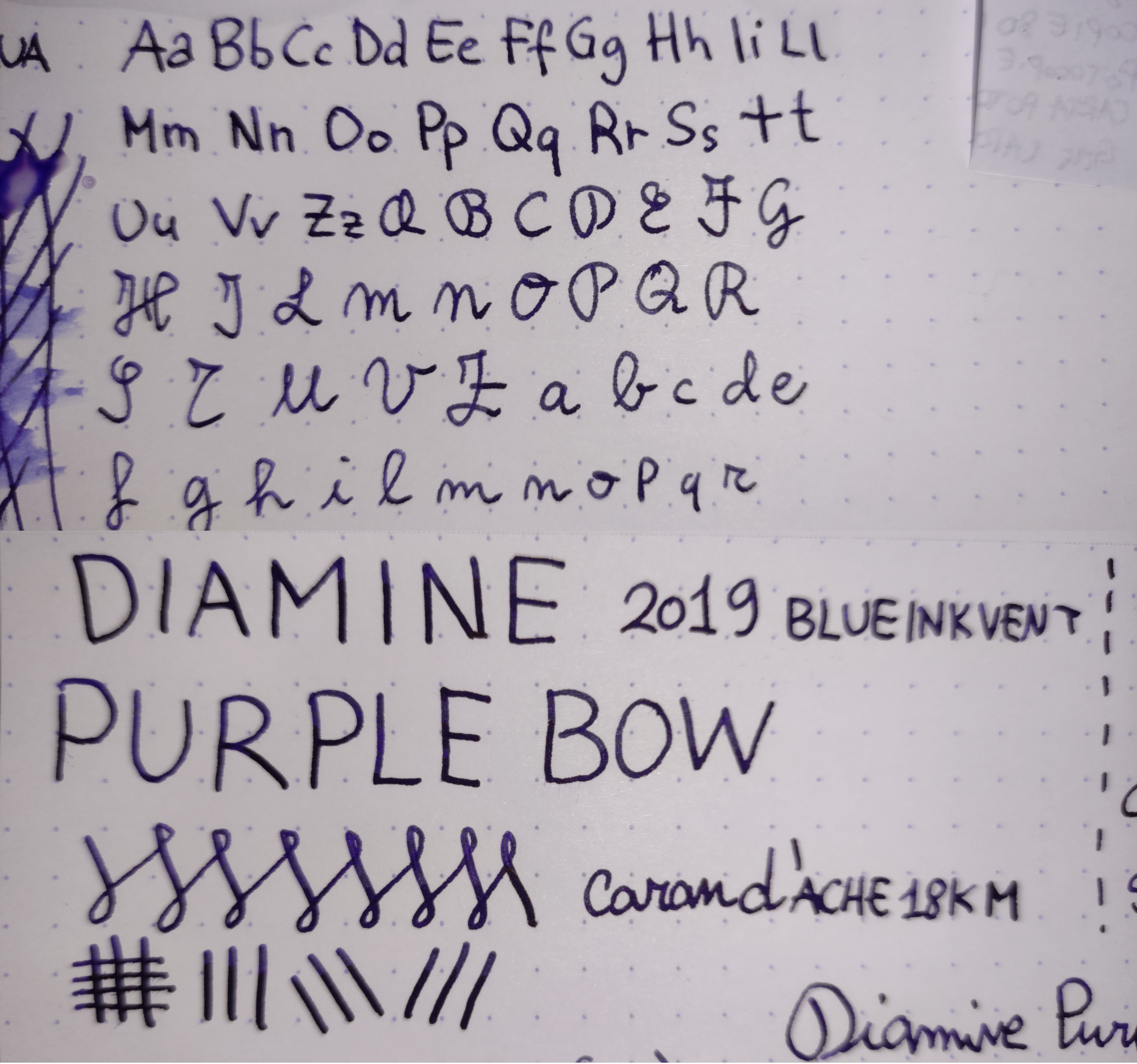 Inoltre pare essere uno degli inchiostri viola più performanti sulla carta da fotocopie, in quando neanche con un pennino molto abbondante come la M sembra aver creato grossi sanguinamenti sulla carta.