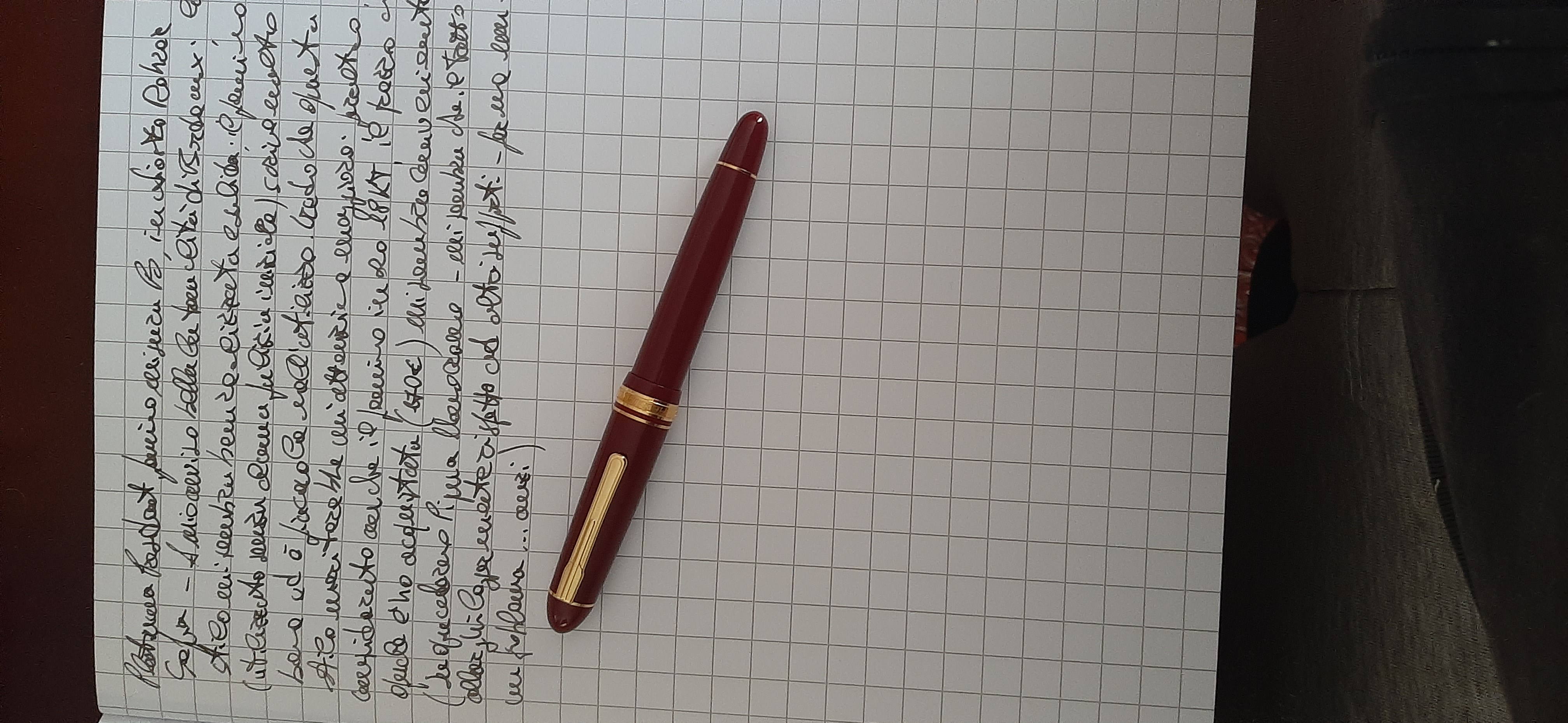 Arrivata! Prima impressione positiva, bella tonalita' di bordeaux, pennino scorrevole che scrive tranquillamente con il solo peso della stilo, caricata con Rohrer Sepia....la provo un po' e vi aggiorno ...