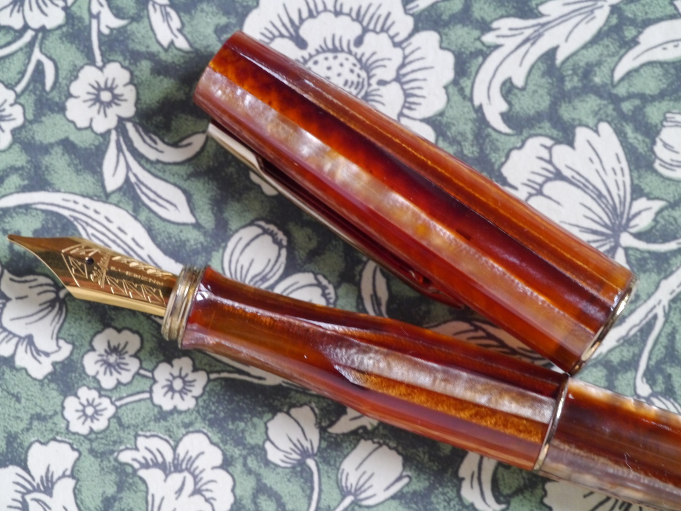 bella penna, non riesco a non continuare ad ammirare la profondità di queste resine. Qualche produttore (di resine) ad un certo punto è riuscito nell'impresa di creare una resina che come effetto di luci risultasse piuttosto simile alla celluoide. La celluloide in genere ti sorprende per la profondità dei colori che sembrano affondare nell'interno della penna (perché evidentemente è la luce che riesce a filtrare dentro e a creare i riflessi). inizialmente sono uscite le versioni striate di queste resine, ricordo tra le prime viste che mi avevano colpito, le resine delle Stipula Duetto.