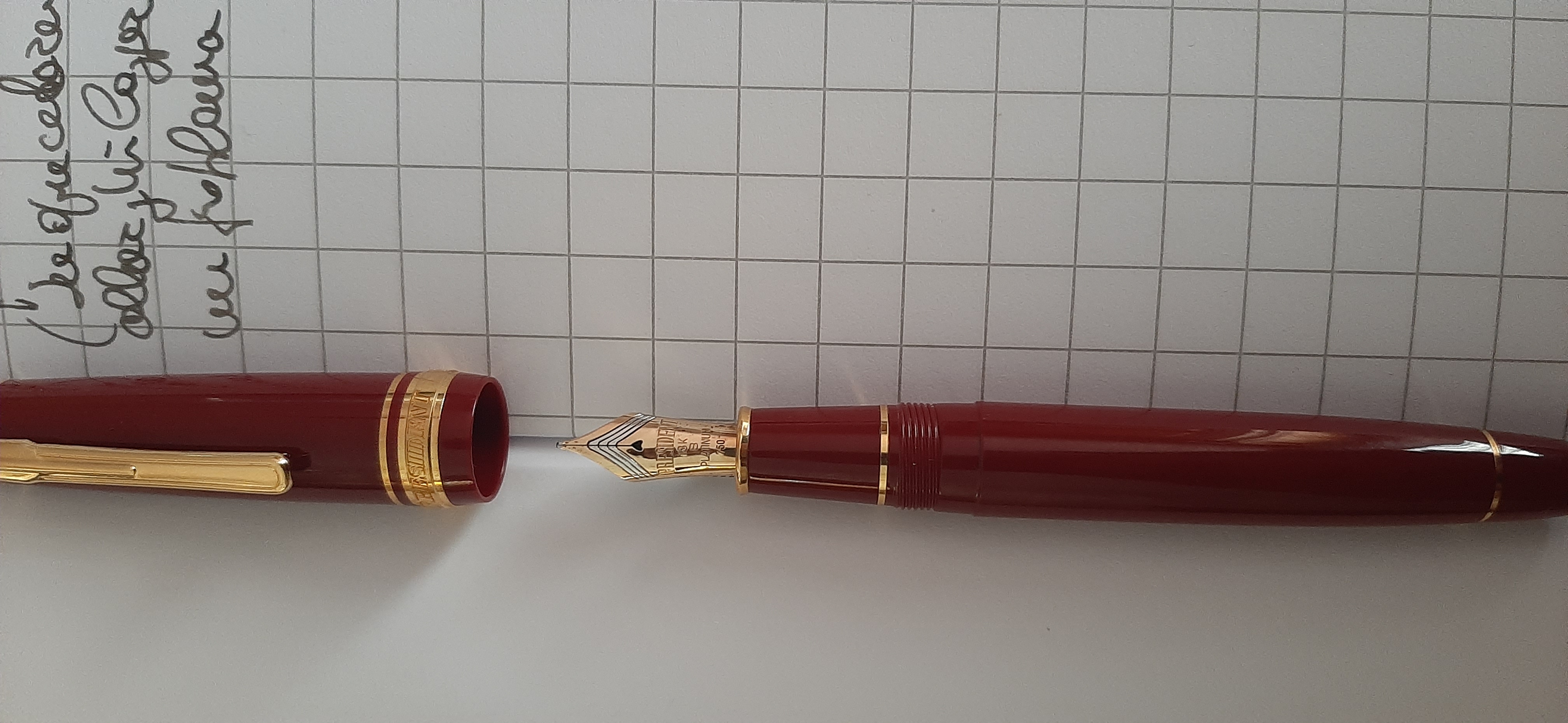 Arrivata! Prima impressione positiva, bella tonalita' di bordeaux, pennino scorrevole che scrive tranquillamente con il solo peso della stilo, caricata con Rohrer Sepia....la provo un po' e vi aggiorno ...