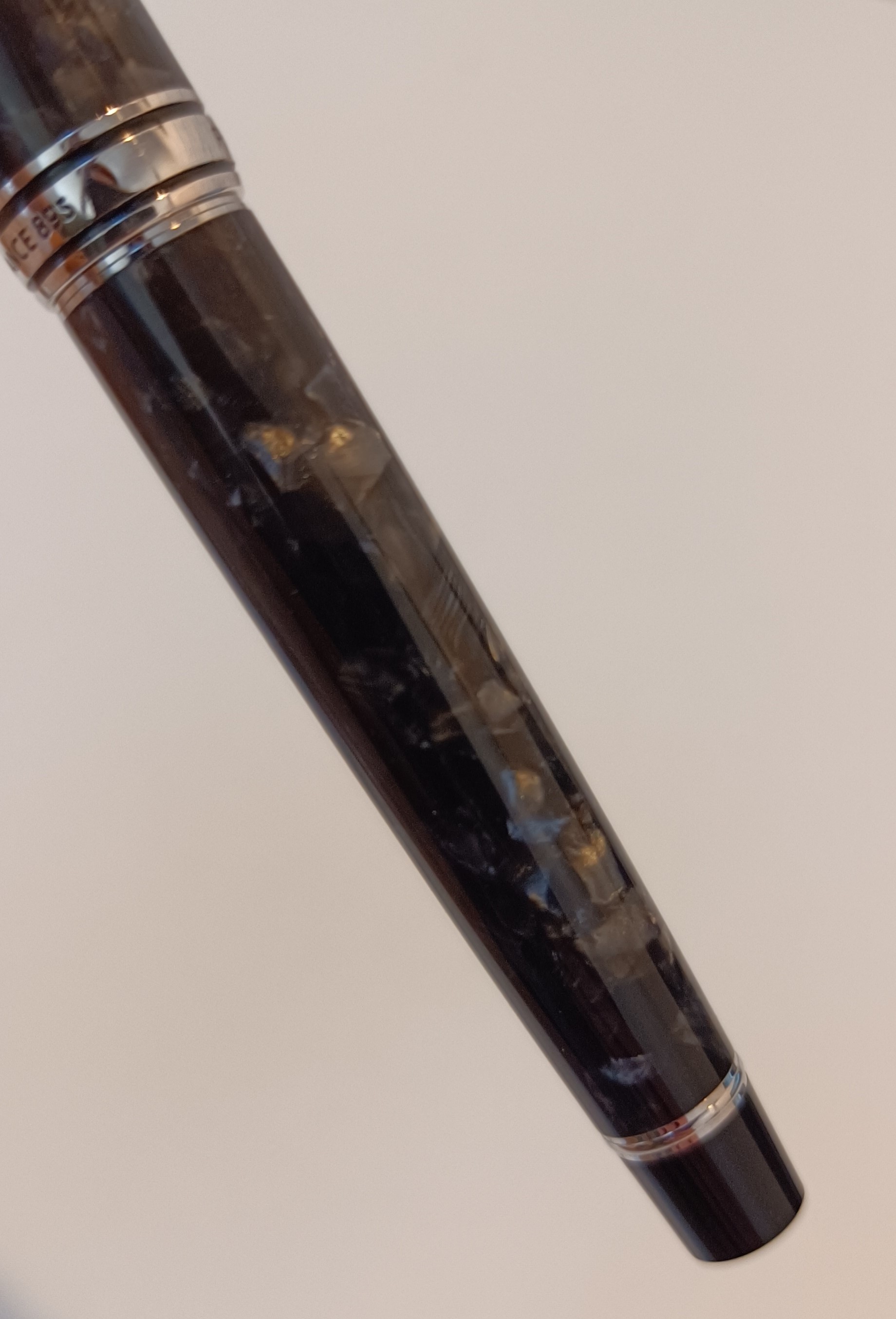 La cosa che più mi ha colpito e convinto ad acquistarla è stata la resina con cui è costruita; è un bel nero-grigio marmorizzato, molto sobrio ed elegante, che dà dei bei riflessi alla luce. Trovo anche eleganti le parti finali di corpo e cappuccio che terminano con due "tappi" in semplice resina nera.