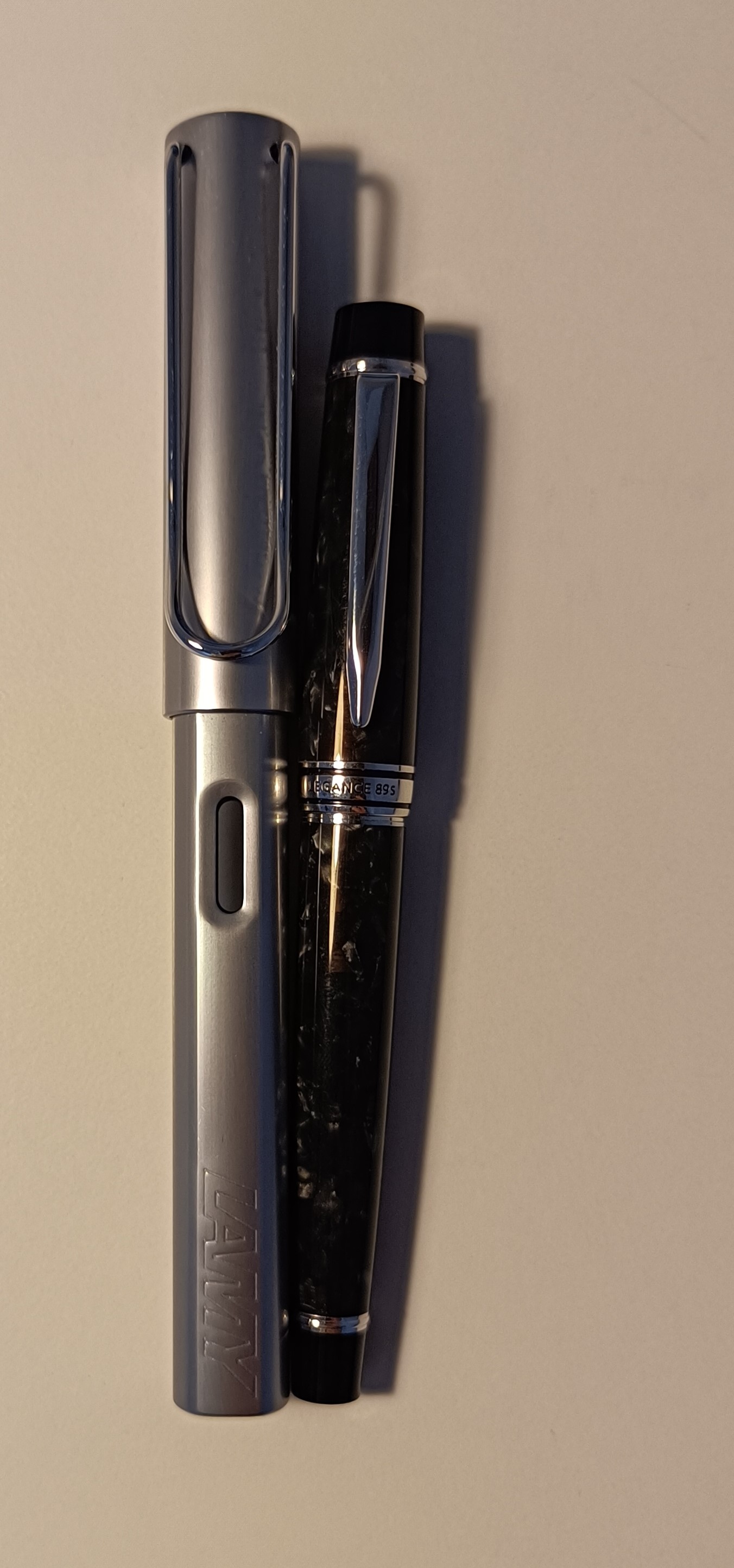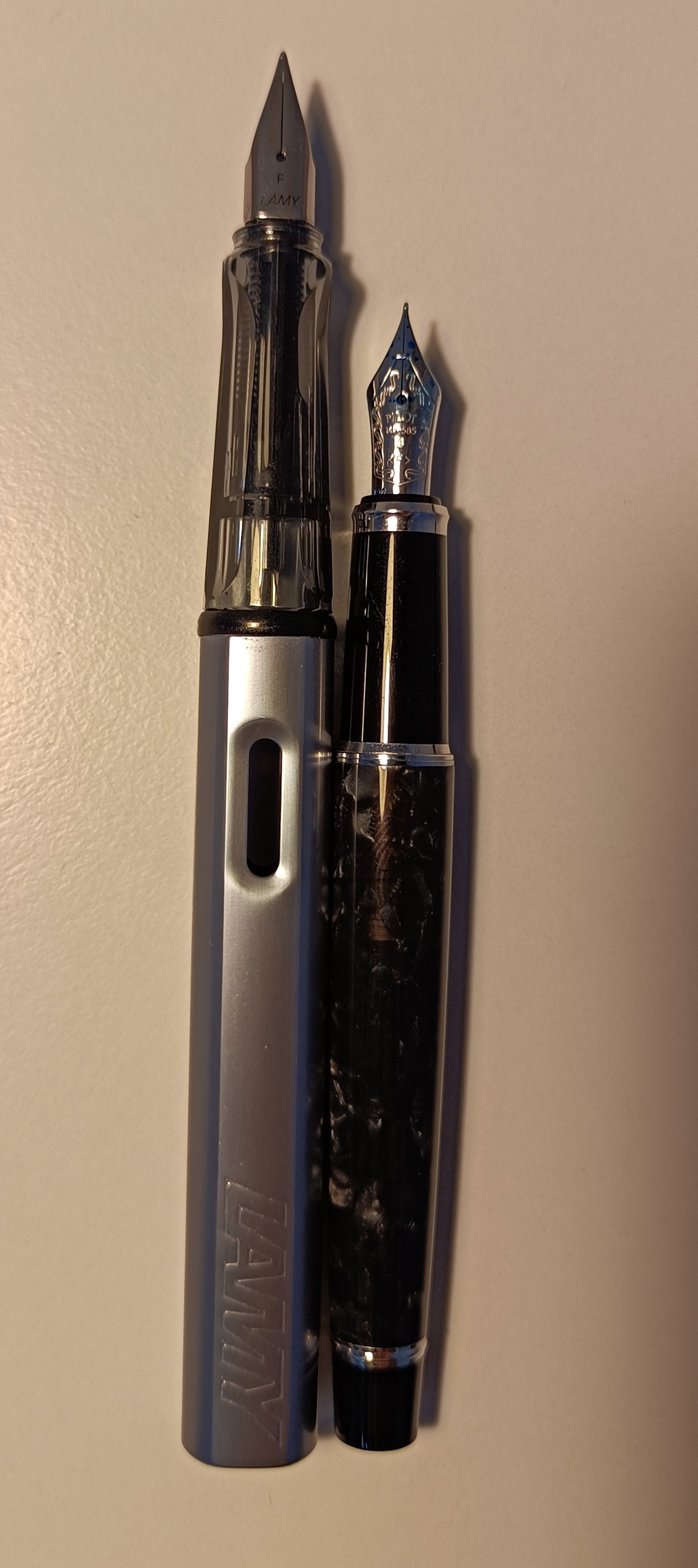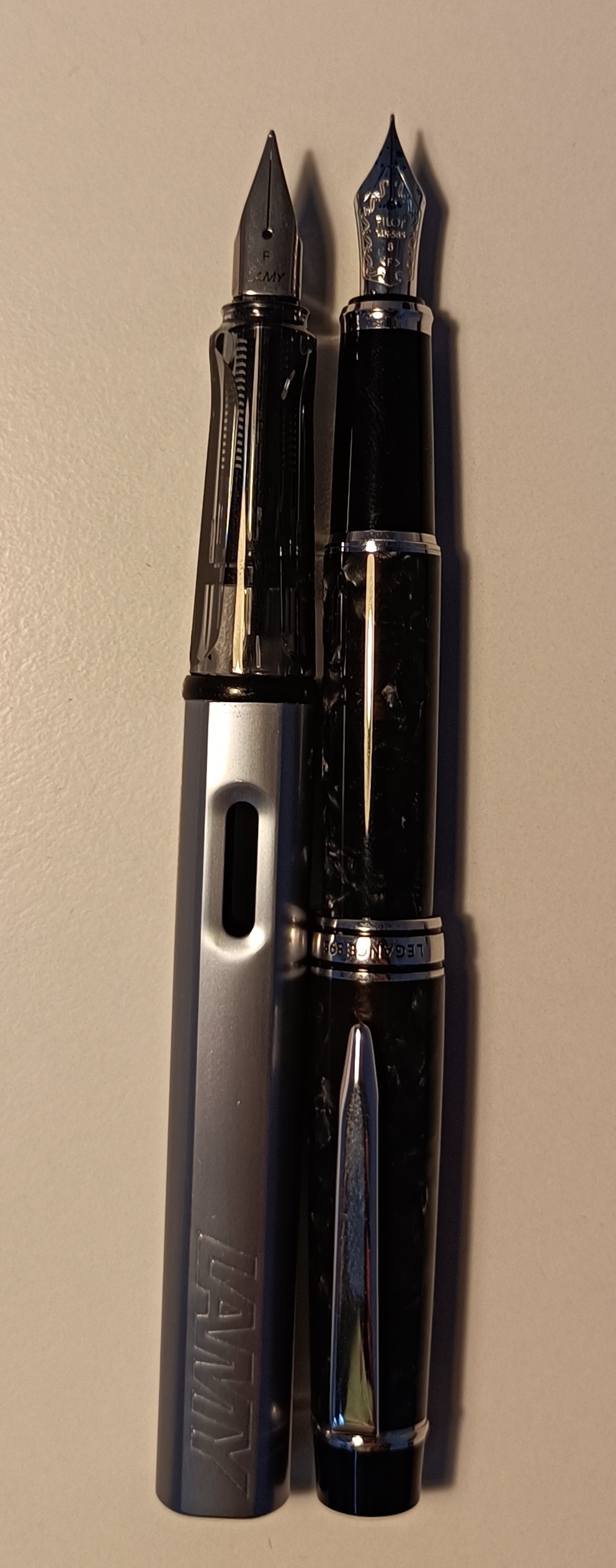La non trascurabile quantità di metallo fa sì che la Legance non sia una penna leggerissima a dispetto delle dimensioni: la trovo leggera al punto giusto, e se si vuole del peso in più si può calzare il cappuccio, cosa che tra l'altro la rende adatta anche a mani più grandi delle mie manine. Vi lascio delle immagini comparative con una Lamy Al-star per far capire meglio le dimensioni.