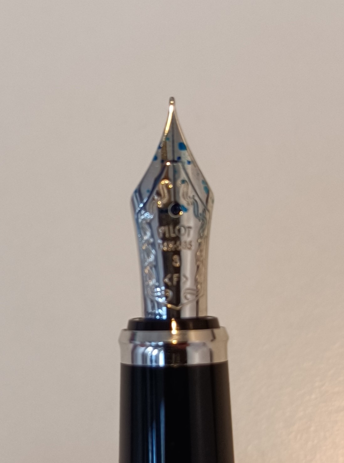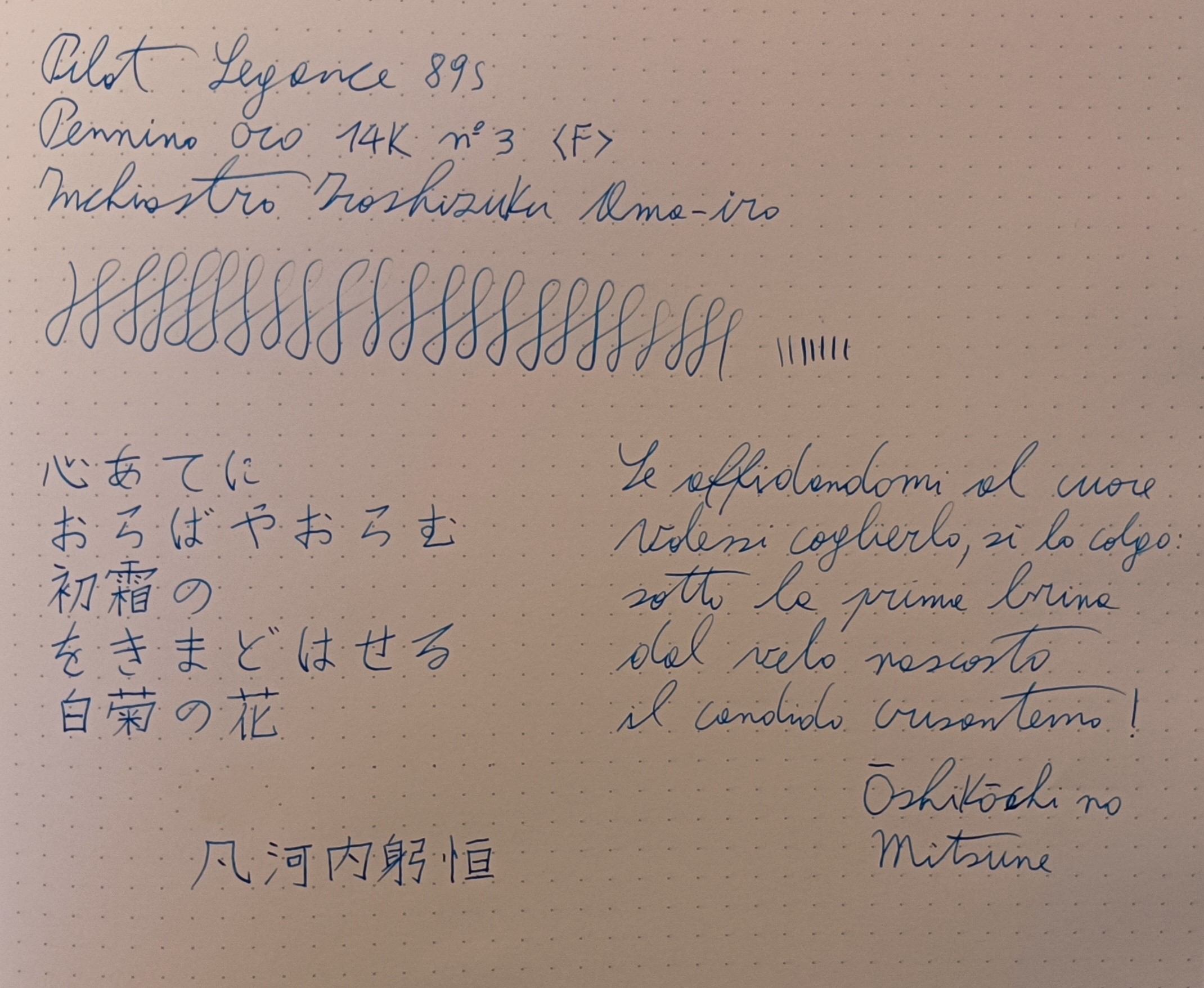 La qualità di scrittura è davvero ottima, tipicamente Pilot: il pennino in oro è del tipo della serie Custom, ma mentre quelle partono dal numero 5 come dimensione del pennino, quello della Legance è di numero 3, quindi è più piccolo di quello della Custom 74 o della Heritage 91. Si tratta di un tratto fine giapponese, quindi molto fine, e com'è tipico dei pennini in oro Pilot è morbido e scorrevole (ma non flessibile). A seconda del tipo di carta e di inchiostro si può avvertire un certo feedback. Trovo il flusso perfettamente adeguato.