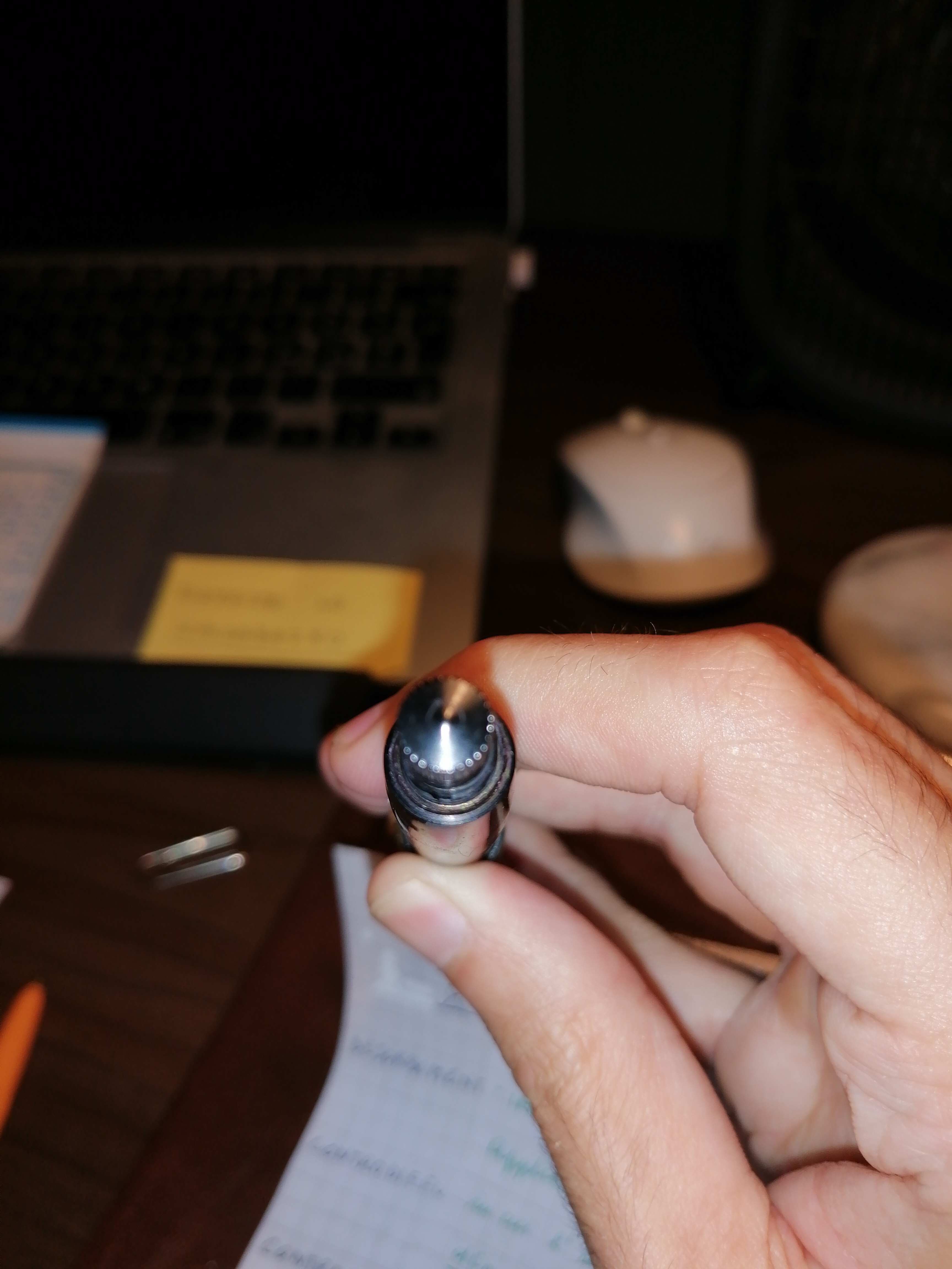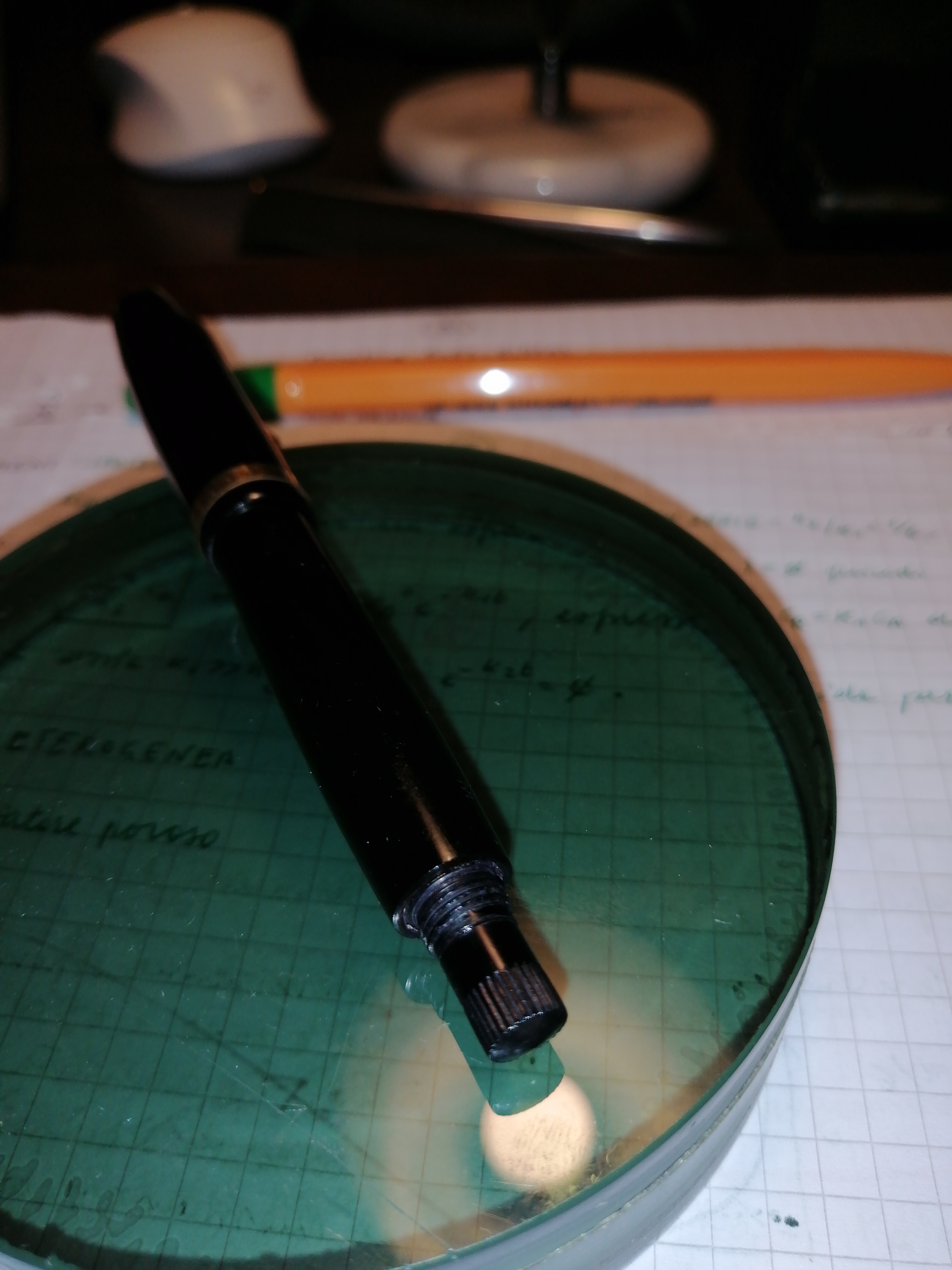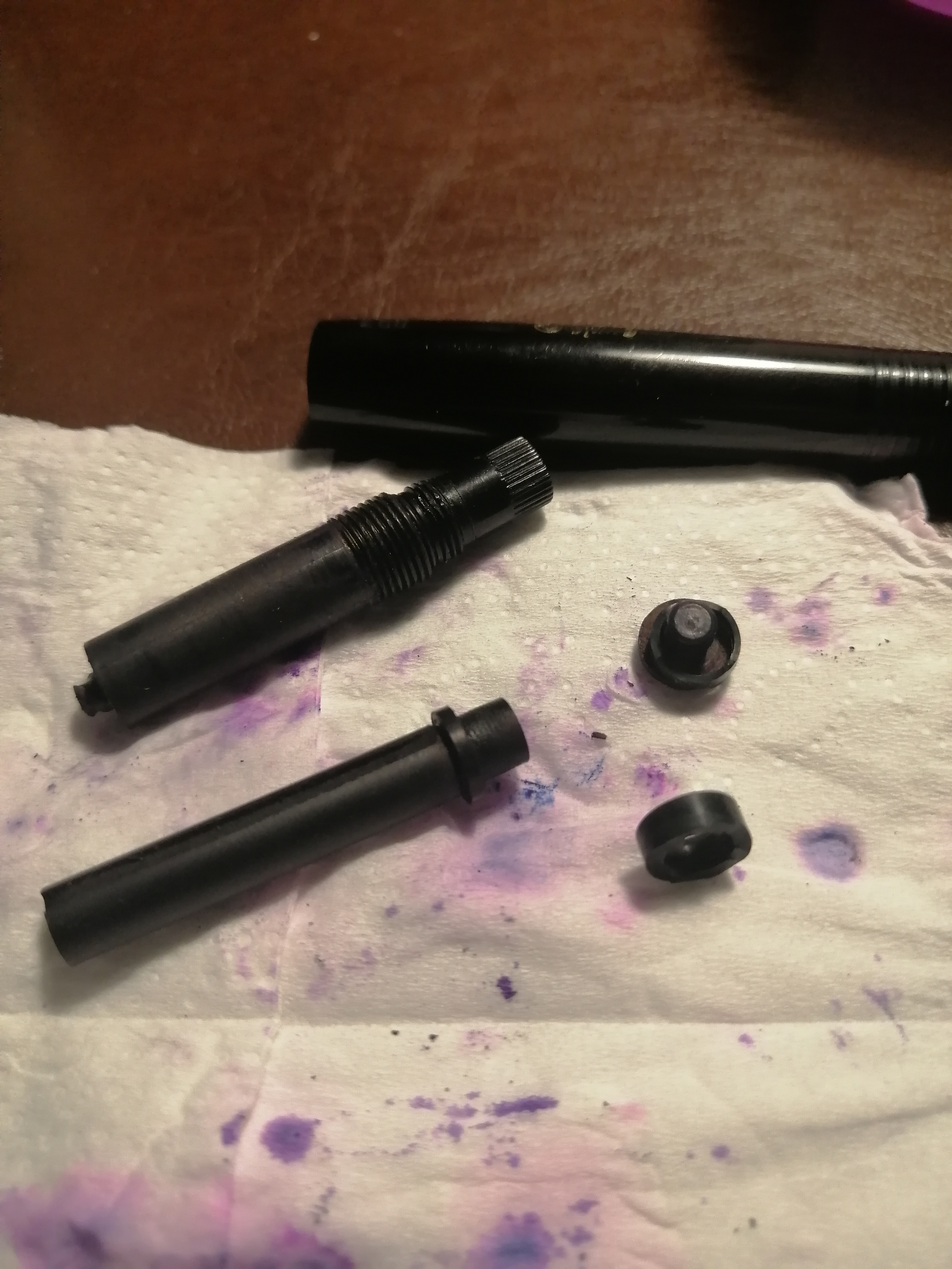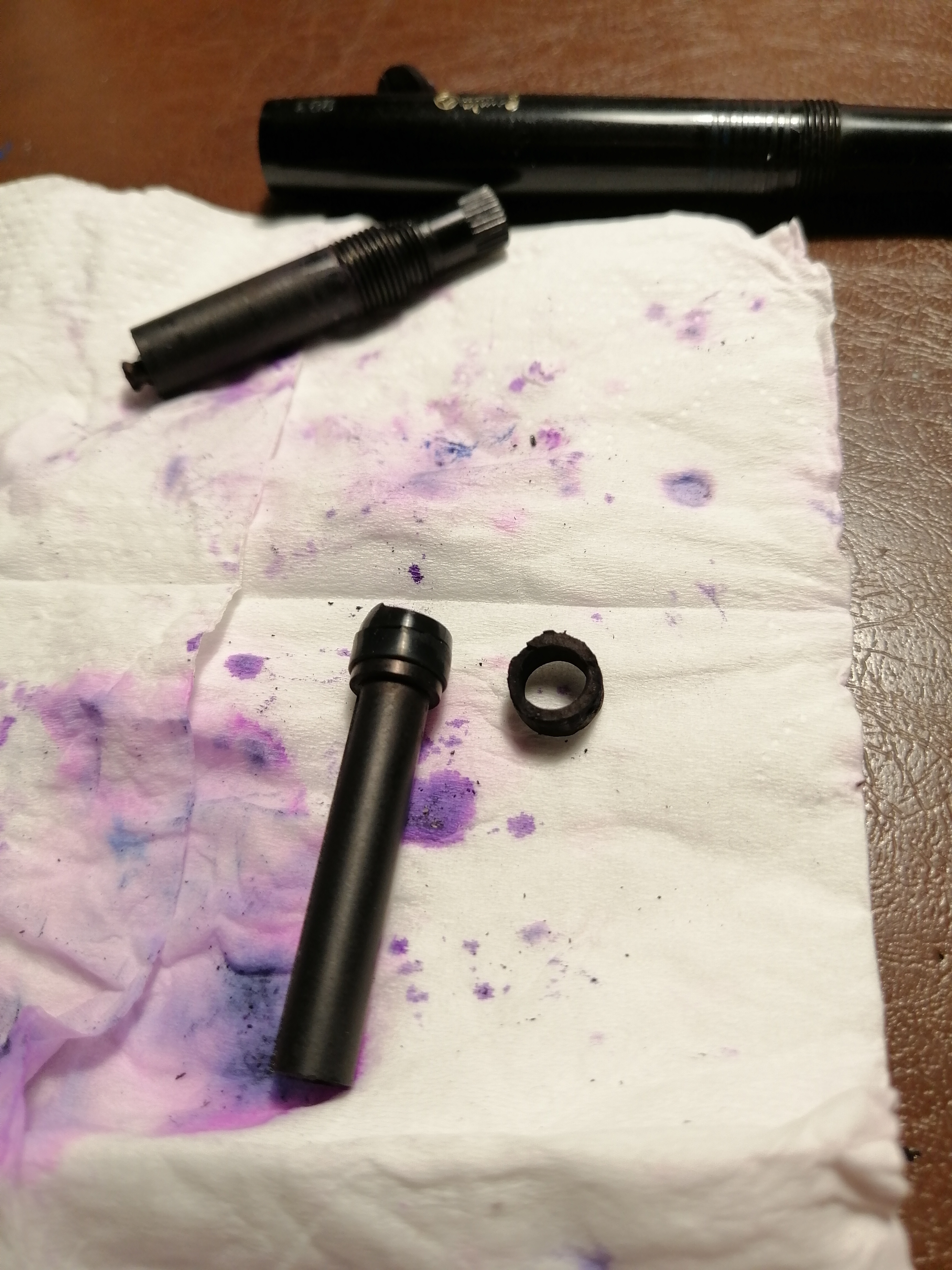 Buonasera cari amici delle stilografiche. Piccolo aggiornamento sullo smontaggio della mia bella Osmia: finalmente sono riuscito a svitare il gruppo pistone per sostituire la guarnizione! Fortunatamente non è servito nemmeno riscaldare la penna o tenerla a bagno in acqua e sapone. Vi allego qualche foto.