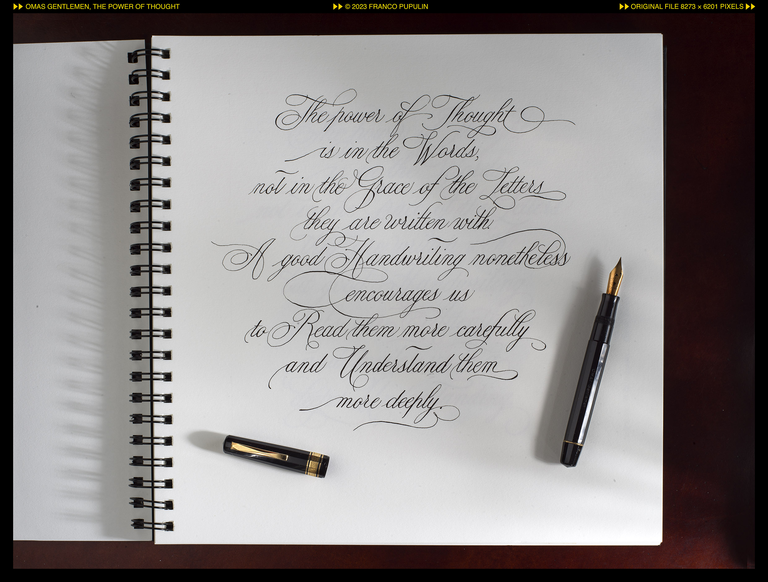 Ho provato il Drawing Book con una delle mie stilografiche ”fuoriserie” per uso calligrafico, una Omas Gentlemen (si noti, con due “e”), databile circa al 1967, una penna in celluloide nera con un fantastico pennino Omas Extra (non del tipo Lucens).