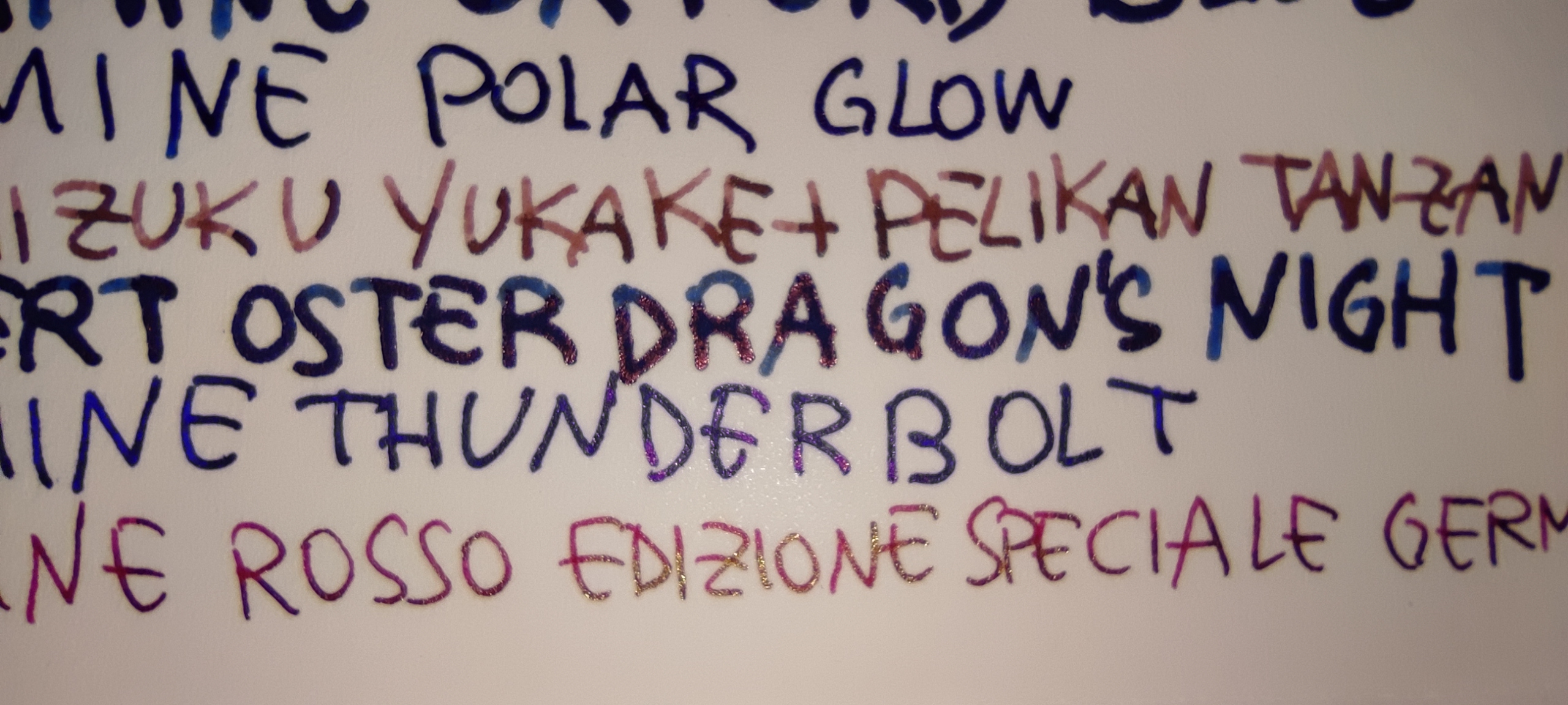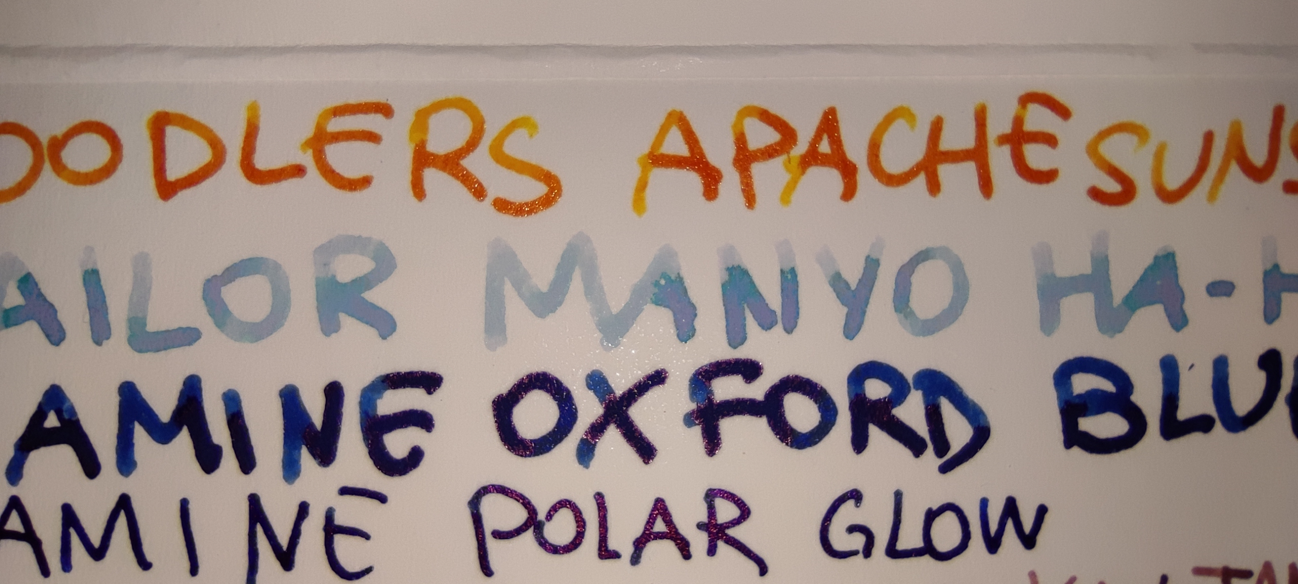 Tranne per il polar glow e il rosso diamine Ortloffs Kölsche Tinte , nessun'altra di questi inchiostri ha caratteristiche sheen di fabbrica.