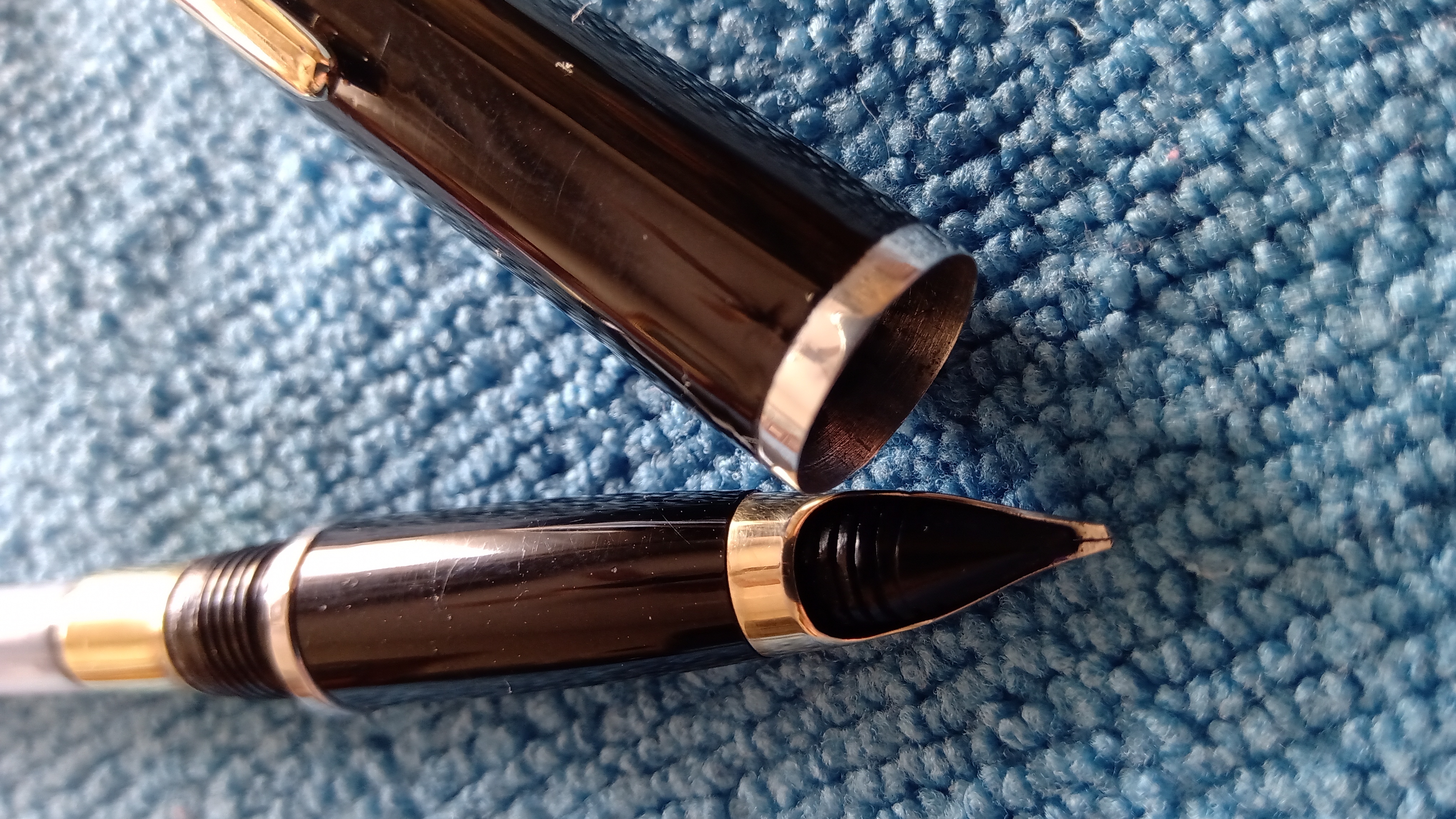 Si tratta di una Sheaffer's degli anni 60/70 quasi interamente prodotta in Argentina, e dico Sheaffer's e non Sheaffer, Imperial 777, Stylist Lifetime, con corpo, cappuccio e clip placcati oro incisi, con sistema di conversione aerometrica originale, impugnatura in acrilico nera, e un magnifico pennino corto conico originale, in argento palladio prodotto negli Stati Uniti, che ad un certo punto gli ho presentato nel forum e che scrive meravigliosamente...!!!