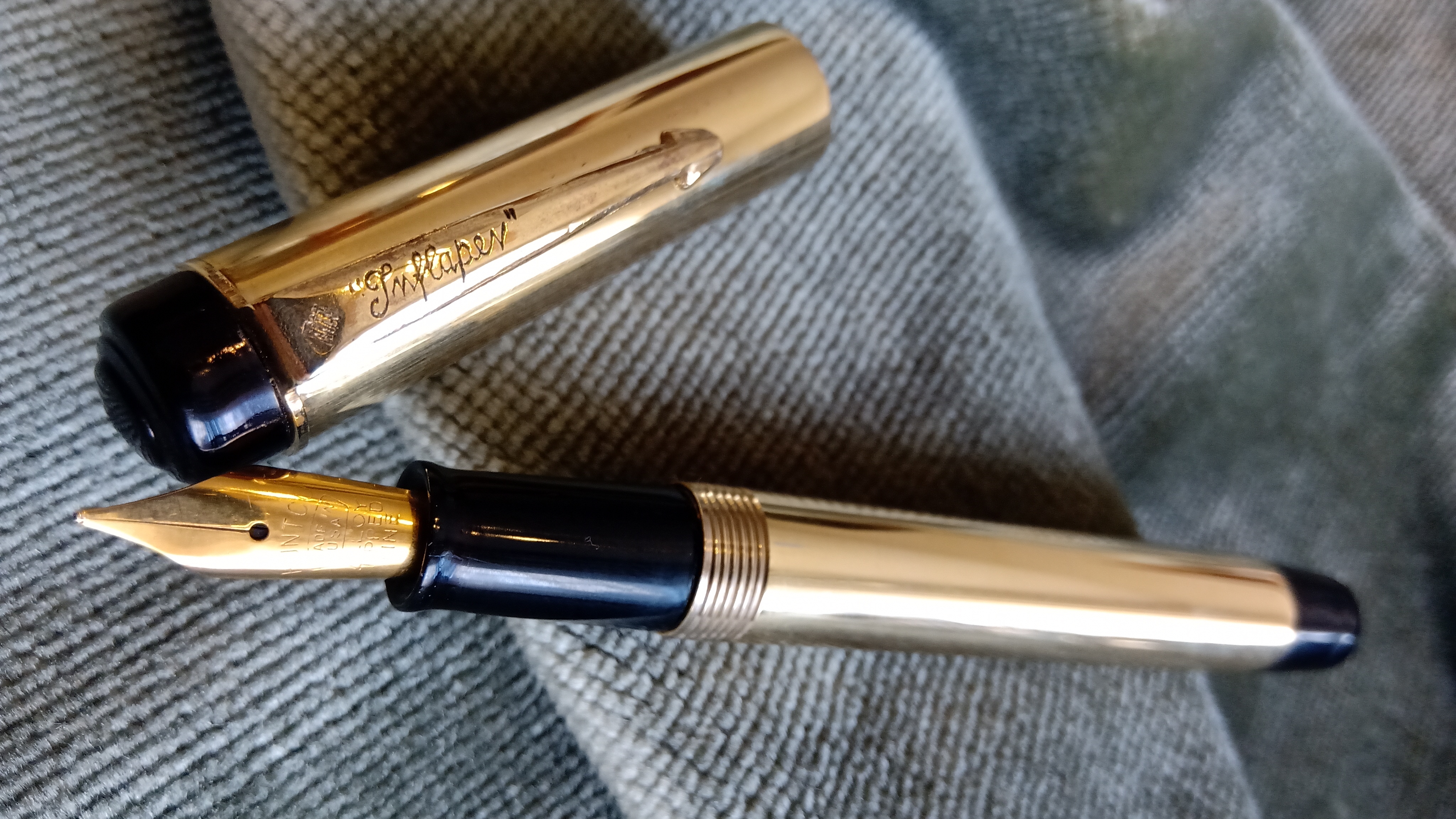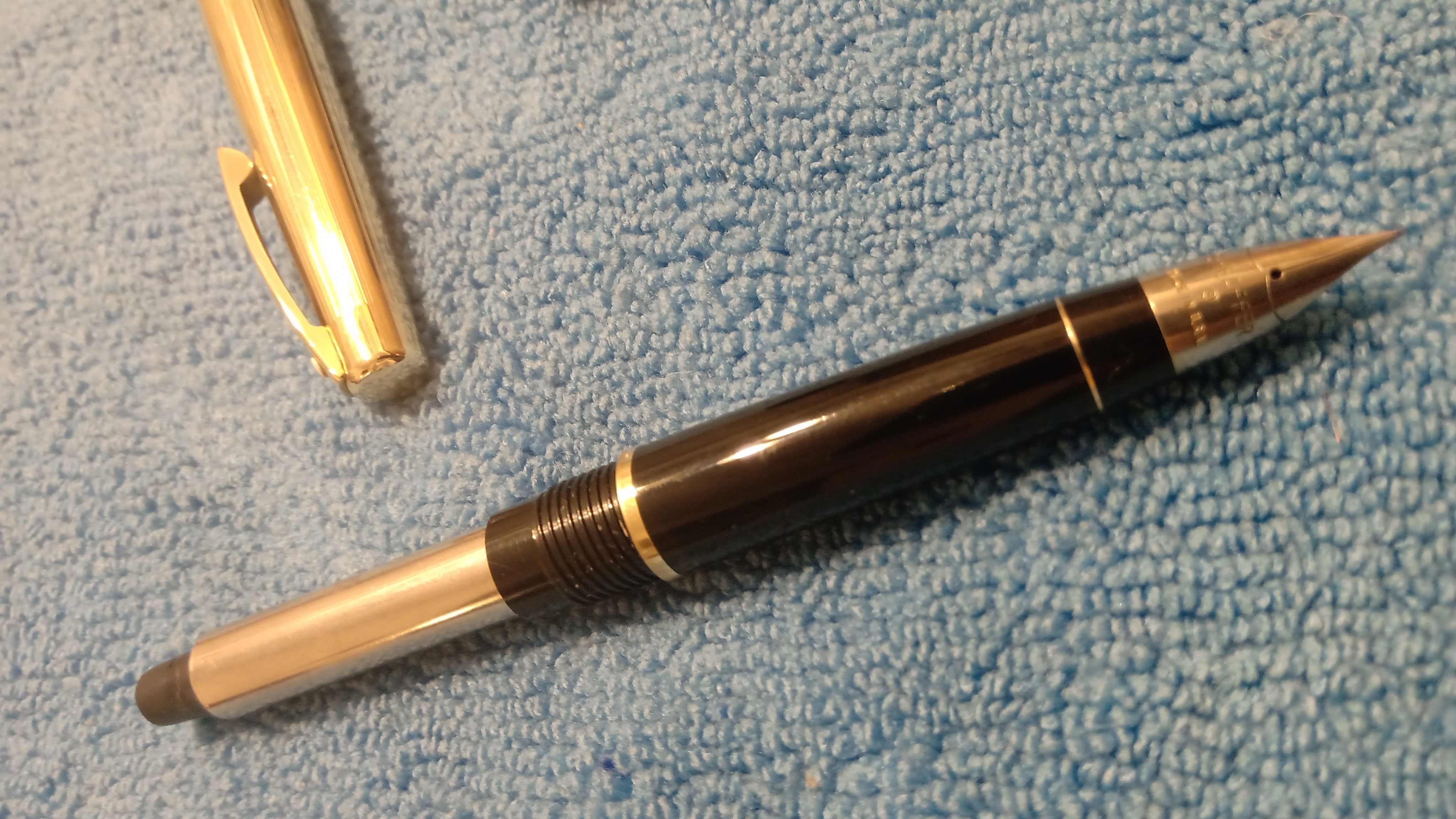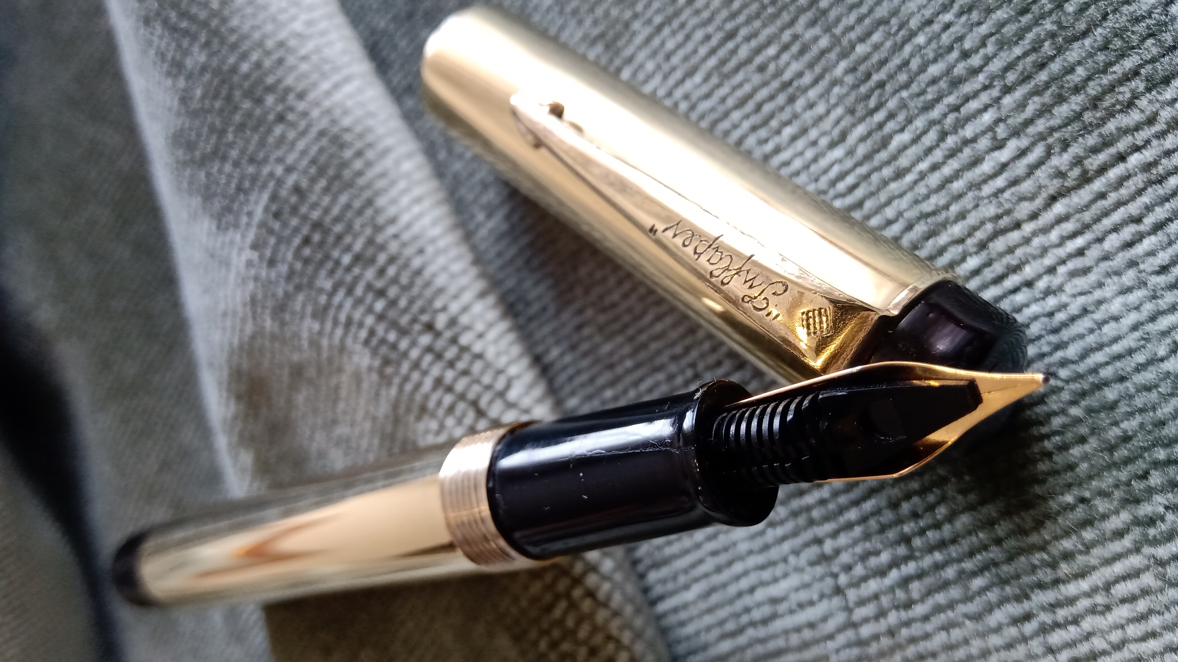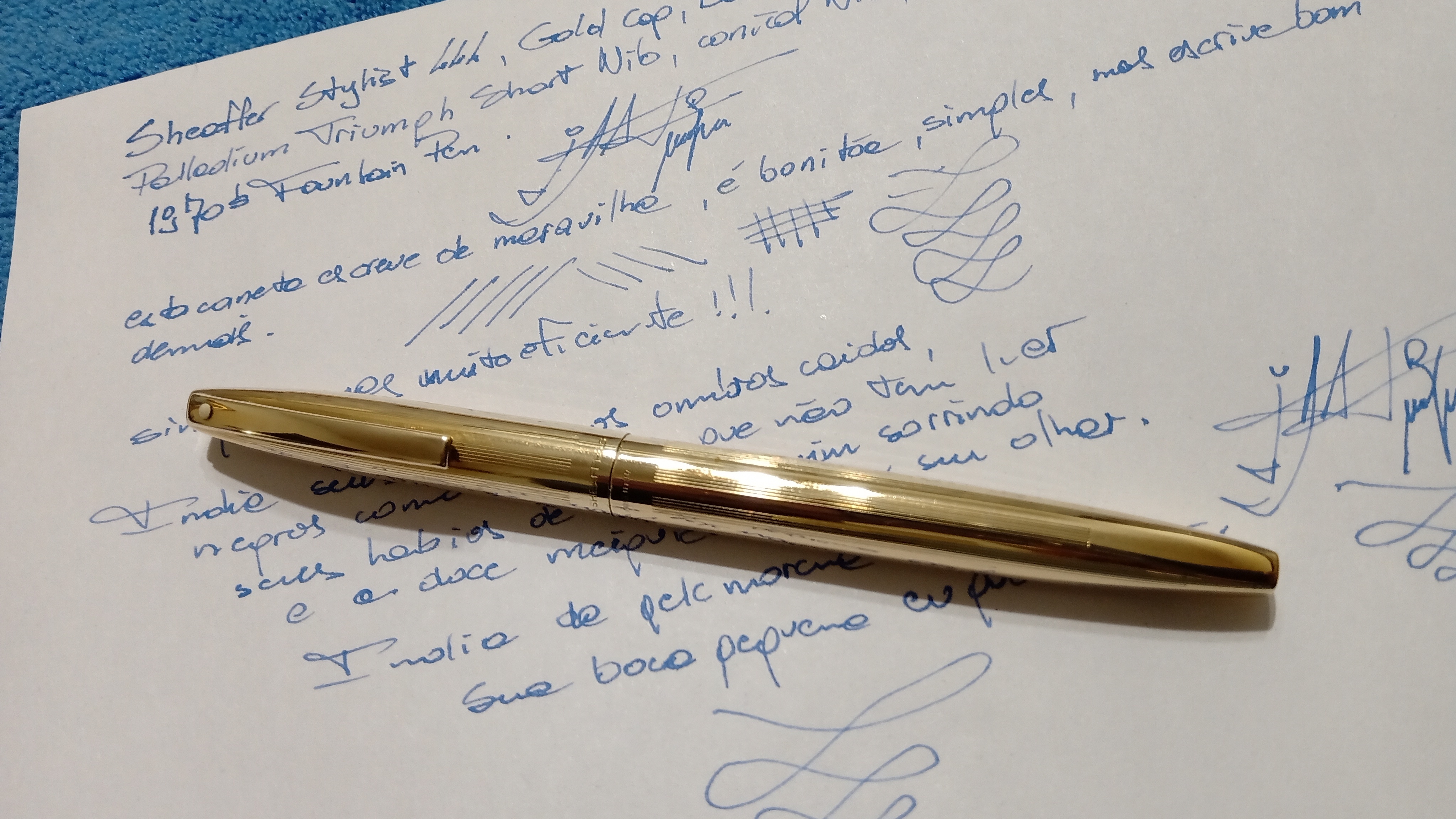 Si tratta di una Sheaffer's degli anni 60/70 quasi interamente prodotta in Argentina, e dico Sheaffer's e non Sheaffer, Imperial 777, Stylist Lifetime, con corpo, cappuccio e clip placcati oro incisi, con sistema di conversione aerometrica originale, impugnatura in acrilico nera, e un magnifico pennino corto conico originale, in argento palladio prodotto negli Stati Uniti, che ad un certo punto gli ho presentato nel forum e che scrive meravigliosamente...!!!